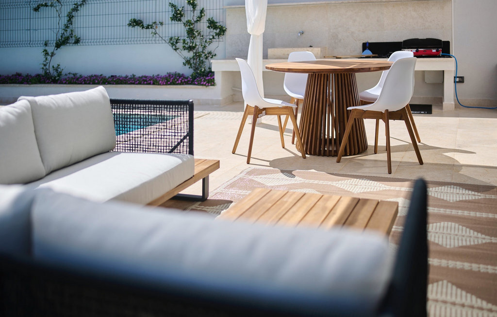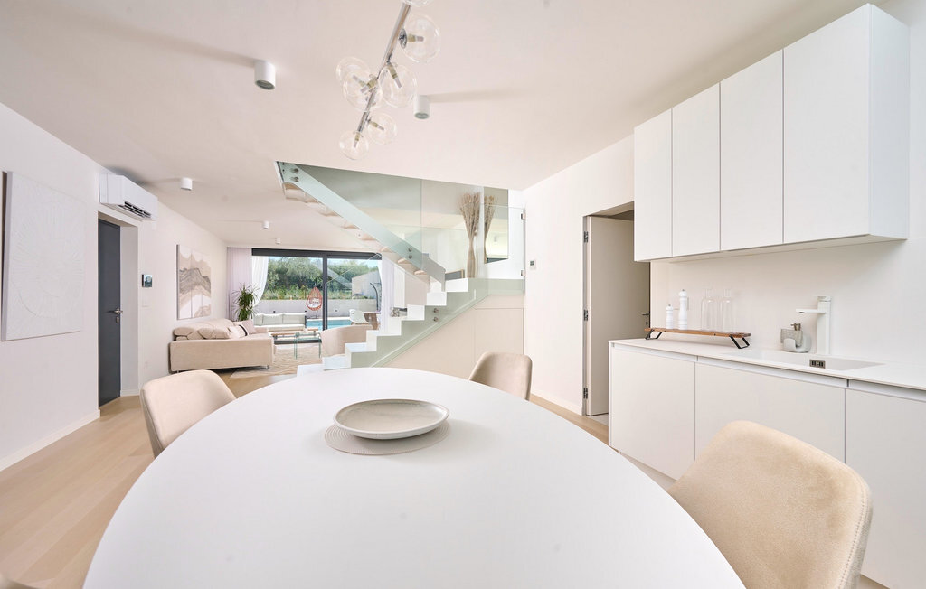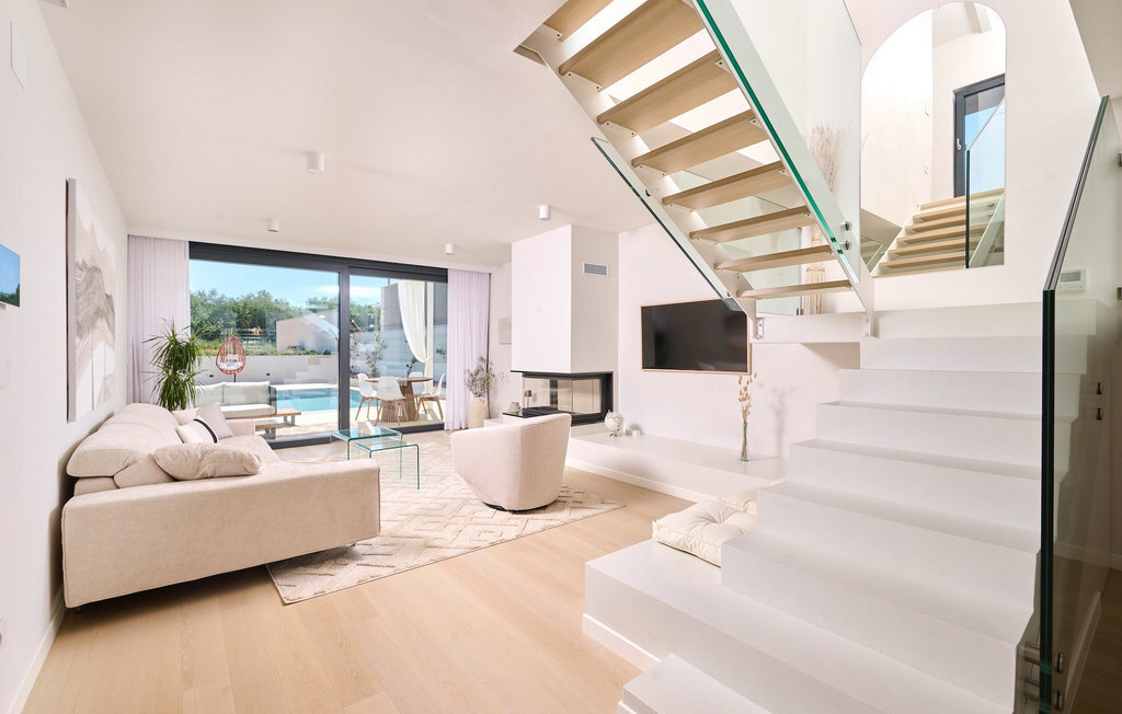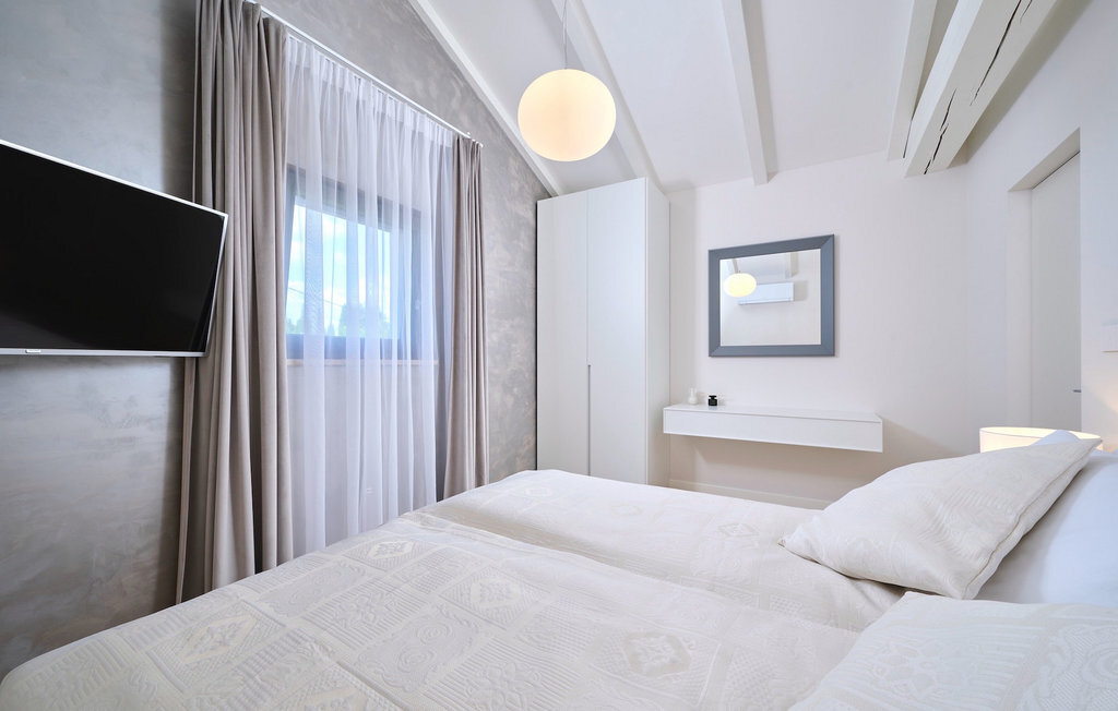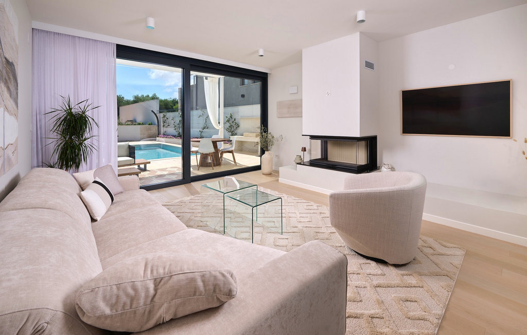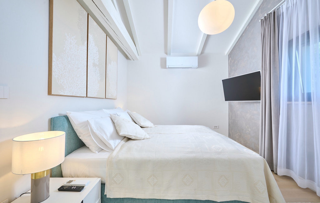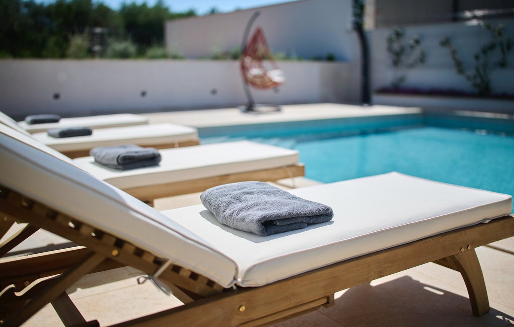 Les deux chambres se trouvent au premier étage. Les chambres sont modernes et confortables. Les deux chambres disposent d'une télévision et sont climatisées. La chambre principale offre un lit double, tandis que la deuxième chambre offre un lit double qui peut être divisé en deux lits simples. Au même étage se trouve également une salle de bain. Au rez-de-chaussée de la villa, vous trouverez un salon lumineux et moderne avec une cheminée et une télévision, ainsi qu'un coin repas et une cuisine entièrement équipée reliés dans un concept d'open space. Il y a également une autre salle de bain à l'étage. Cet espace est climatisé et idéal pour vos vacances. Le jardin de la villa offre différents endroits pour se détendre. En premier lieu, il y a une piscine privée avec des chaises longues. Pour faire une pause après un bain de soleil ou une baignade, vous pouvez profiter de la partie ombragée de la terrasse avec un coin détente juste à côté de la maison. Dans le jardin, vous trouverez également un coin repas ombragé avec une table à manger ainsi qu'un barbecue où vous pourrez exercer vos talents de cuisinier.