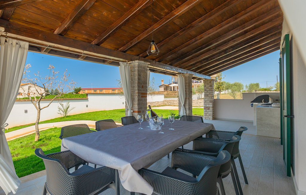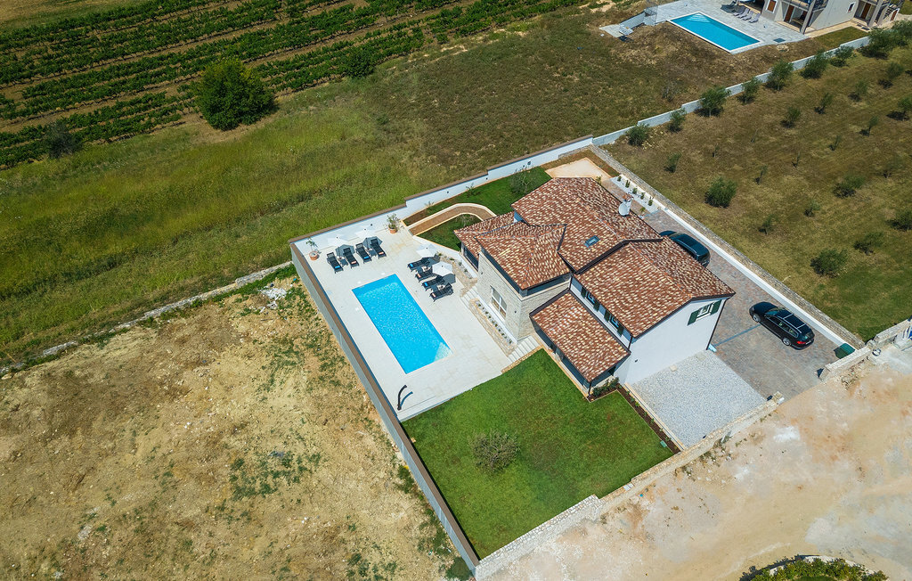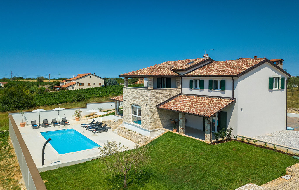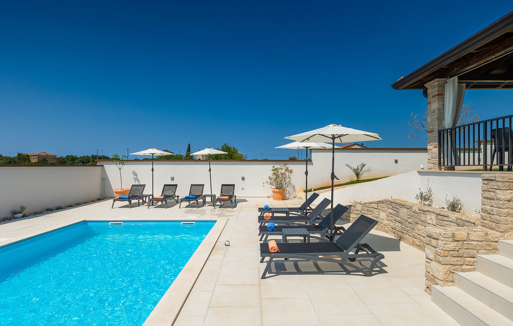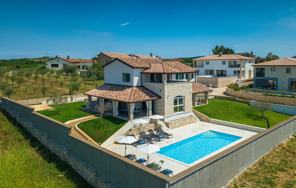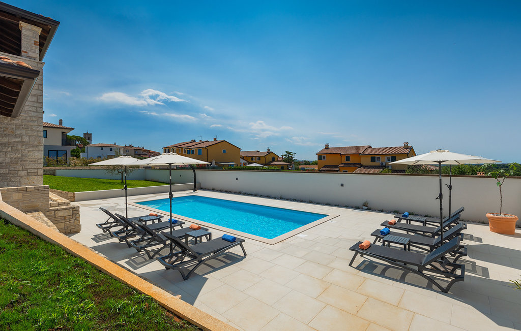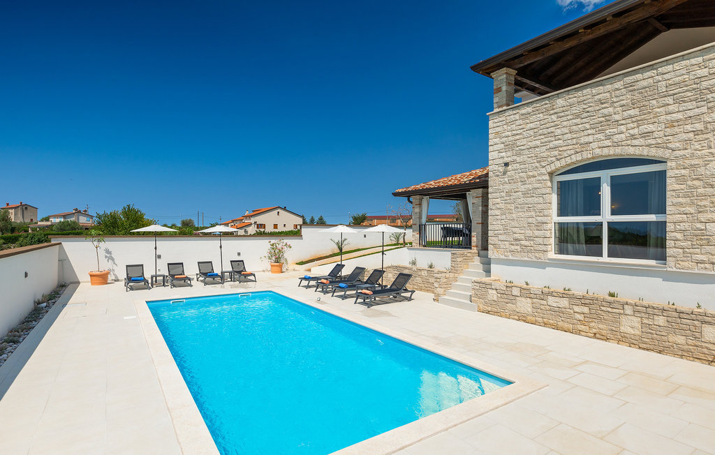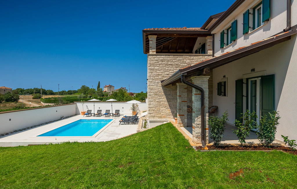 La magnifique villa Victoria Brtonigla est une véritable oasis où vous trouverez calme et détente, loin du stress de la vie quotidienne. La piscine rafraîchissante de 40m2 attirera votre attention dès votre arrivée à la villa. Il vous sera difficile de résister à l'envie de plonger dans l'eau fraîche. La piscine est entourée de chaises longues confortables sur lesquelles vous pourrez profiter du soleil d'Istrie tout en regardant les enfants jouer dans le jardin ou en feuilletant votre magazine préféré. À l'extérieur de la maison, chacun trouvera sa place préférée. La terrasse couverte avec cuisine d'été et grande table à manger sera probablement l'endroit où vous planifierez vos excursions dans la région en mangeant des plats fraîchement préparés au barbecue. De la terrasse, vous accédez directement à l'espace de vie ouvert et climatisé comprenant un salon, une salle à manger et une cuisine entièrement équipée. Une des chambres à coucher se trouve également au rez-de-chaussée. Cette chambre à coucher avec lit double dispose d'une salle de bain privée et d'un accès à sa propre petite terrasse. Des toilettes séparées pour les invités et une buanderie avec lave-linge et sèche-linge complètent ce niveau. À l'étage supérieur, trois autres chambres confortables promettent des nuits reposantes. L'une des chambres dispose de sa propre salle de bains, les deux autres chambres se partagent une salle de bains séparée. Une de ces chambres a deux lits simples, les autres chambres ont des lits doubles.