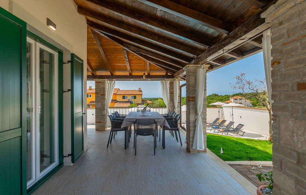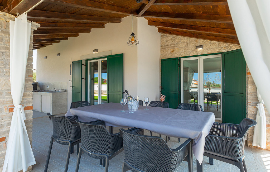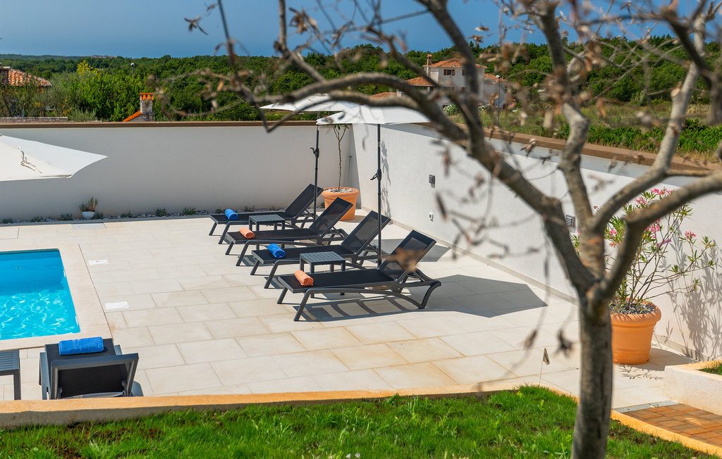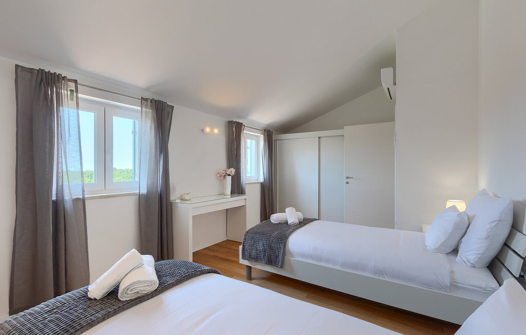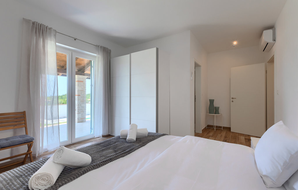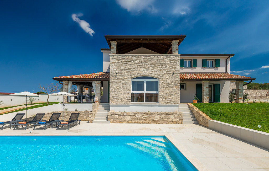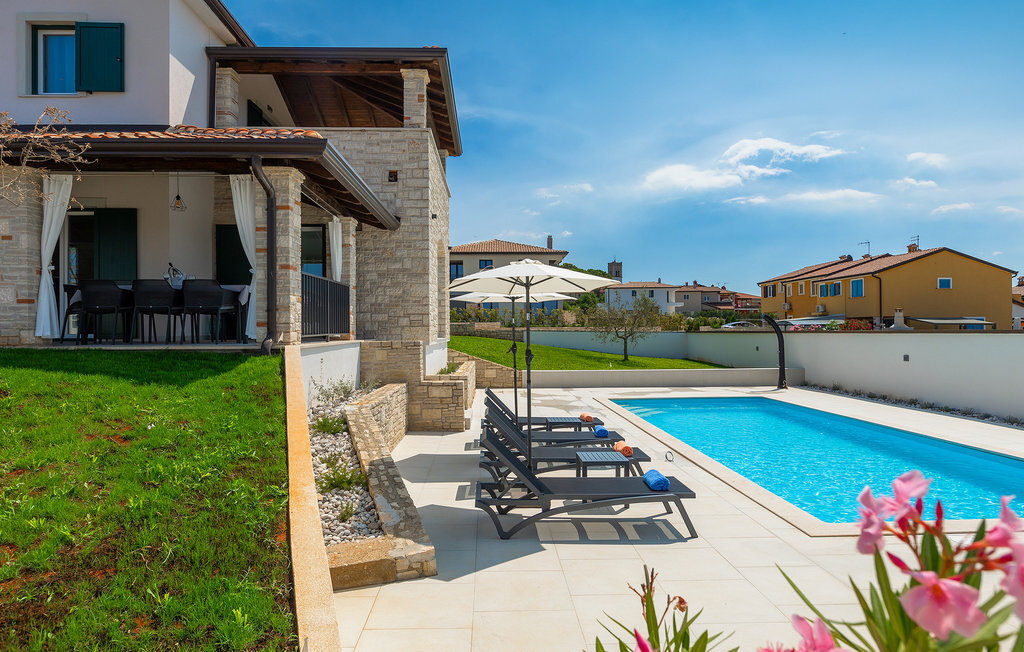 La magnifique villa Victoria Brtonigla est une véritable oasis où vous trouverez calme et détente, loin du stress de la vie quotidienne. La piscine rafraîchissante de 40m2 attirera votre attention dès votre arrivée à la villa. Il vous sera difficile de résister à l'envie de plonger dans l'eau fraîche. La piscine est entourée de chaises longues confortables sur lesquelles vous pourrez profiter du soleil d'Istrie tout en regardant les enfants jouer dans le jardin ou en feuilletant votre magazine préféré. À l'extérieur de la maison, chacun trouvera sa place préférée. La terrasse couverte avec cuisine d'été et grande table à manger sera probablement l'endroit où vous planifierez vos excursions dans la région en mangeant des plats fraîchement préparés au barbecue. De la terrasse, vous accédez directement à l'espace de vie ouvert et climatisé comprenant un salon, une salle à manger et une cuisine entièrement équipée. Une des chambres à coucher se trouve également au rez-de-chaussée. Cette chambre à coucher avec lit double dispose d'une salle de bain privée et d'un accès à sa propre petite terrasse. Des toilettes séparées pour les invités et une buanderie avec lave-linge et sèche-linge complètent ce niveau. À l'étage supérieur, trois autres chambres confortables promettent des nuits reposantes. L'une des chambres dispose de sa propre salle de bains, les deux autres chambres se partagent une salle de bains séparée. Une de ces chambres a deux lits simples, les autres chambres ont des lits doubles.