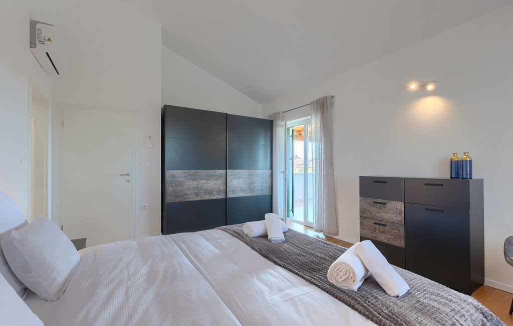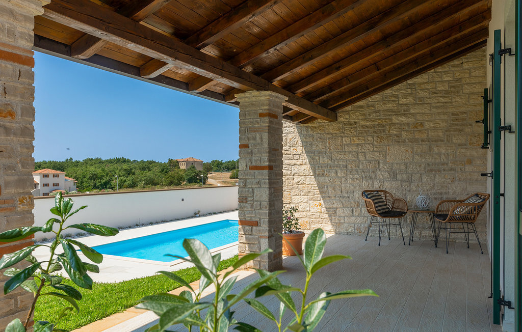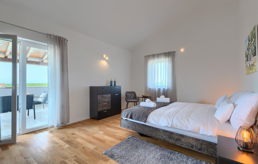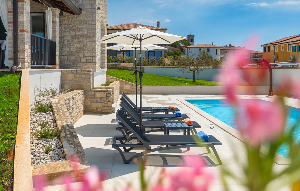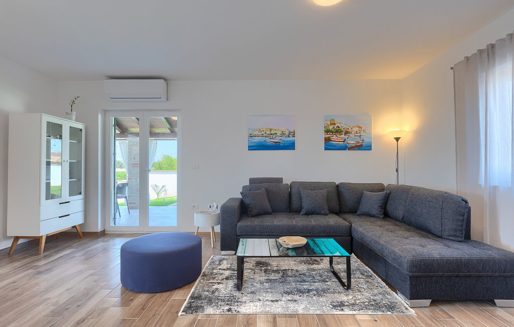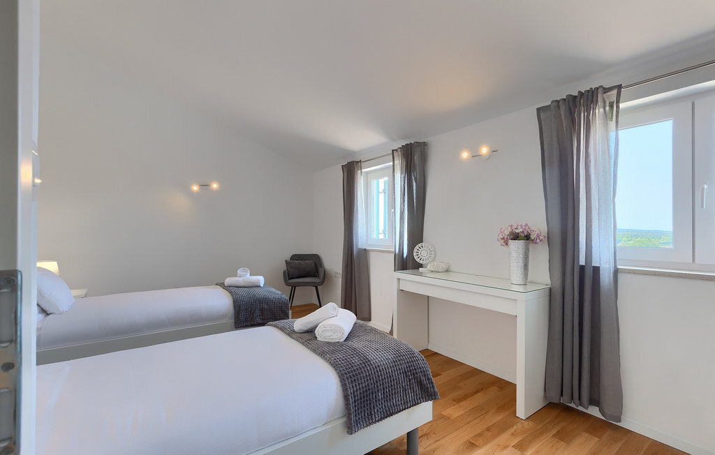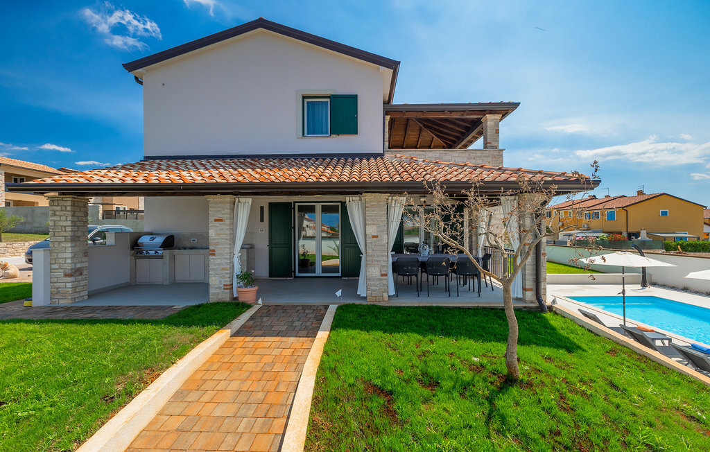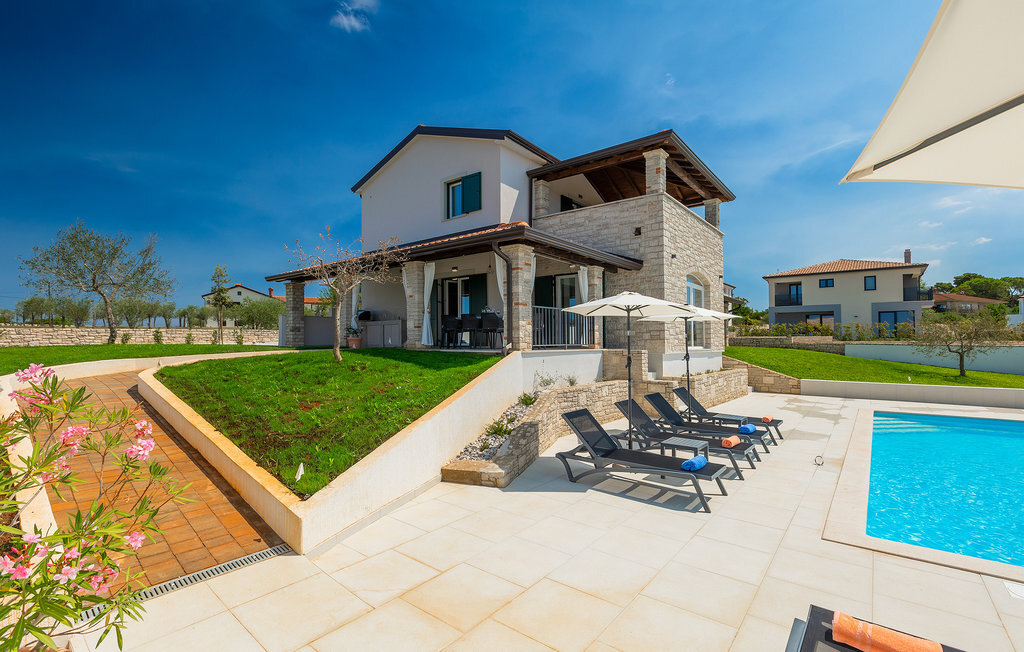 La magnifique villa Victoria Brtonigla est une véritable oasis où vous trouverez calme et détente, loin du stress de la vie quotidienne. La piscine rafraîchissante de 40m2 attirera votre attention dès votre arrivée à la villa. Il vous sera difficile de résister à l'envie de plonger dans l'eau fraîche. La piscine est entourée de chaises longues confortables sur lesquelles vous pourrez profiter du soleil d'Istrie tout en regardant les enfants jouer dans le jardin ou en feuilletant votre magazine préféré. À l'extérieur de la maison, chacun trouvera sa place préférée. La terrasse couverte avec cuisine d'été et grande table à manger sera probablement l'endroit où vous planifierez vos excursions dans la région en mangeant des plats fraîchement préparés au barbecue. De la terrasse, vous accédez directement à l'espace de vie ouvert et climatisé comprenant un salon, une salle à manger et une cuisine entièrement équipée. Une des chambres à coucher se trouve également au rez-de-chaussée. Cette chambre à coucher avec lit double dispose d'une salle de bain privée et d'un accès à sa propre petite terrasse. Des toilettes séparées pour les invités et une buanderie avec lave-linge et sèche-linge complètent ce niveau. À l'étage supérieur, trois autres chambres confortables promettent des nuits reposantes. L'une des chambres dispose de sa propre salle de bains, les deux autres chambres se partagent une salle de bains séparée. Une de ces chambres a deux lits simples, les autres chambres ont des lits doubles.