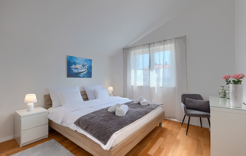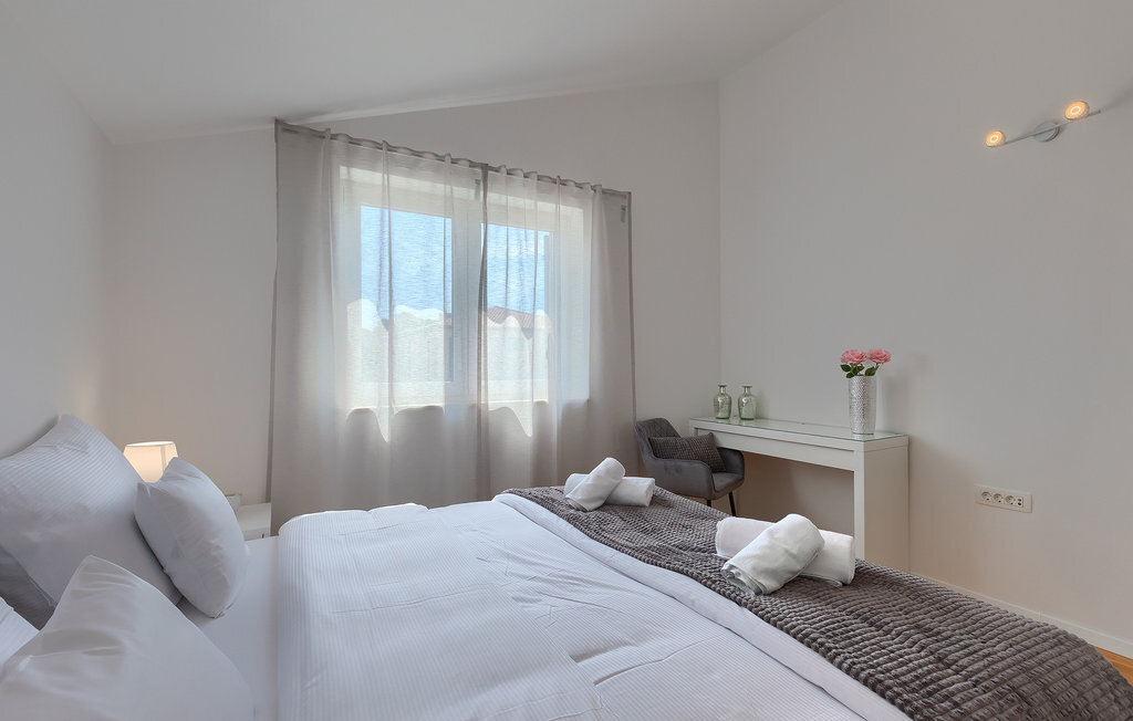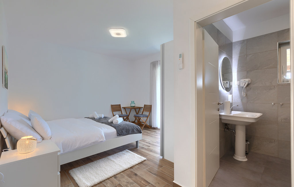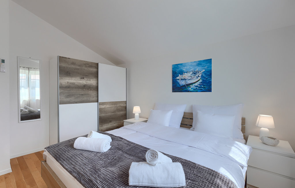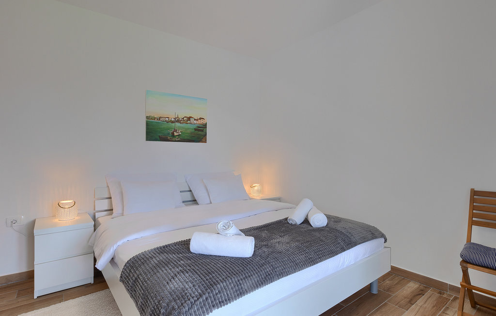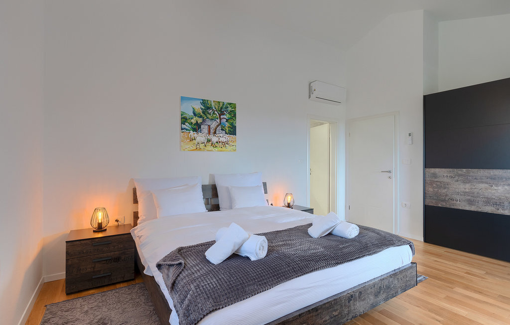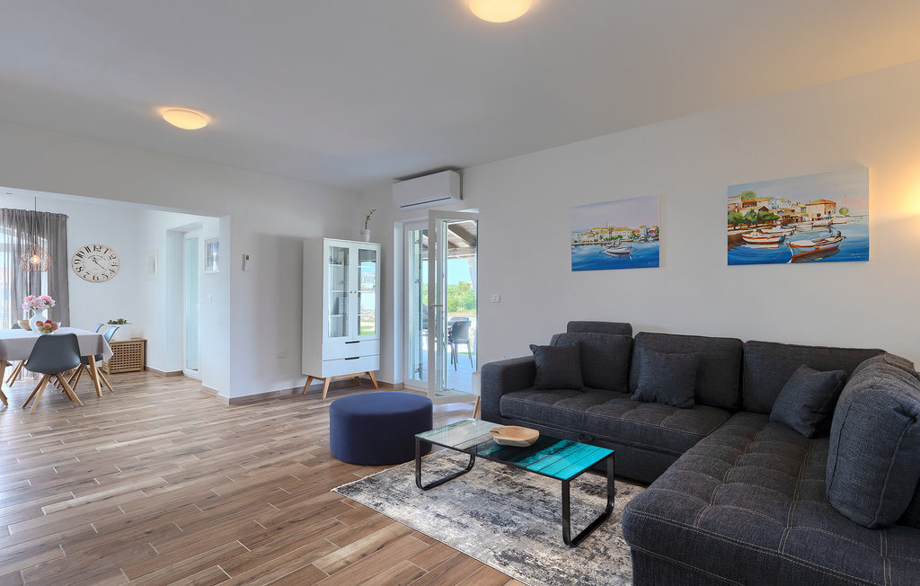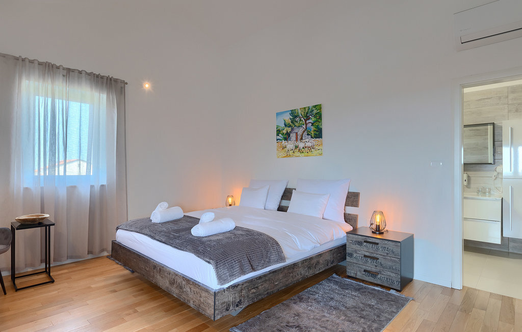 La magnifique villa Victoria Brtonigla est une véritable oasis où vous trouverez calme et détente, loin du stress de la vie quotidienne. La piscine rafraîchissante de 40m2 attirera votre attention dès votre arrivée à la villa. Il vous sera difficile de résister à l'envie de plonger dans l'eau fraîche. La piscine est entourée de chaises longues confortables sur lesquelles vous pourrez profiter du soleil d'Istrie tout en regardant les enfants jouer dans le jardin ou en feuilletant votre magazine préféré. À l'extérieur de la maison, chacun trouvera sa place préférée. La terrasse couverte avec cuisine d'été et grande table à manger sera probablement l'endroit où vous planifierez vos excursions dans la région en mangeant des plats fraîchement préparés au barbecue. De la terrasse, vous accédez directement à l'espace de vie ouvert et climatisé comprenant un salon, une salle à manger et une cuisine entièrement équipée. Une des chambres à coucher se trouve également au rez-de-chaussée. Cette chambre à coucher avec lit double dispose d'une salle de bain privée et d'un accès à sa propre petite terrasse. Des toilettes séparées pour les invités et une buanderie avec lave-linge et sèche-linge complètent ce niveau. À l'étage supérieur, trois autres chambres confortables promettent des nuits reposantes. L'une des chambres dispose de sa propre salle de bains, les deux autres chambres se partagent une salle de bains séparée. Une de ces chambres a deux lits simples, les autres chambres ont des lits doubles.