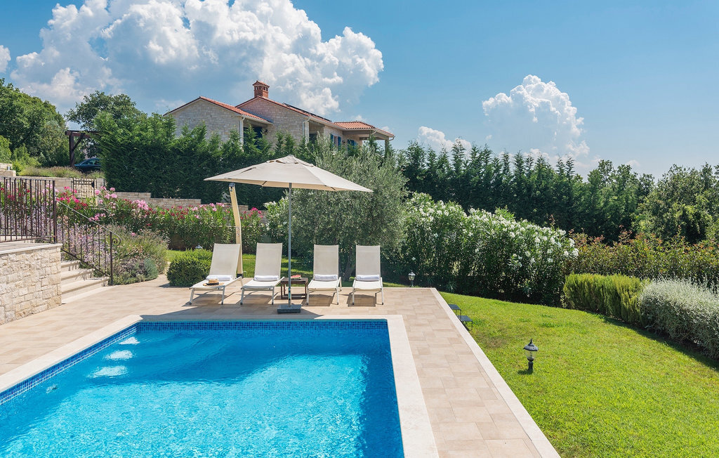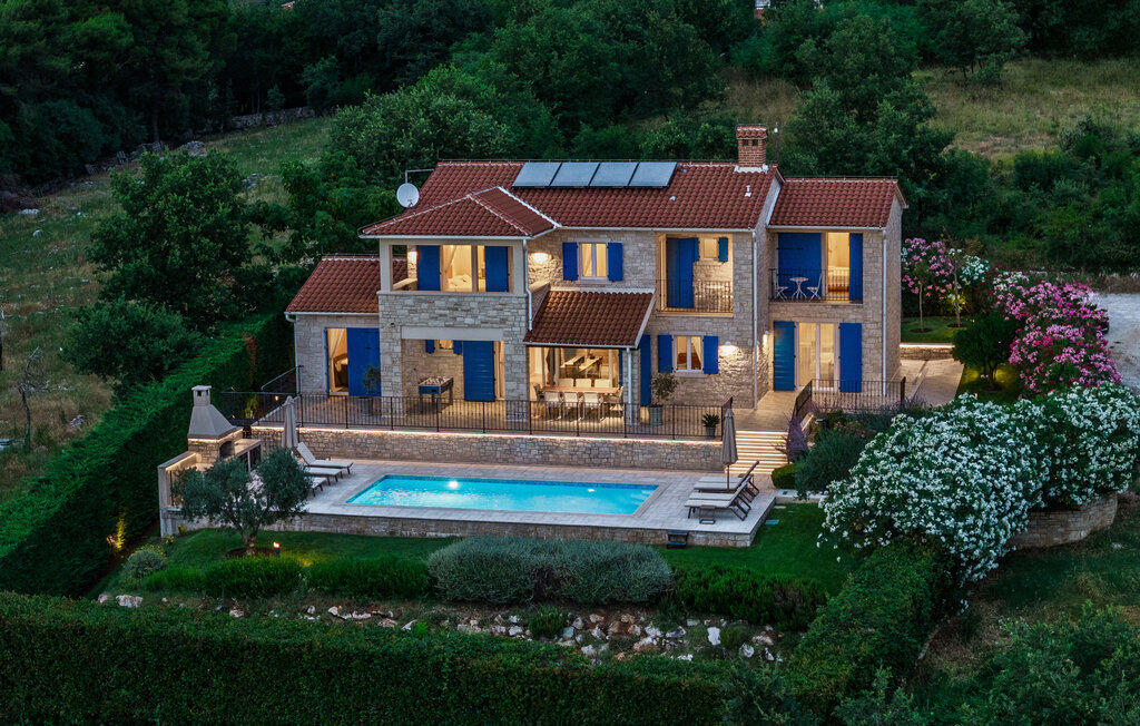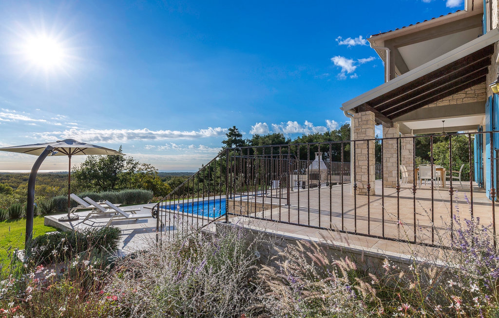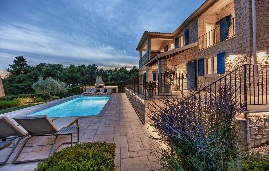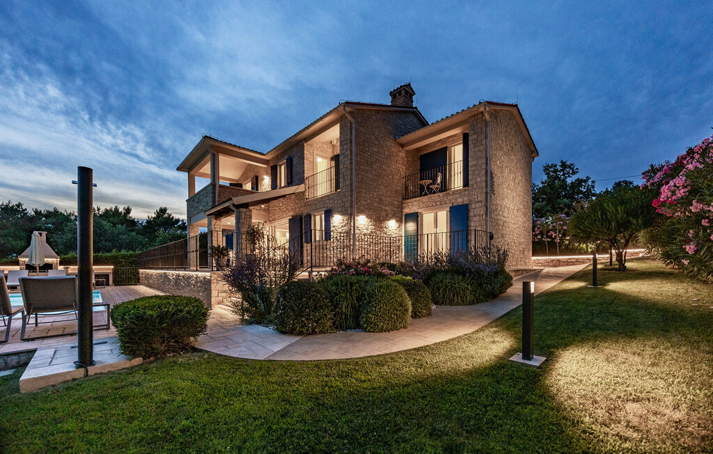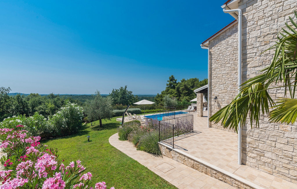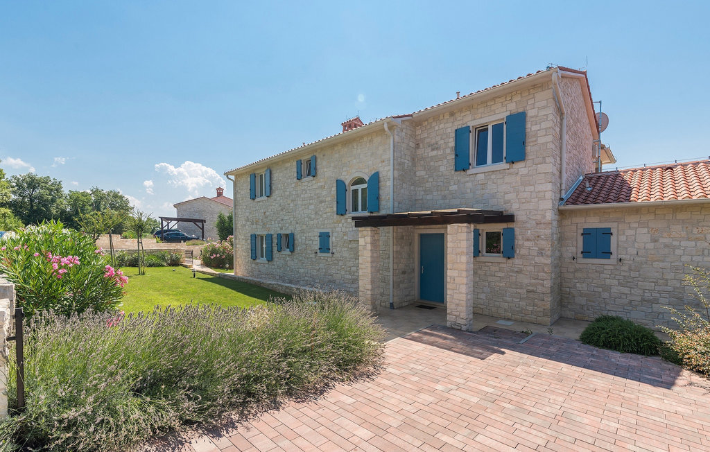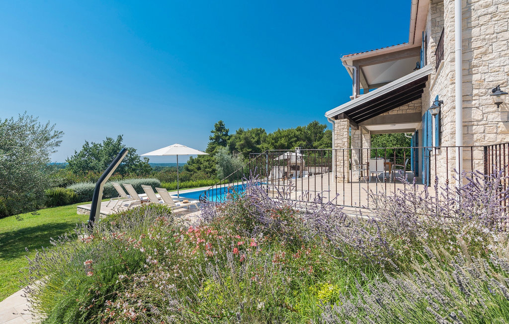 La Villa Sterpazzi est une villa traditionnelle d'Istrie avec une façade en pierre et des volets bleus. Elle est entourée de beaucoup de verdure et de fleurs, ce que vous remarquerez surtout par le parfum de lavande qui se répand dans la propriété.