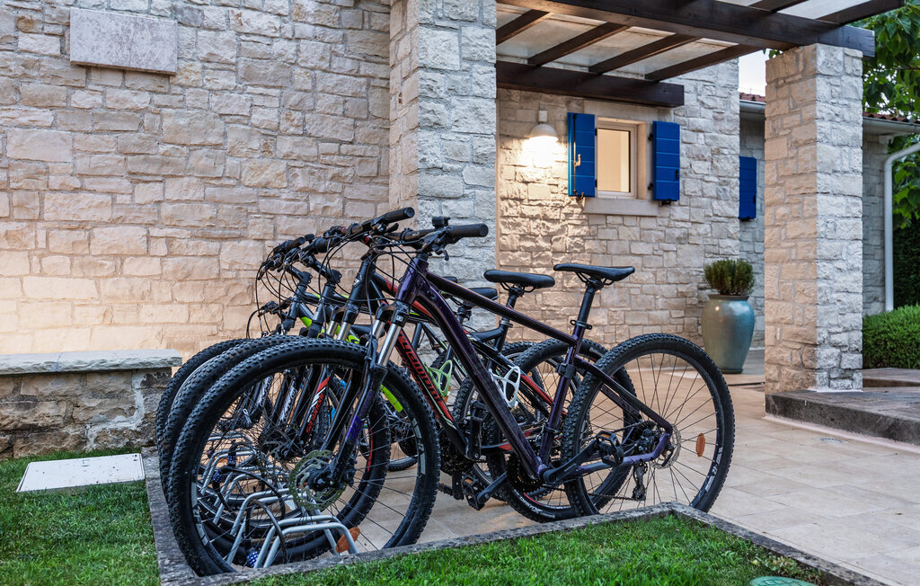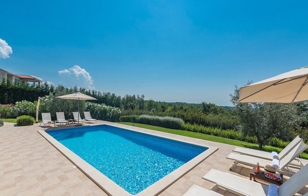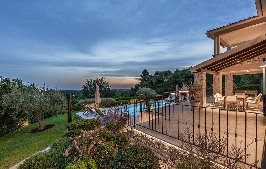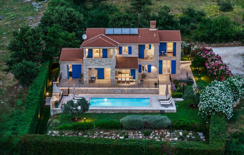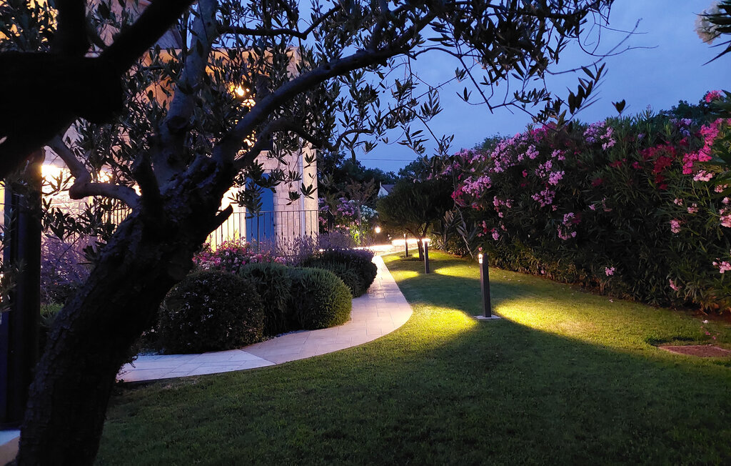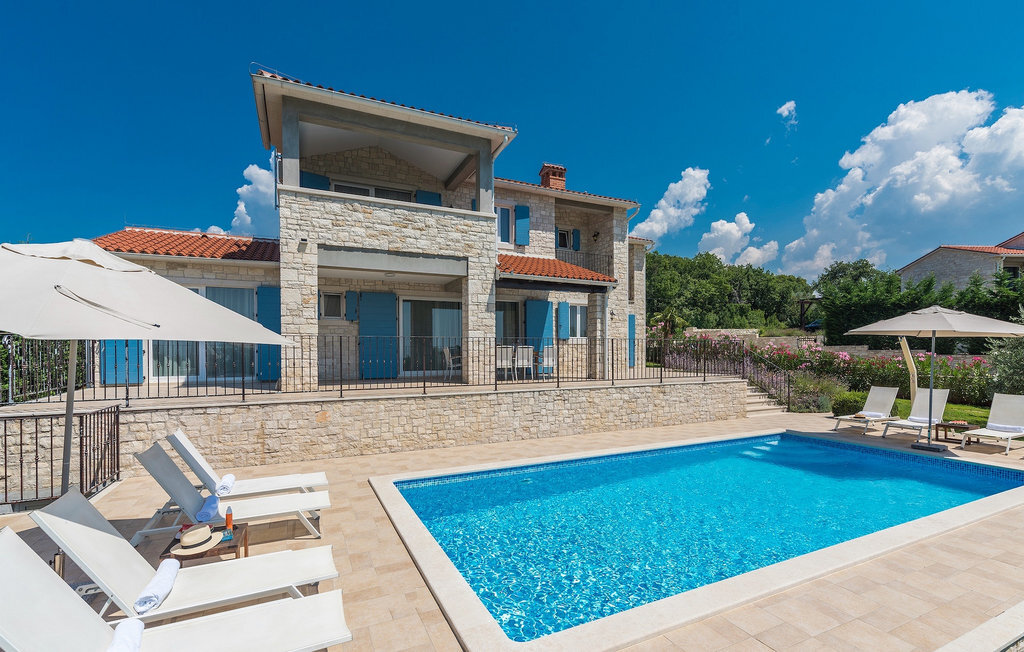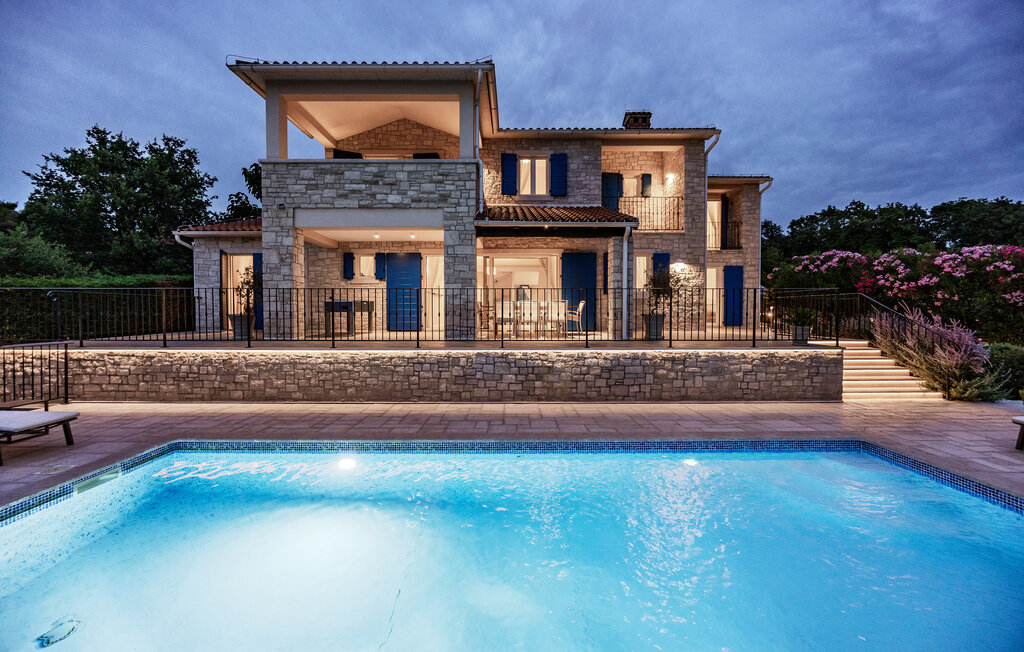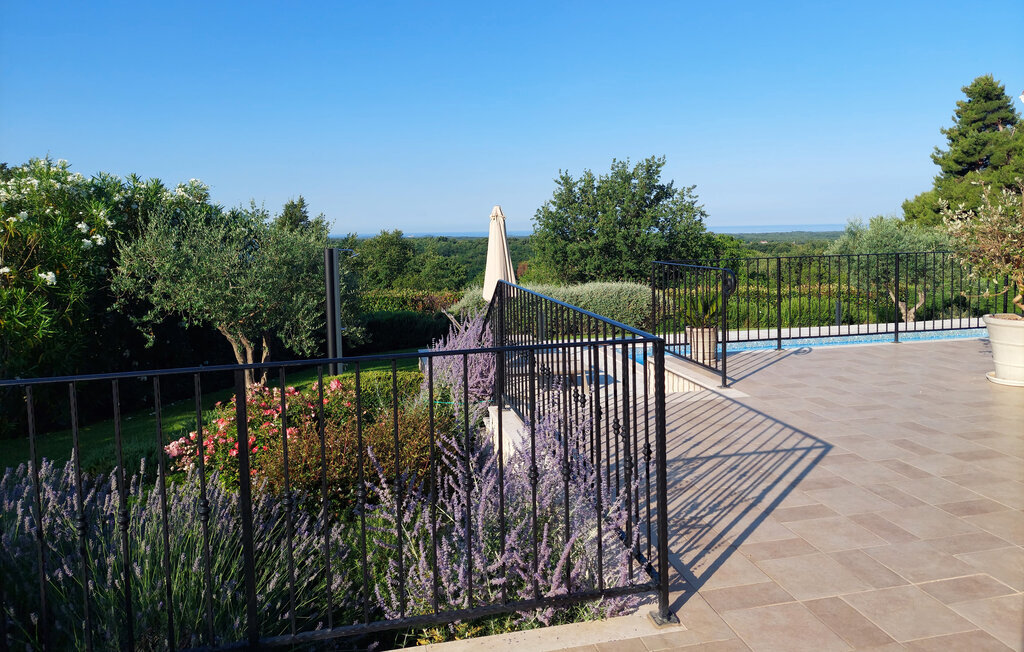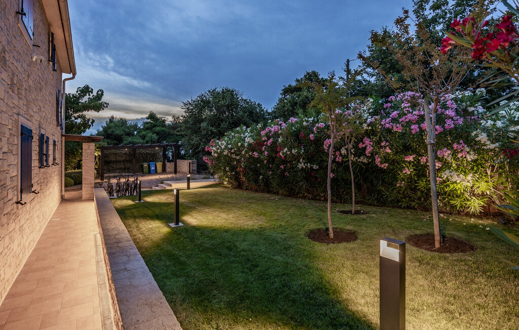 La Villa Sterpazzi est une villa traditionnelle d'Istrie avec une façade en pierre et des volets bleus. Elle est entourée de beaucoup de verdure et de fleurs, ce que vous remarquerez surtout par le parfum de lavande qui se répand dans la propriété.