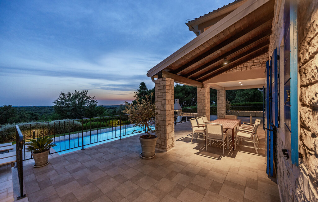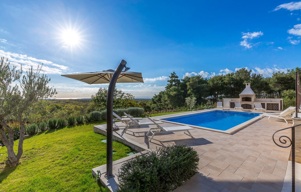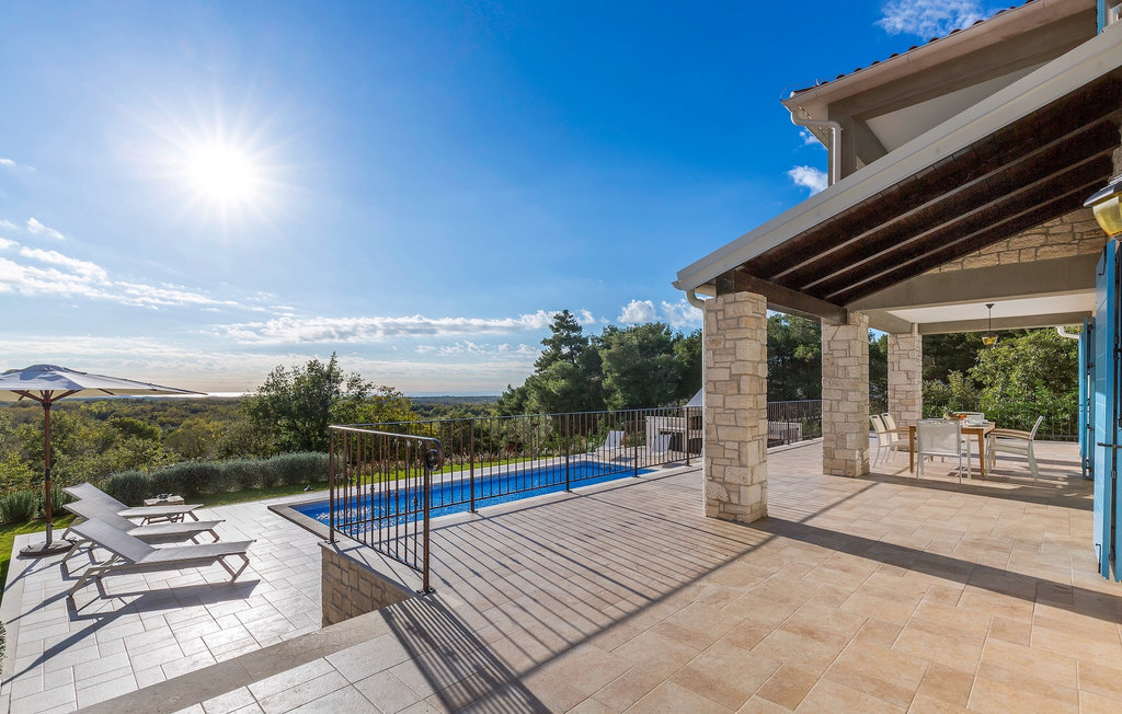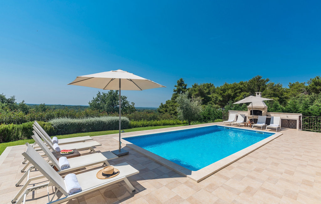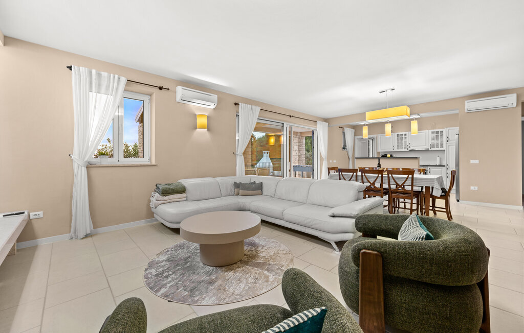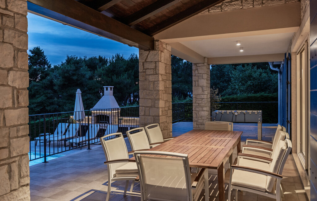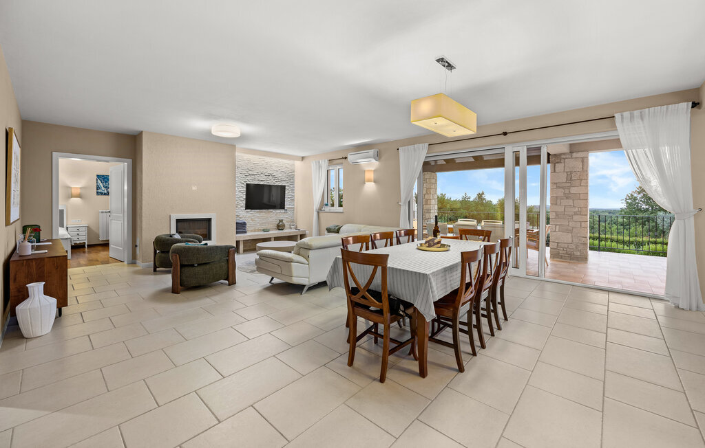 Faites une pause dans votre quotidien stressant dans cette charmante villa rustique pour 8 personnes avec vue sur les collines et la mer. Commencez vos vacances bien méritées par un plongeon dans la piscine privée ou lisez un livre sur les chaises longues sous le parasol. La spacieuse terrasse couverte est l'endroit idéal pour savourer les repas préparés sur le barbecue extérieur ou dans la cuisine entièrement équipée. Au rez-de-chaussée, la cuisine, la salle à manger et le salon forment un espace spacieux au plan ouvert, directement relié à la terrasse par des portes vitrées. Un complément particulier du salon est la cheminée, qui crée une atmosphère spéciale pendant les mois d'hiver ou d'été. Malgré son aspect rustique, cette villa particulière est équipée de toutes les commodités nécessaires à la vie moderne - elle est entièrement climatisée et dispose du chauffage au sol dans toute la maison. Pour plus de confort, en particulier pour les familles avec enfants, le rez-de-chaussée comprend également une chambre à coucher spacieuse avec salle de bain privée et un WC séparé supplémentaire.