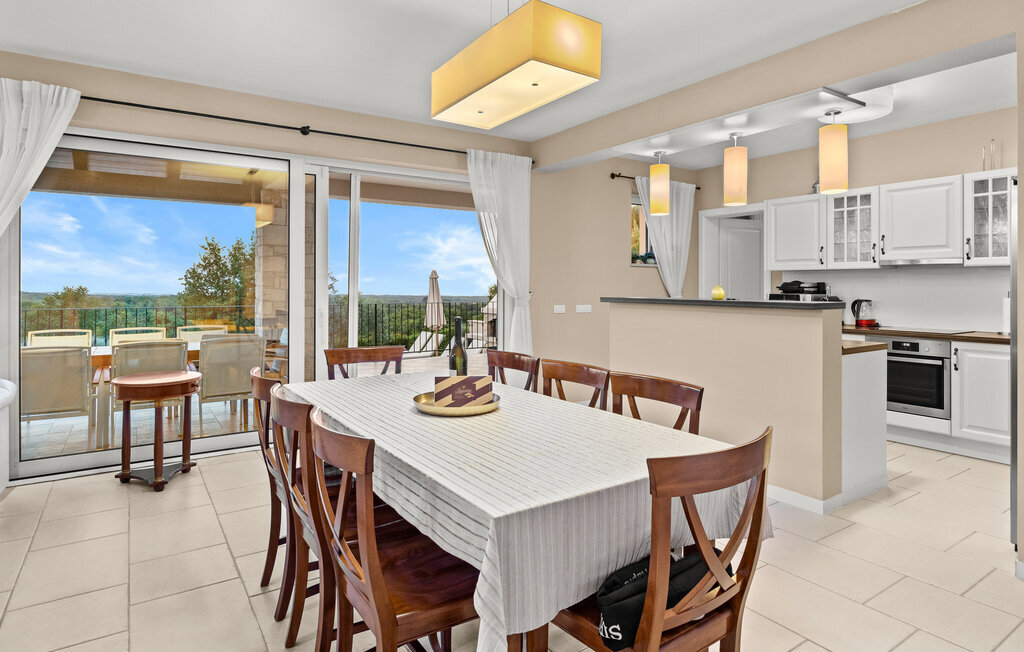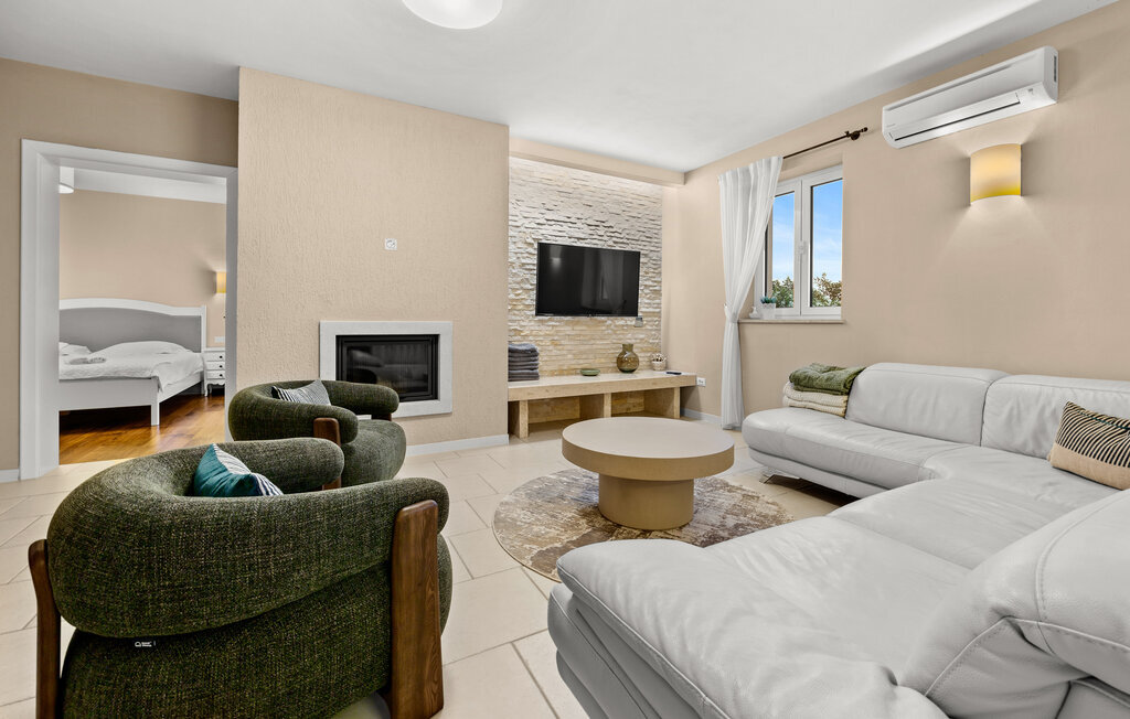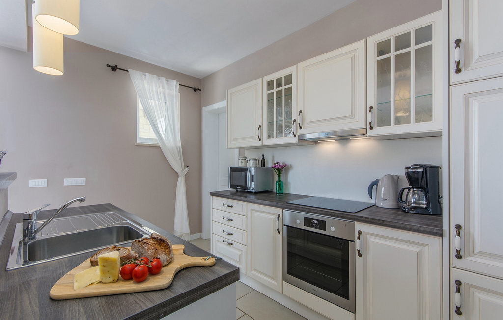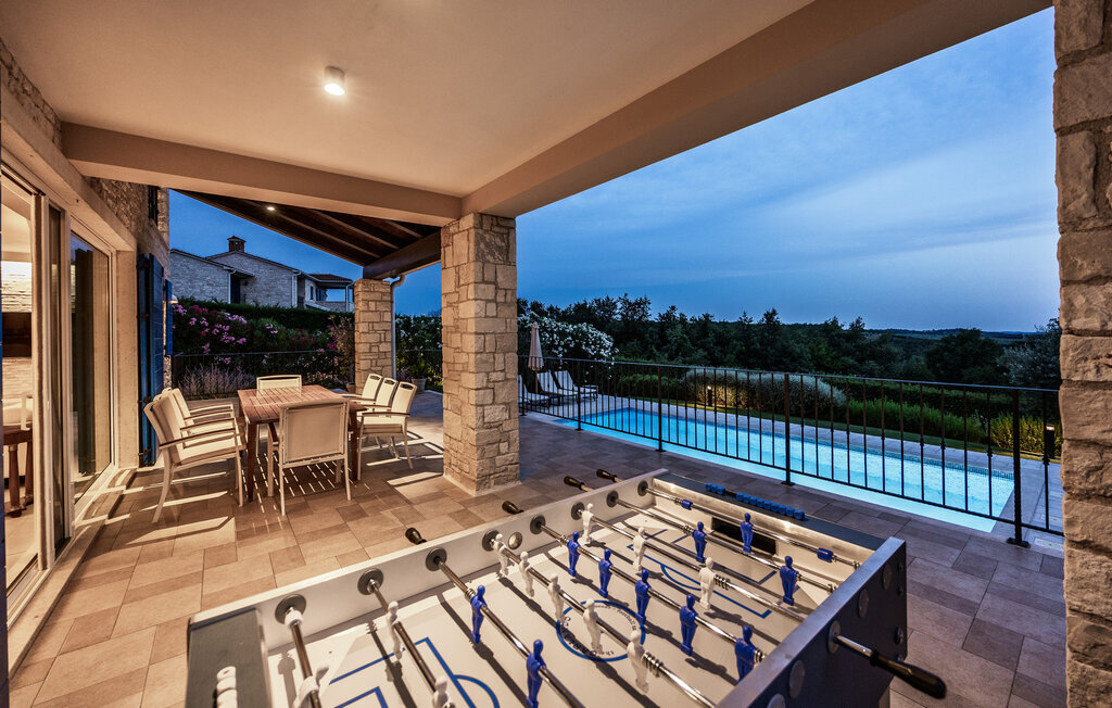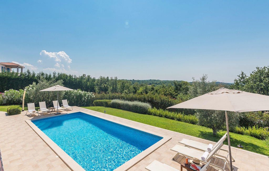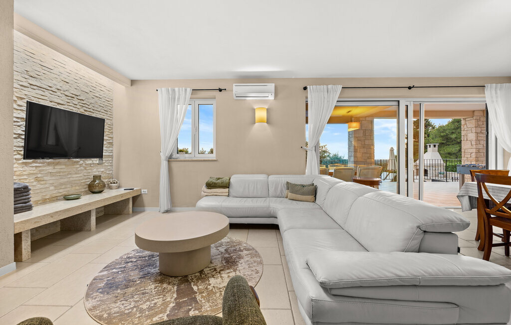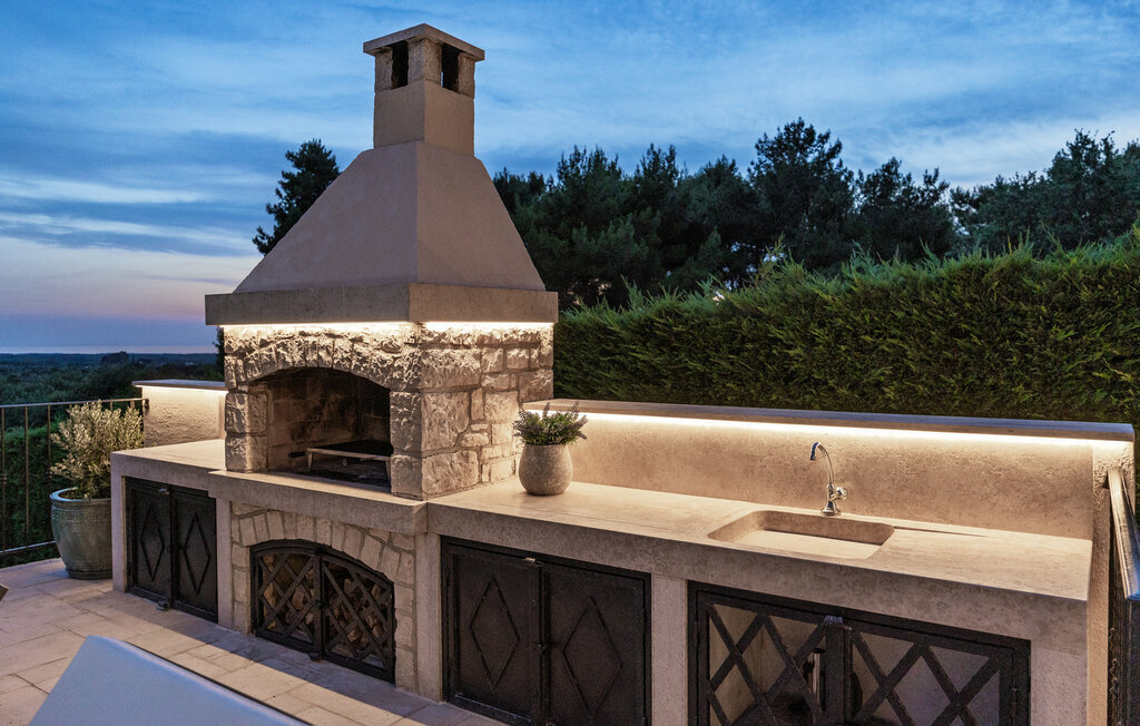 Faites une pause dans votre quotidien stressant dans cette charmante villa rustique pour 8 personnes avec vue sur les collines et la mer. Commencez vos vacances bien méritées par un plongeon dans la piscine privée ou lisez un livre sur les chaises longues sous le parasol. La spacieuse terrasse couverte est l'endroit idéal pour savourer les repas préparés sur le barbecue extérieur ou dans la cuisine entièrement équipée. Au rez-de-chaussée, la cuisine, la salle à manger et le salon forment un espace spacieux au plan ouvert, directement relié à la terrasse par des portes vitrées. Un complément particulier du salon est la cheminée, qui crée une atmosphère spéciale pendant les mois d'hiver ou d'été. Malgré son aspect rustique, cette villa particulière est équipée de toutes les commodités nécessaires à la vie moderne - elle est entièrement climatisée et dispose du chauffage au sol dans toute la maison. Pour plus de confort, en particulier pour les familles avec enfants, le rez-de-chaussée comprend également une chambre à coucher spacieuse avec salle de bain privée et un WC séparé supplémentaire.