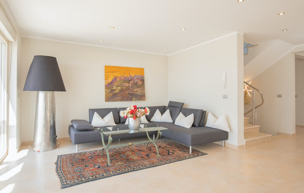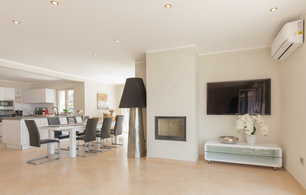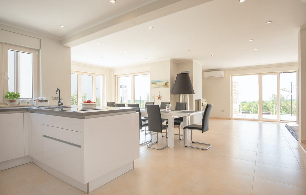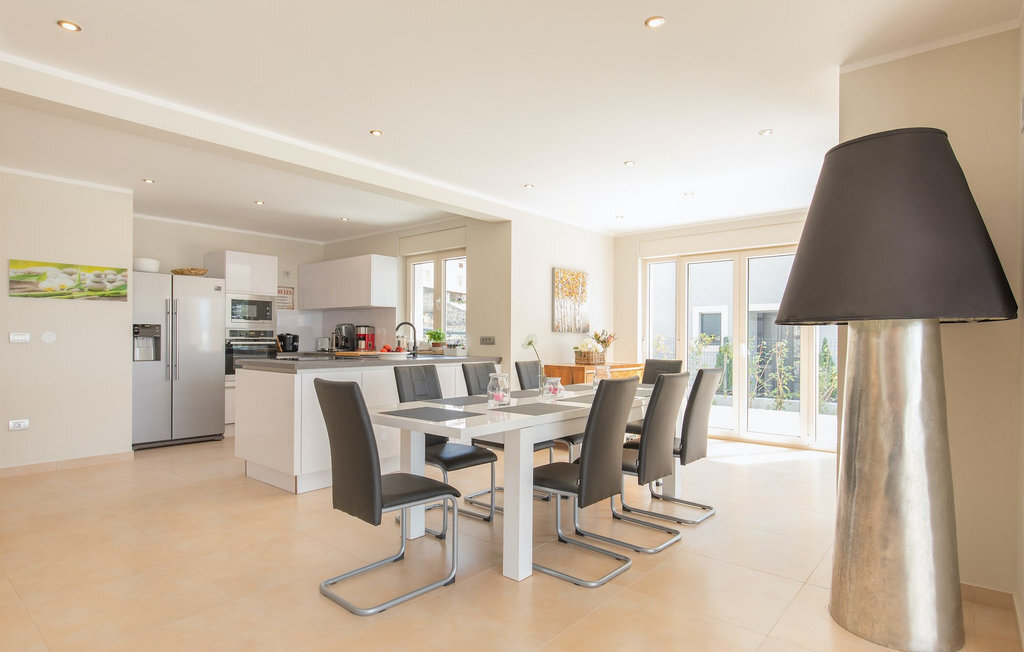 Le rez-de-chaussée de la villa abrite un salon et une salle à manger ouverts et lumineux ainsi qu'une cuisine entièrement équipée avec un accès direct à la terrasse extérieure et à la piscine.