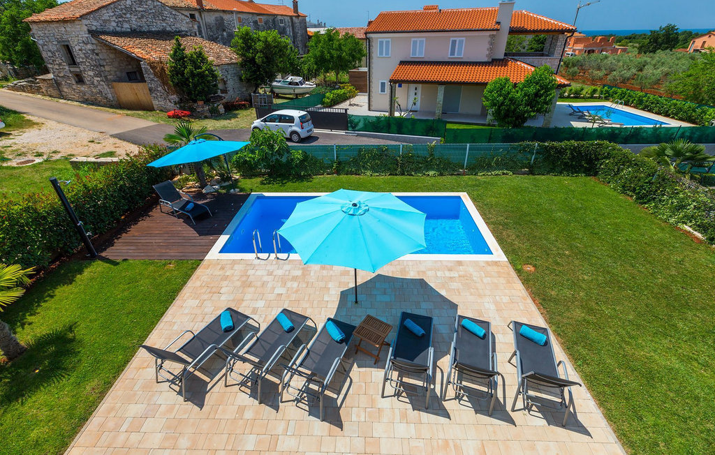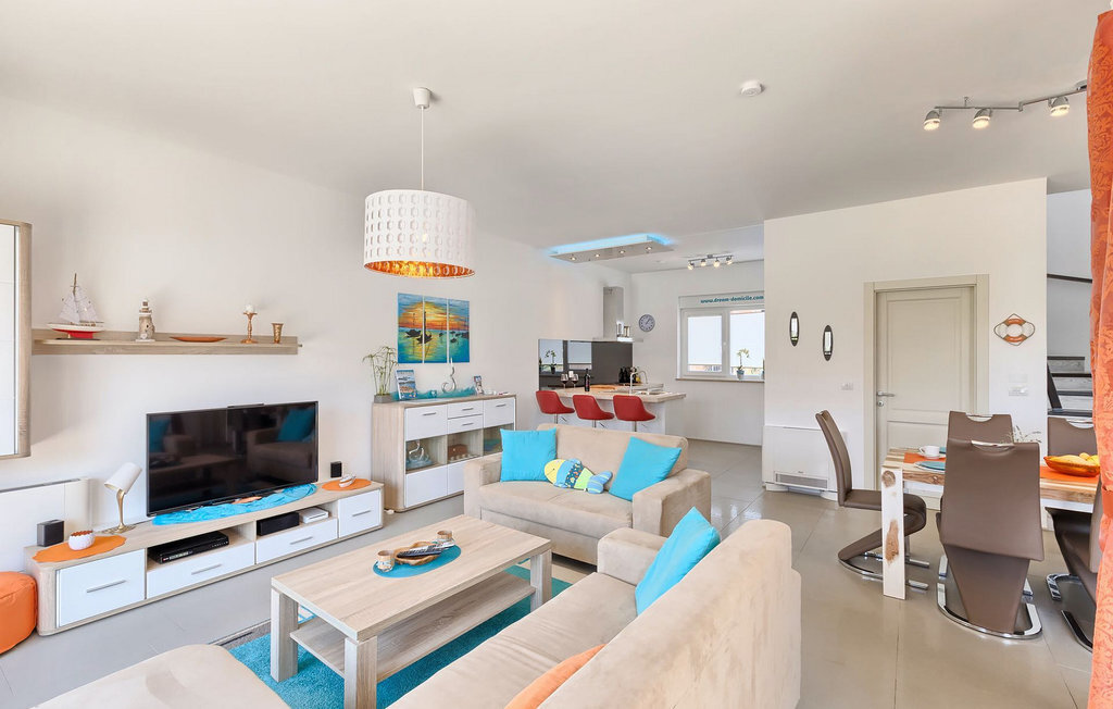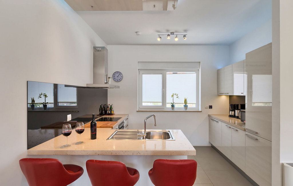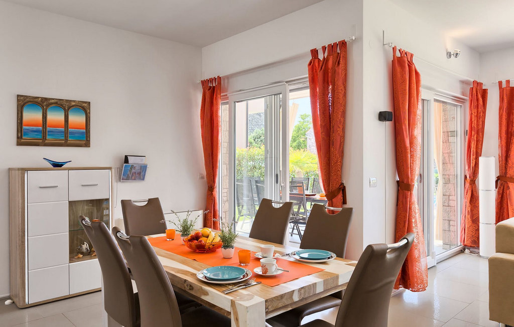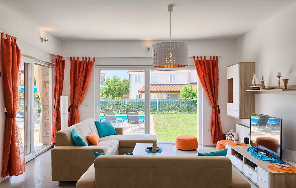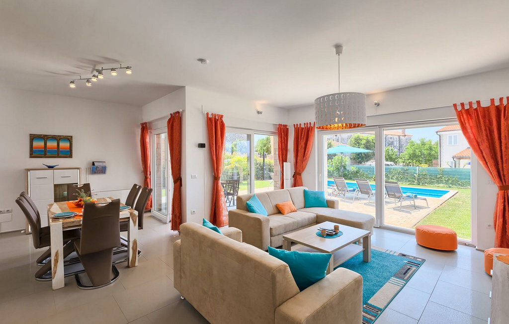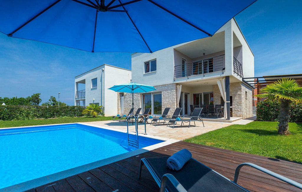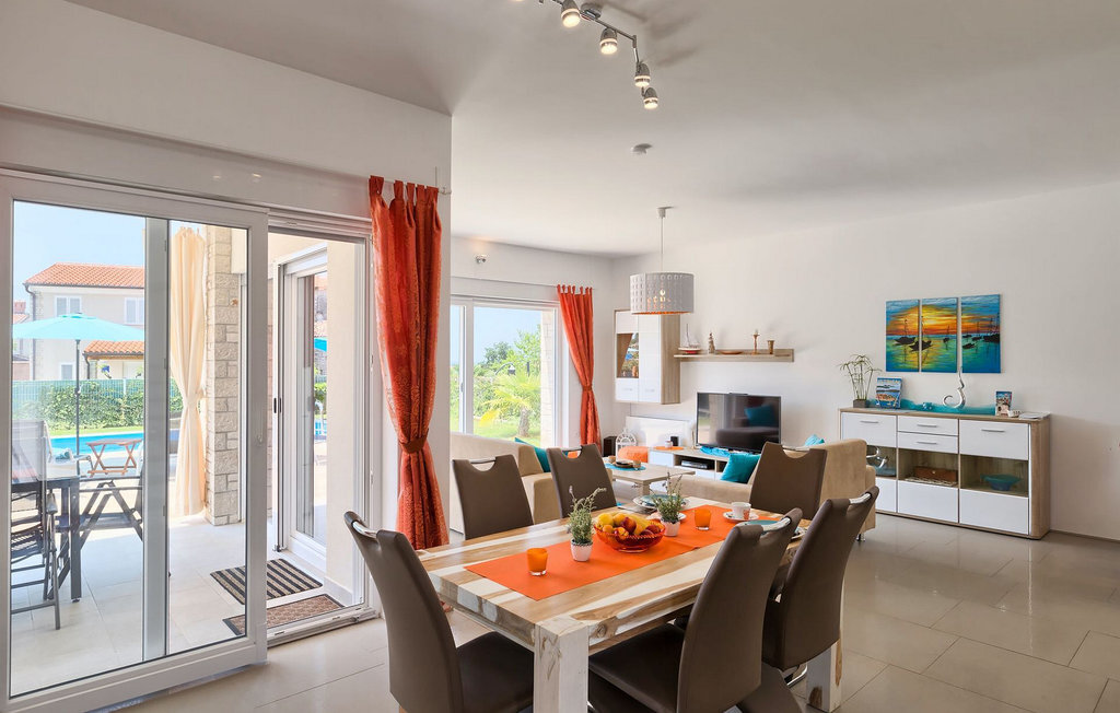 Grâce à son excellente situation au calme, cette magnifique villa résout le dilemme "campagne ou côte", car elle est entourée d'oliveraies idylliques, de collines boisées et de prairies vert émeraude, tandis que la ville côtière populaire de Novigrad se trouve à proximité immédiate, avec un large choix de boutiques, bars, cafés et restaurants, ainsi qu'une jolie marina et de nombreuses plages. Soigneusement conçue pour les vacances, cette villa de construction récente est aménagée dans un style moderne avec un magnifique collage de textures et de couleurs, créant ainsi une atmosphère chaleureuse. Les trois chambres à coucher, toutes équipées de l'air conditionné et d'une télévision à écran plat, se trouvent à l'étage supérieur, ainsi que deux salles de bains modernes avec chauffage au sol et une grande terrasse d'où l'on peut profiter d'une vue magnifique sur les oliveraies et la mer. Le rez-de-chaussée spacieux et inondé de lumière, avec son agencement ouvert, est divisé de manière très réussie en salon, cuisine et salle à manger et fait office de centre social de la maison. La cuisine est équipée d'un éclairage LED d'ambiance qui peut être réglé individuellement en fonction de l'humeur.