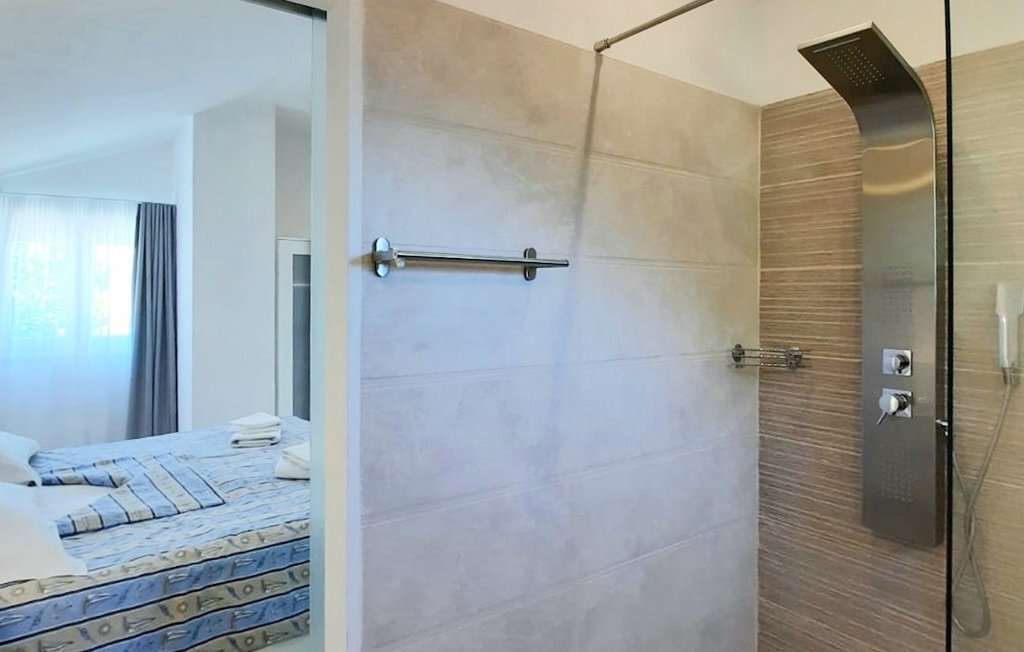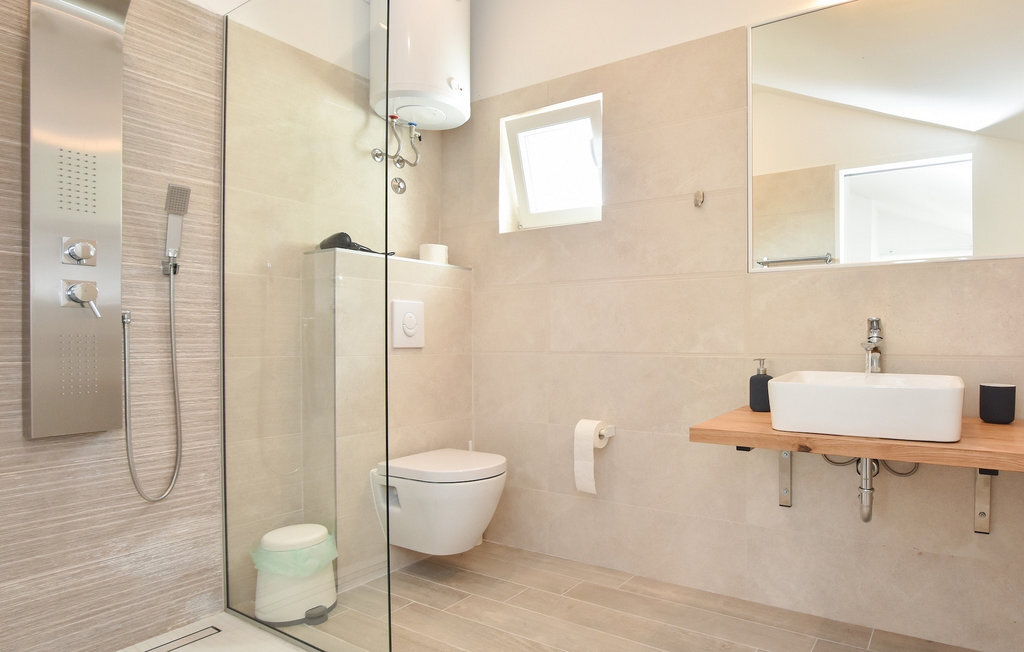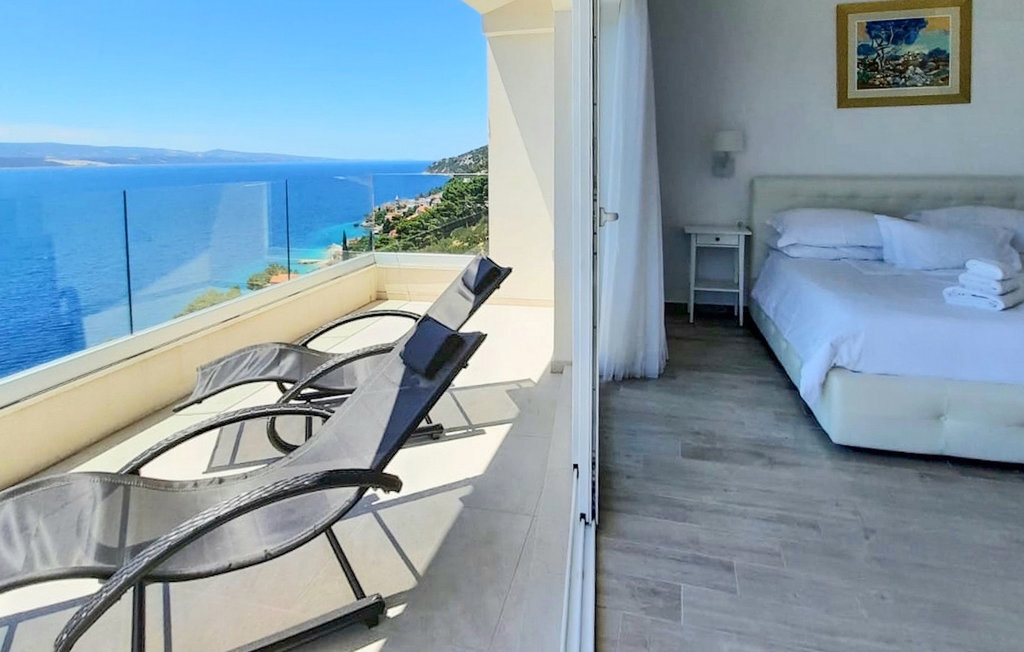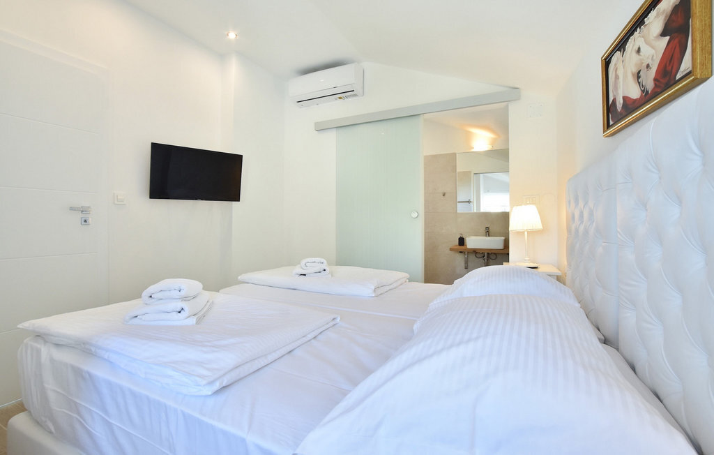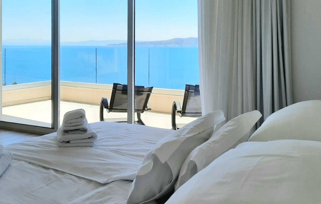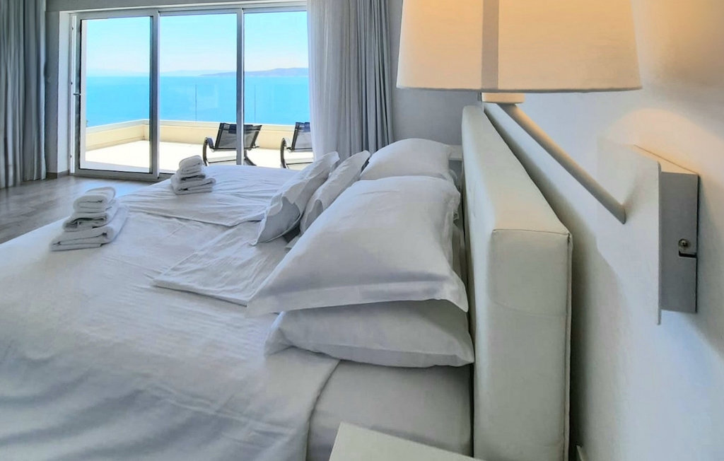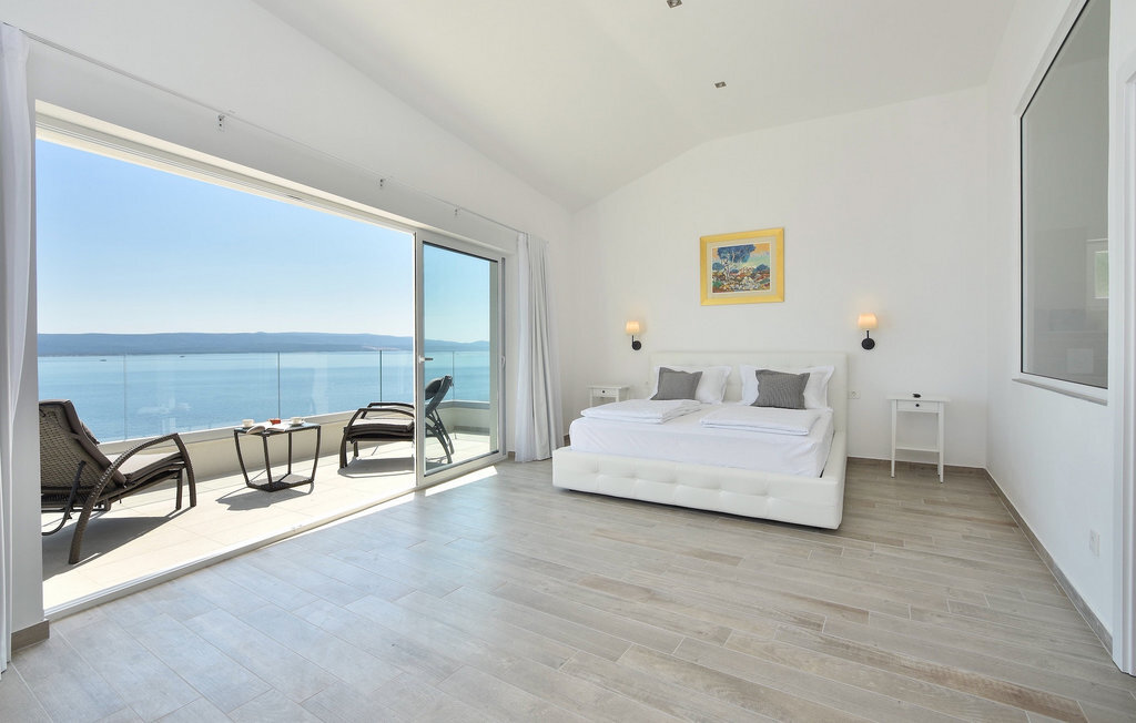 À l'étage supérieur de la villa se trouvent deux chambres à coucher, également modernes et neutres, toutes deux avec leur propre salle de bains. L'une des chambres dispose même d'un balcon privé avec des meubles de salon et une vue directe sur la mer. Accueillez les matins tranquilles en buvant un café sur votre propre balcon avec les premiers rayons de soleil et une vue imbattable.