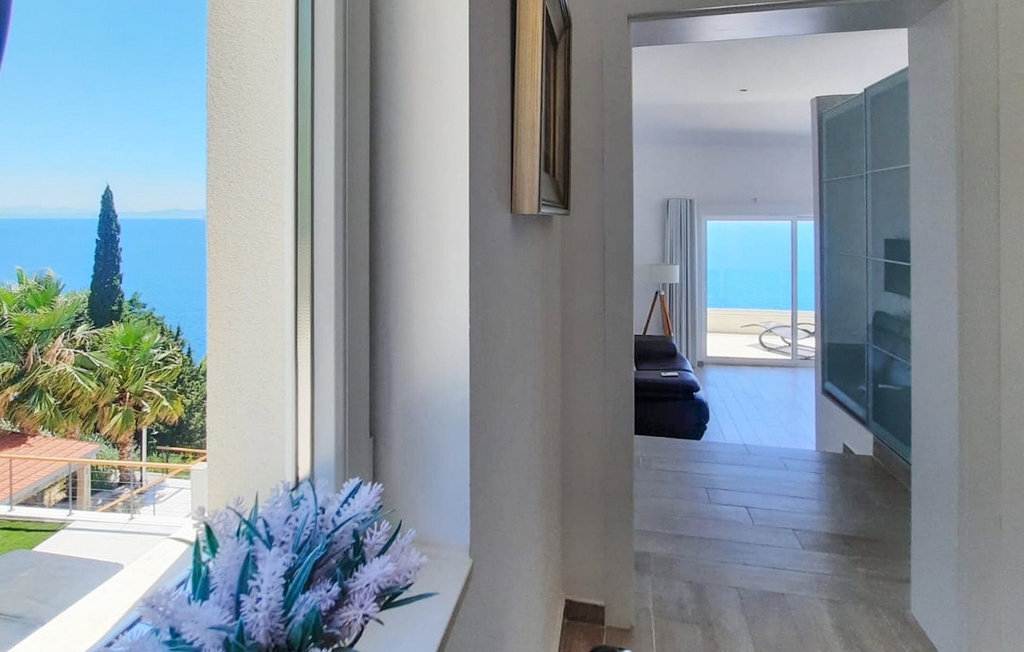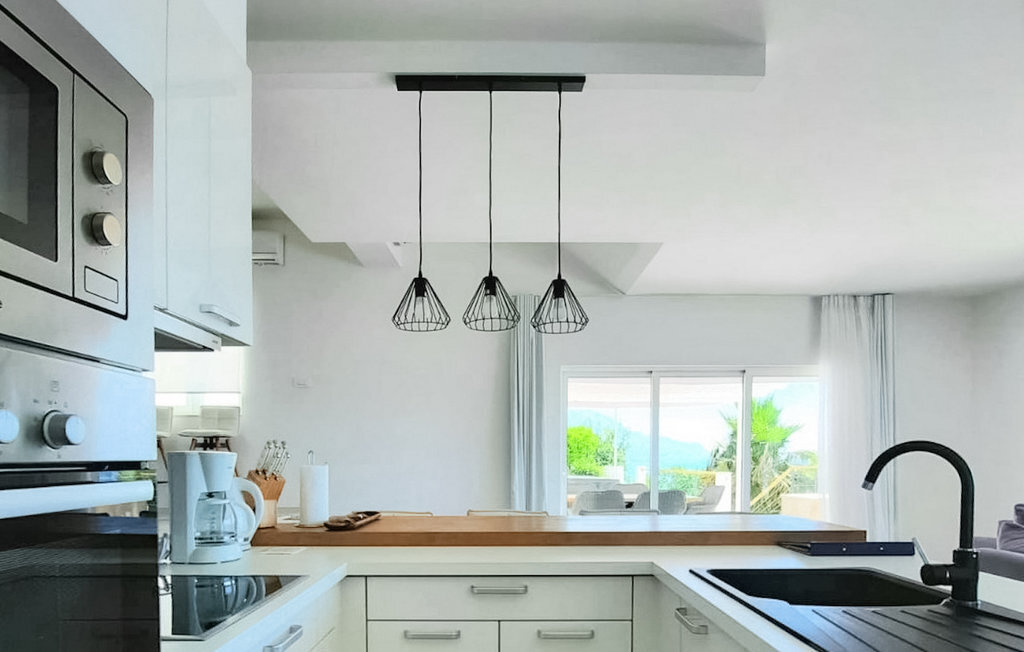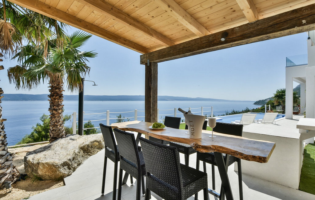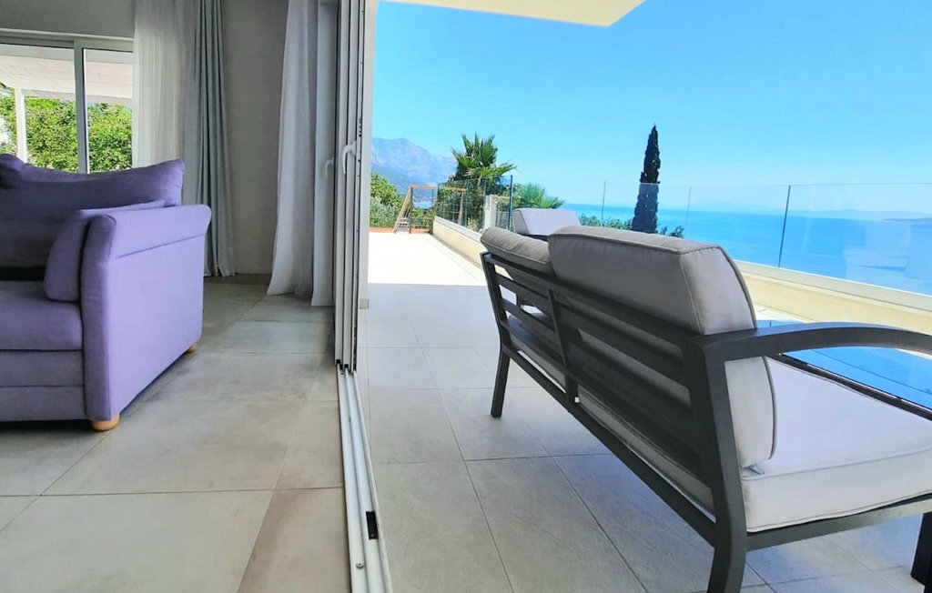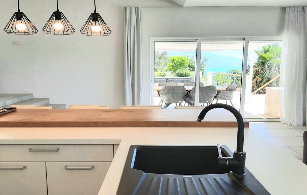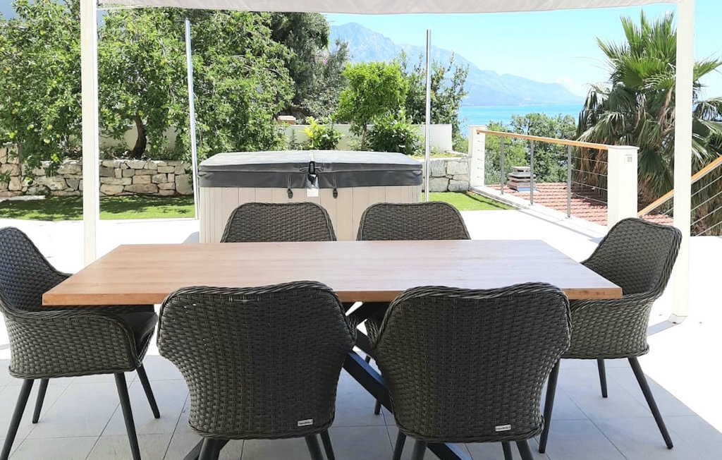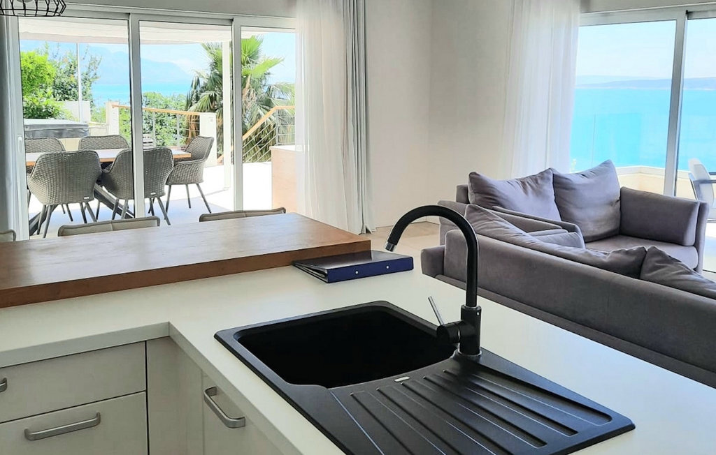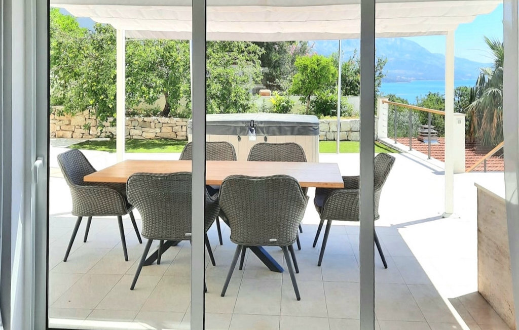 La villa dispose de deux terrasses qui offrent toutes deux une vue panoramique phénoménale sur la mer. Sur la terrasse inférieure se trouve une piscine privée et autour de celle-ci des chaises longues, pour un maximum de détente dans ou à côté de la piscine. La partie couverte de la terrasse, près de la piscine, est équipée d'une table haute et de chaises, ainsi que d'un barbecue, pour les moments où vous avez besoin de vous protéger du soleil. Les palmiers, oliviers et autres plantes qui entourent les deux terrasses créent une atmosphère méditerranéenne encore plus complète. Lorsque vous montez les escaliers vers la terrasse supérieure, une autre surprise vous attend : un jacuzzi en plein air ! En fin de journée, vous pourrez donc admirer le coucher de soleil depuis le jacuzzi en sirotant votre boisson préférée. Ainsi, d'un côté se trouve une table à manger pour les repas en commun et de l'autre un espace lounge avec vue directe sur la mer, l'endroit parfait pour le café du matin. Des portes vitrées dans ces zones de la terrasse supérieure donnent un accès direct au salon au rez-de-chaussée de la villa. Avec de nombreuses sources de lumière, le plan ouvert du salon, de la salle à manger et de la cuisine entièrement équipée semble encore plus spacieux et aéré. L'aménagement neutre de l'extérieur et de l'intérieur de la villa se complètent parfaitement et créent une continuité dans tout l'espace.