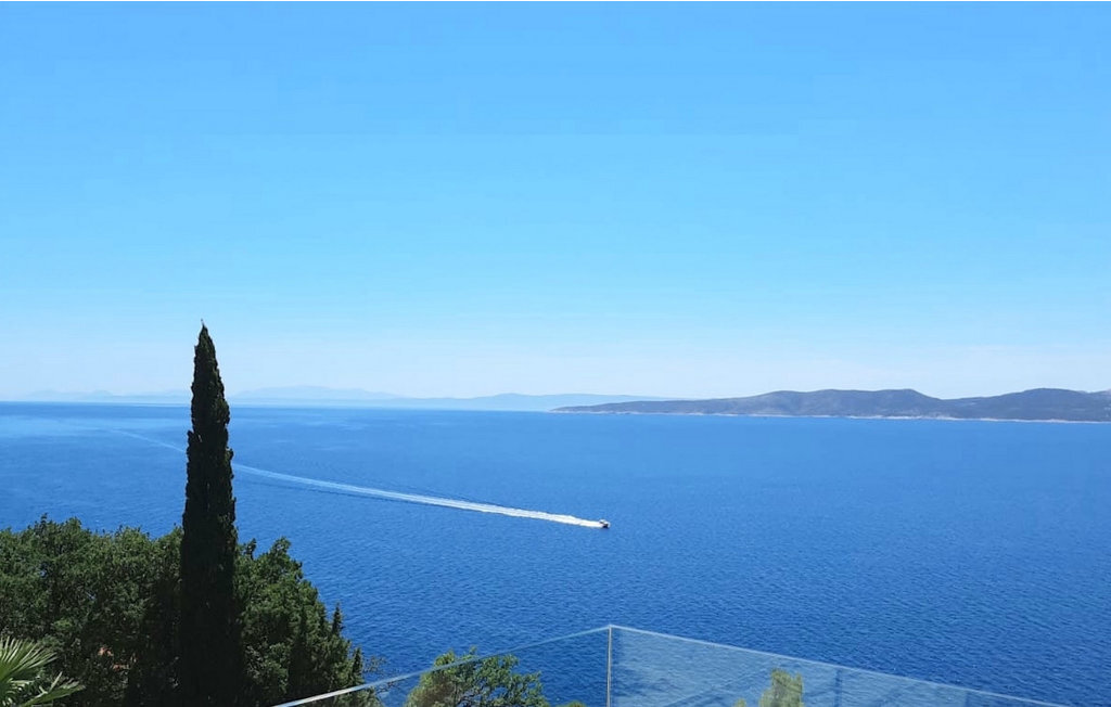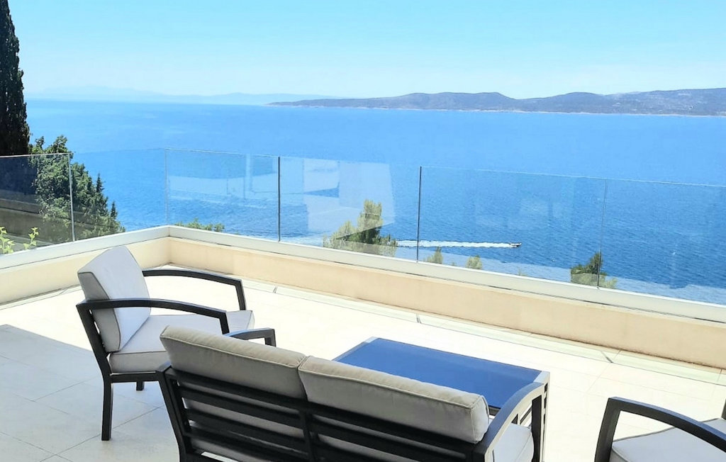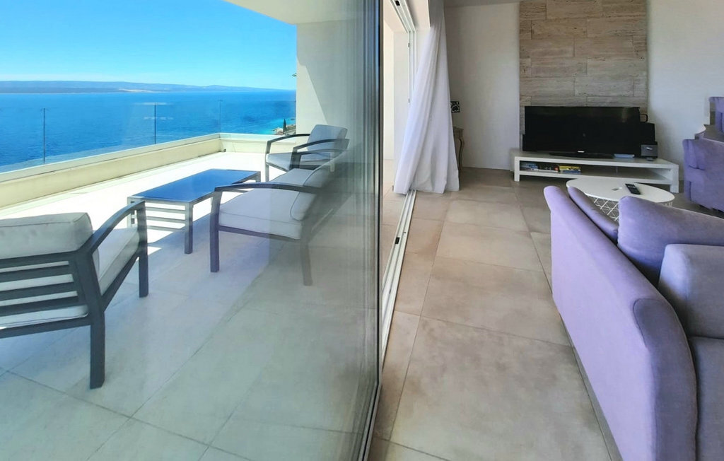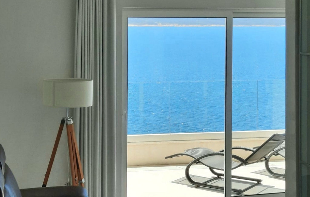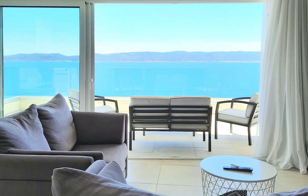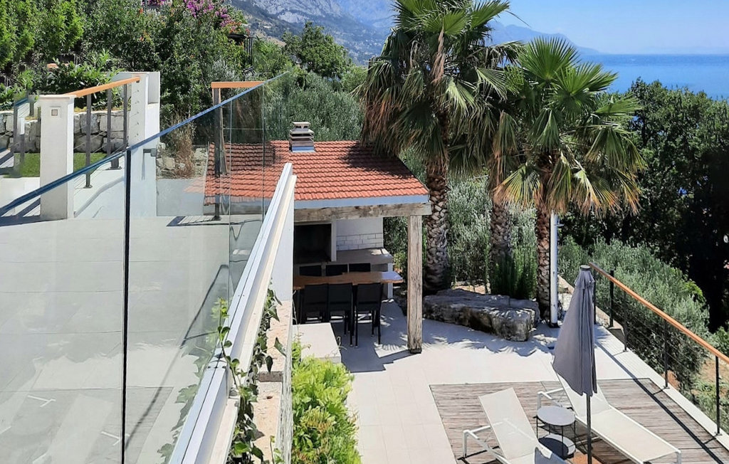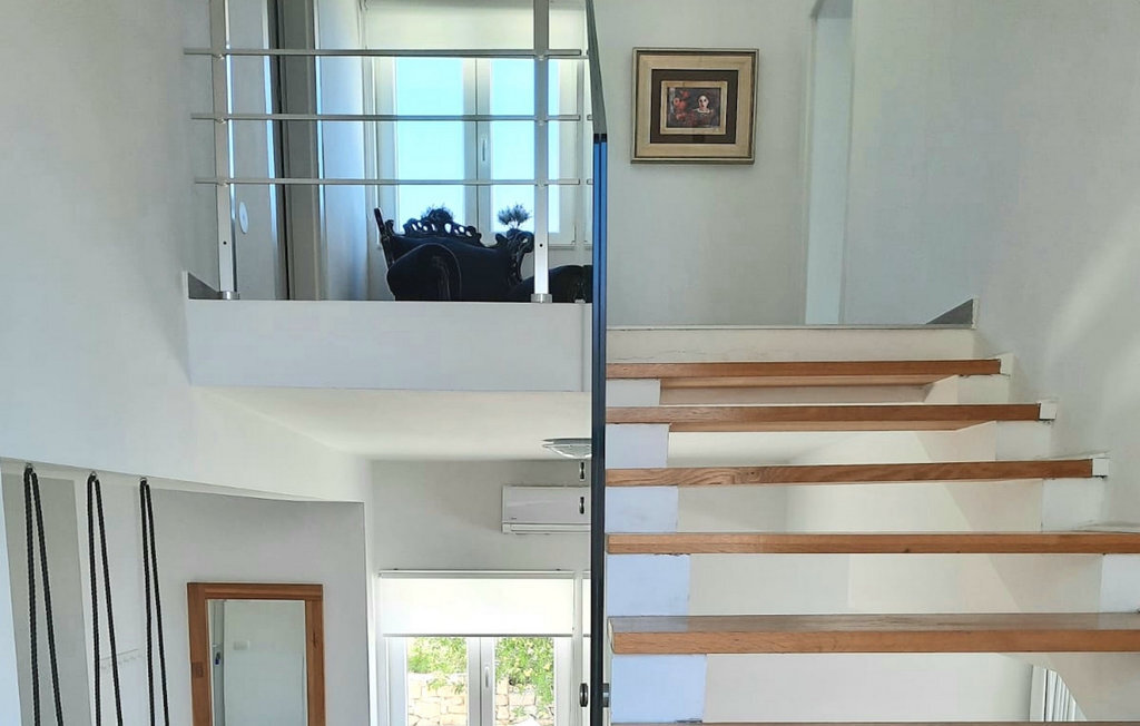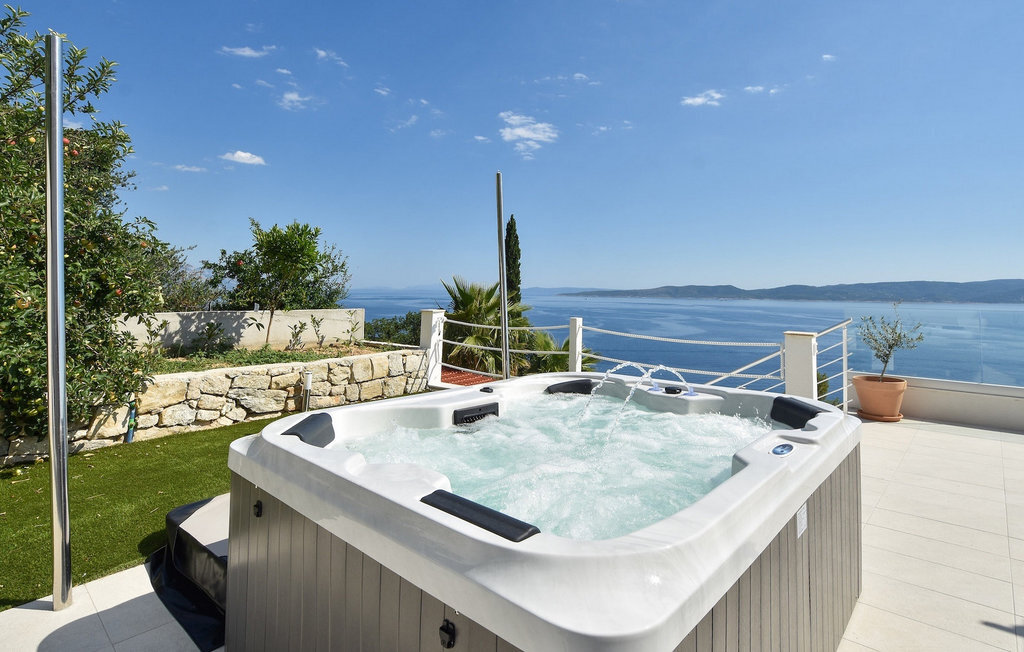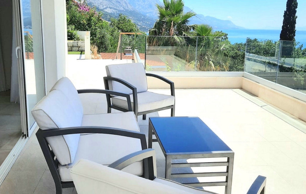 La villa dispose de deux terrasses qui offrent toutes deux une vue panoramique phénoménale sur la mer. Sur la terrasse inférieure se trouve une piscine privée et autour de celle-ci des chaises longues, pour un maximum de détente dans ou à côté de la piscine. La partie couverte de la terrasse, près de la piscine, est équipée d'une table haute et de chaises, ainsi que d'un barbecue, pour les moments où vous avez besoin de vous protéger du soleil. Les palmiers, oliviers et autres plantes qui entourent les deux terrasses créent une atmosphère méditerranéenne encore plus complète. Lorsque vous montez les escaliers vers la terrasse supérieure, une autre surprise vous attend : un jacuzzi en plein air ! En fin de journée, vous pourrez donc admirer le coucher de soleil depuis le jacuzzi en sirotant votre boisson préférée. Ainsi, d'un côté se trouve une table à manger pour les repas en commun et de l'autre un espace lounge avec vue directe sur la mer, l'endroit parfait pour le café du matin. Des portes vitrées dans ces zones de la terrasse supérieure donnent un accès direct au salon au rez-de-chaussée de la villa. Avec de nombreuses sources de lumière, le plan ouvert du salon, de la salle à manger et de la cuisine entièrement équipée semble encore plus spacieux et aéré. L'aménagement neutre de l'extérieur et de l'intérieur de la villa se complètent parfaitement et créent une continuité dans tout l'espace.