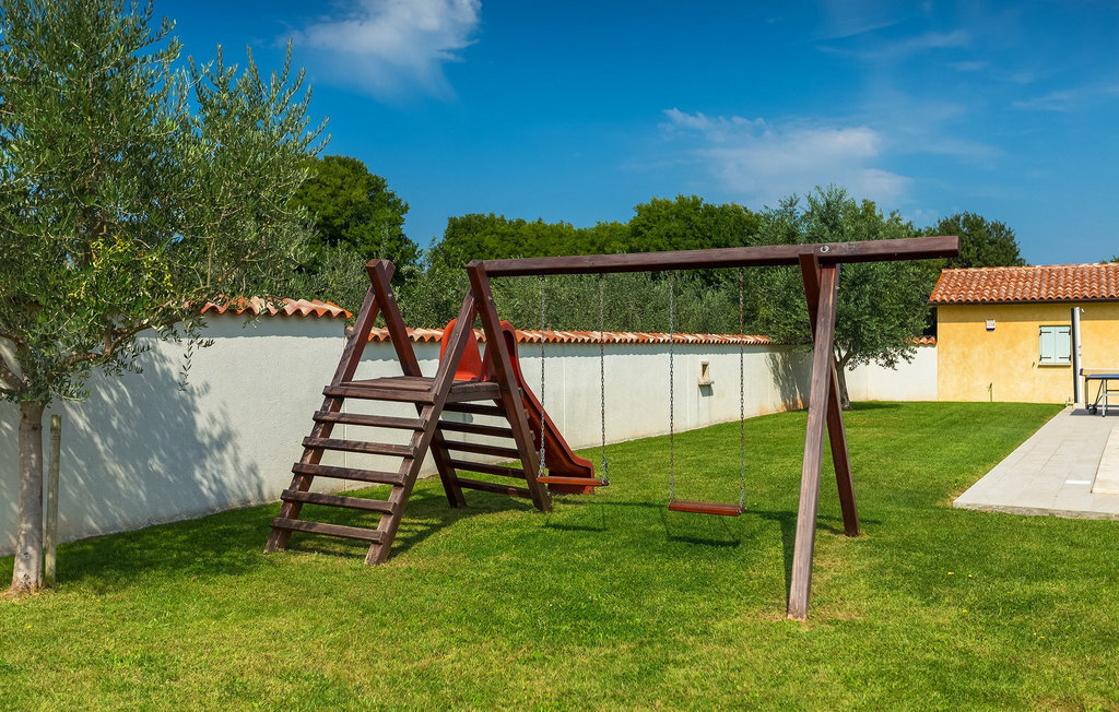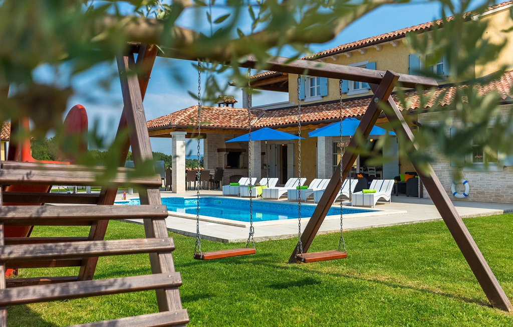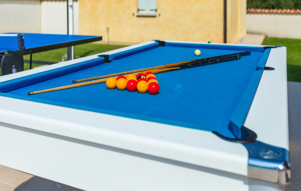 Le vaste espace extérieur est décoré d'une fabuleuse piscine de 40m2 avec ses buses de massage et de confortables chaises longues pour se détendre et prendre des bains de soleil. La cour et le jardin offrent suffisamment d'espace pour que les petits hôtes puissent se défouler et jouer, mais aussi pour les plus grands, car un baby-foot et une table de billard invitent à des tournois passionnants. Les longues et joyeuses soirées d'été en famille et entre amis se passent de préférence sur la terrasse couverte avec barbecue.
