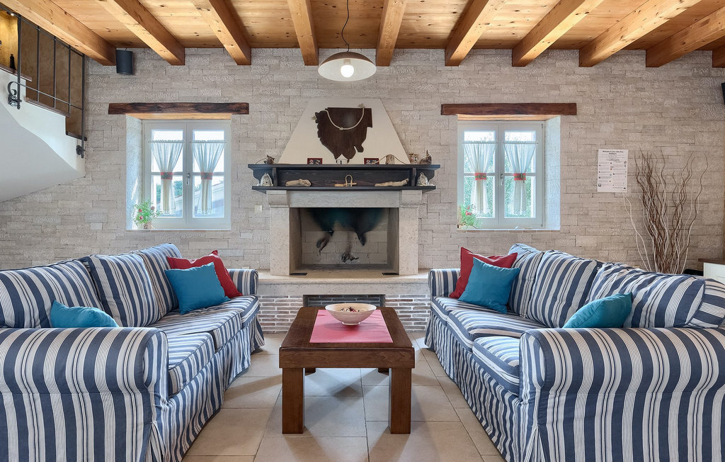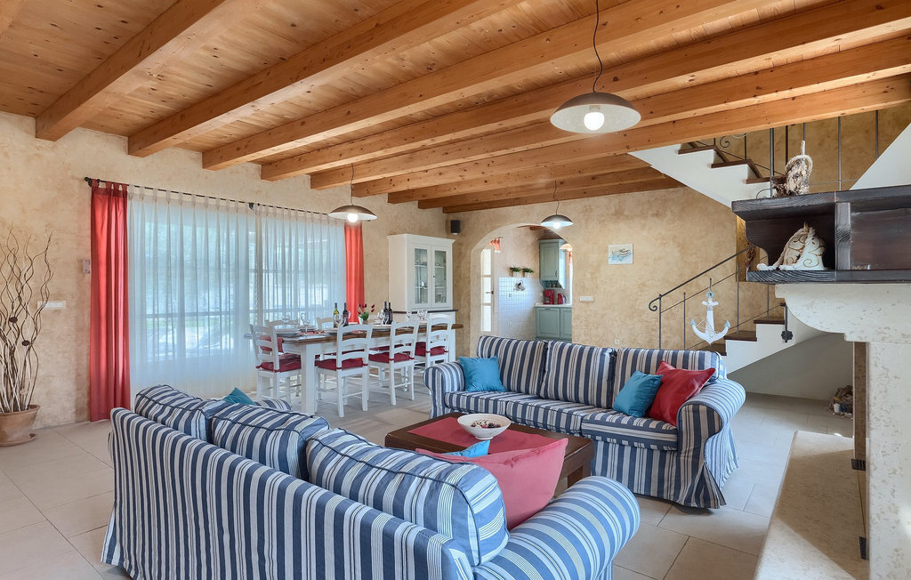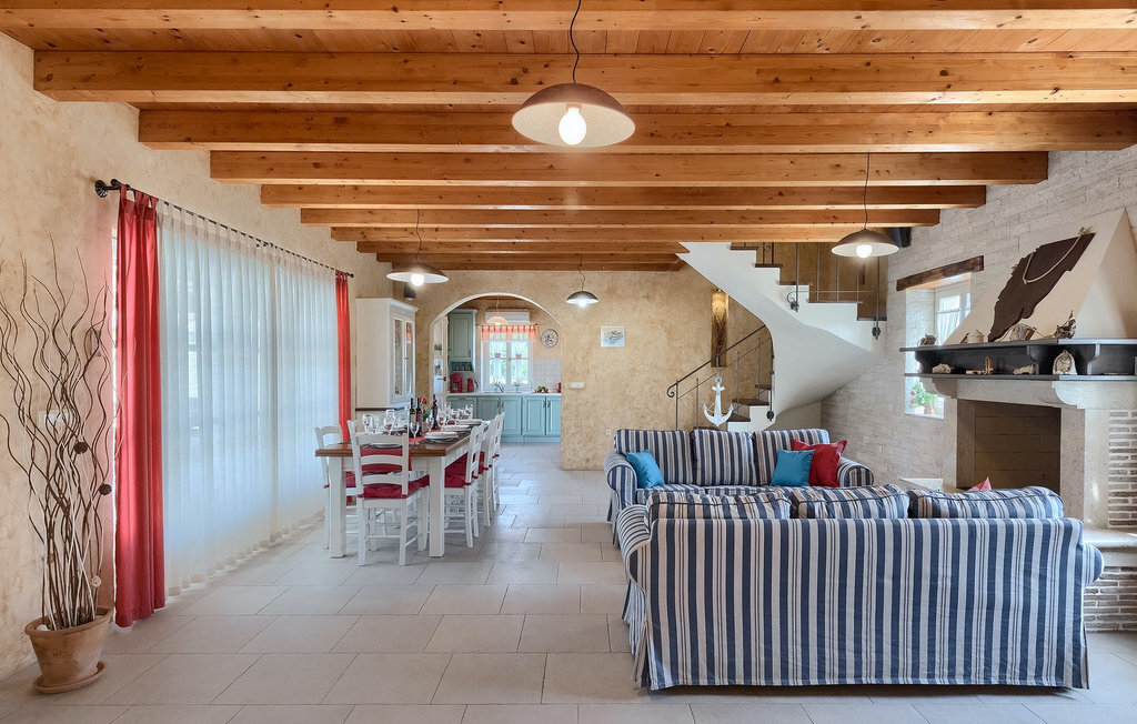 L'intérieur est vaste et ouvert, et l'aménagement élégant du rez-de-chaussée est très familier grâce aux poutres en bois et à la belle cheminée. Outre le salon et la salle à manger, on y trouve une jolie cuisine entièrement équipée, des toilettes pour les invités, deux chambres à coucher lumineuses et deux salles de bains. Un escalier mène à l'étage supérieur, où se trouvent deux autres chambres à coucher confortables et deux salles de bains modernes.