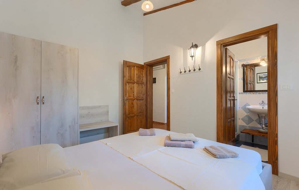 Une grande porte relie le salon avec cheminée au rez-de-chaussée au grand espace extérieur avec piscine et terrasse, ce qui laisse entrer beaucoup de lumière dans la pièce. Au rez-de-chaussée se trouve également une cuisine entièrement équipée avec une grande salle à manger rustique où l'on peut planifier des repas en commun. Les deux chambres à coucher du rez-de-chaussée sont équipées de lits doubles. L'une des chambres du rez-de-chaussée dispose d'une salle de bain privée avec douche, tandis que l'accès à l'autre salle de bain avec douche se fait par le couloir.