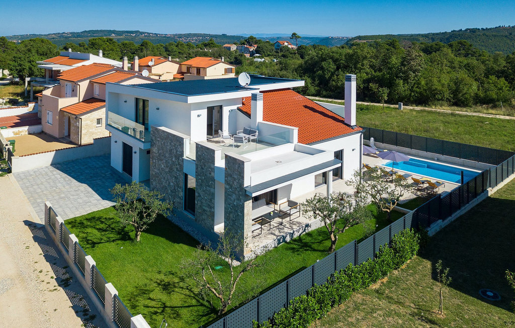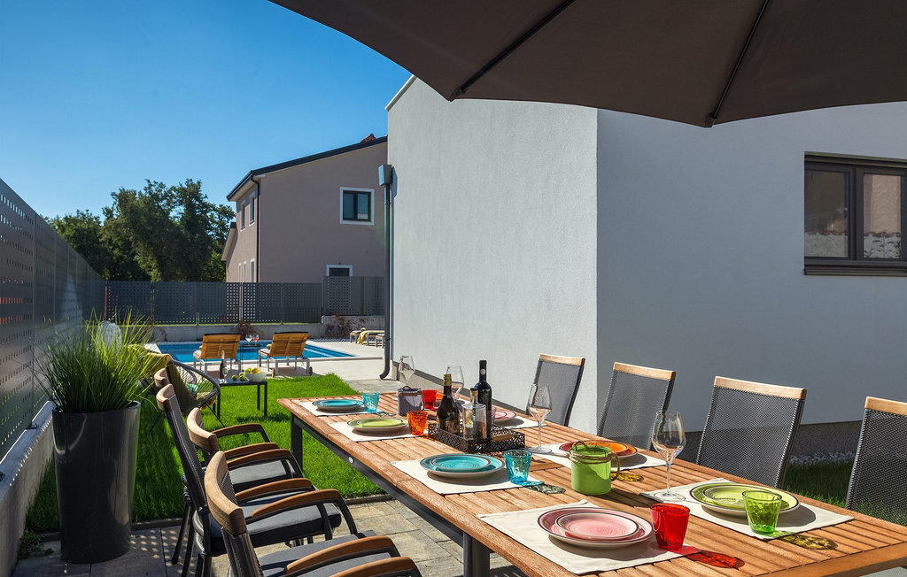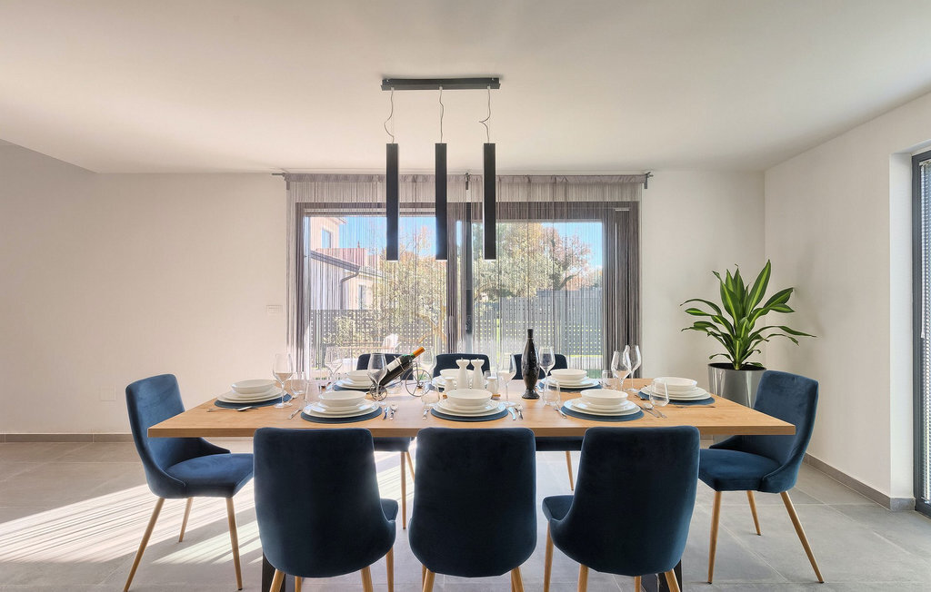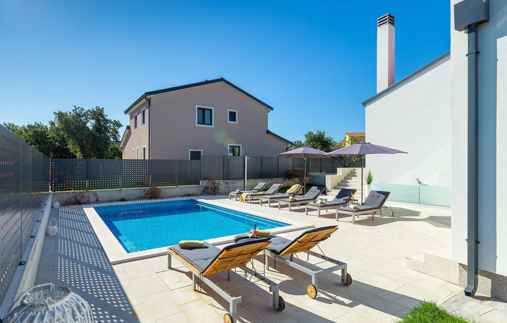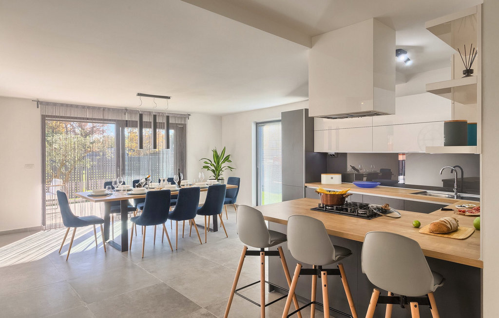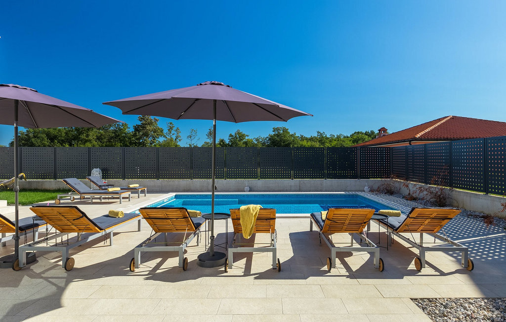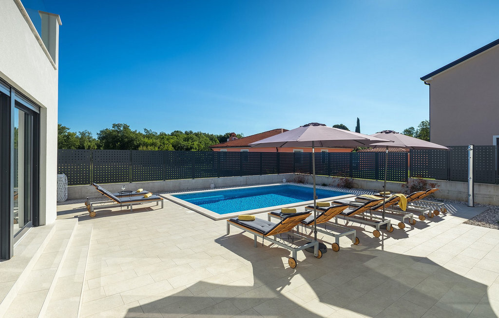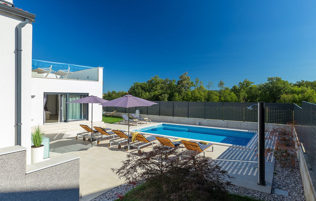 L'élégante Villa Dolcea est une villa de 4 pièces située dans le charmant village de Kastel, à environ 8 km de la mer. La villa est parfaite pour tous ceux qui souhaitent se détendre dans une atmosphère paisible et une nature idyllique. Pouvez-vous vous imaginer en train de vous détendre sur les confortables chaises longues à côté de la piscine ? Le rez-de-chaussée se compose d'un salon à la décoration moderne, de deux chambres confortables avec des lits doubles et d'une cuisine et d'une salle à manger spacieuses et entièrement équipées, toutes deux inondées de lumière. Les deux autres chambres se trouvent à l'étage. Vous pouvez faire le plein de soleil d'Istrie non seulement à côté de la piscine, mais aussi sur la charmante terrasse du premier étage.