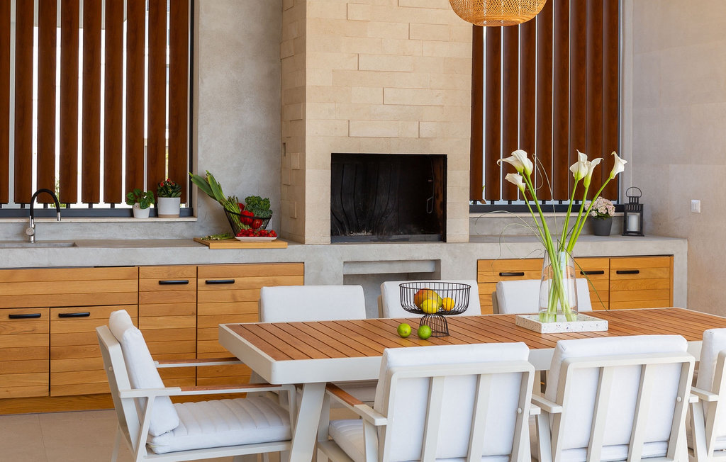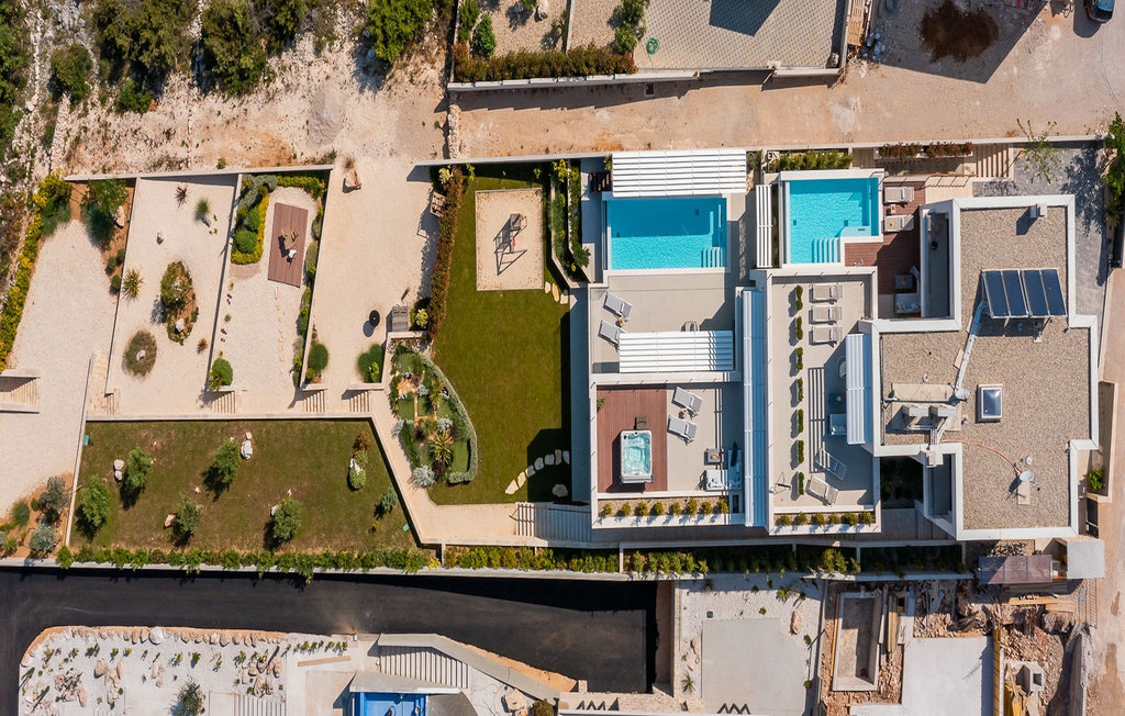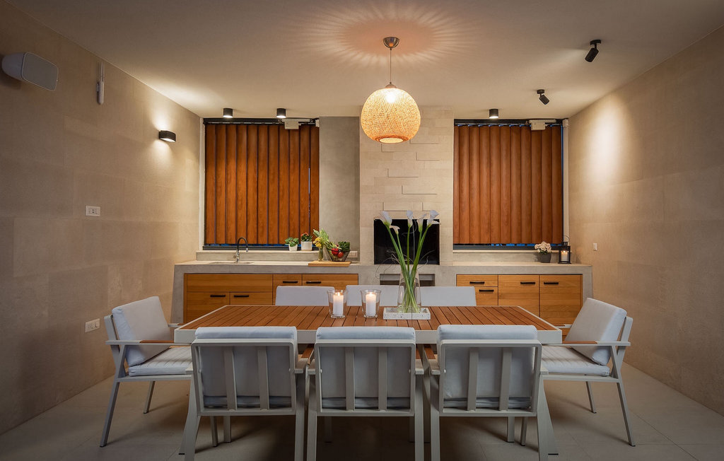 Au rez-de-chaussée, profitez de la piscine privée avec hydromassage avec une vue incontournable sur la mer. Après vous être rafraîchi, vous pourrez prendre le soleil sur les chaises longues ou vous reposer sur les meubles de jardin. Que ce soit en journée ou en soirée, la terrasse au bord de la piscine avec sa grande table à manger est parfaite pour les repas en commun, que vous pouvez préparer immédiatement dans la cuisine extérieure équipée.