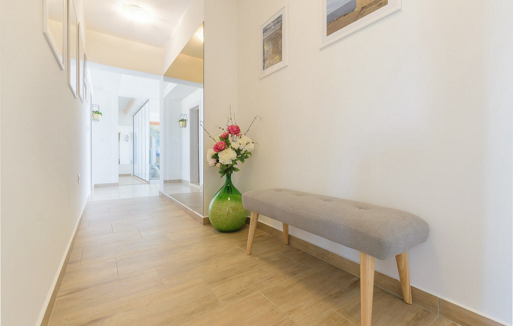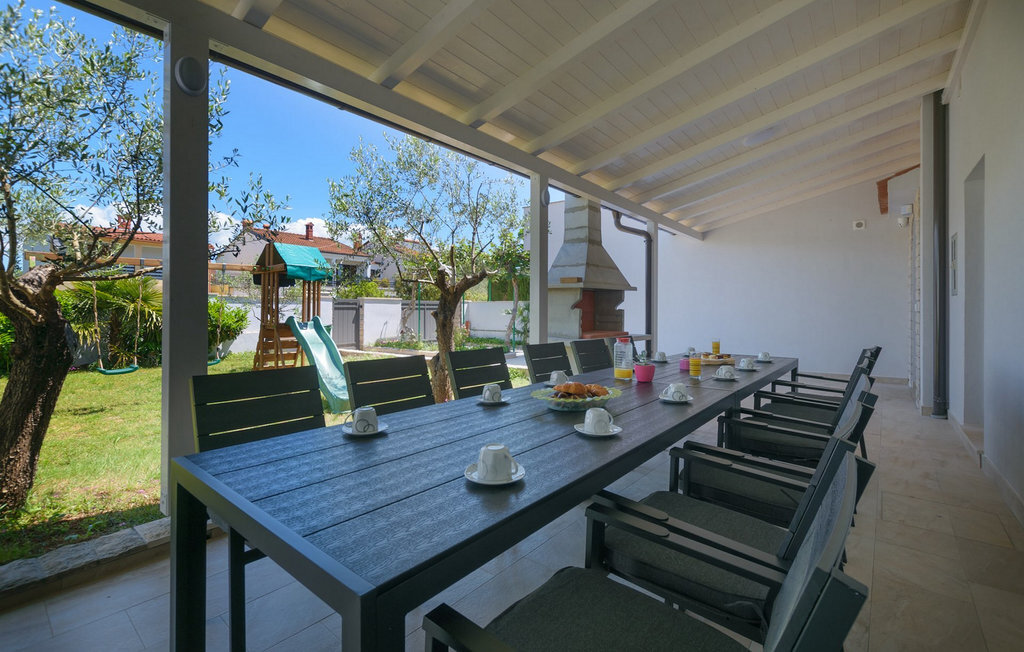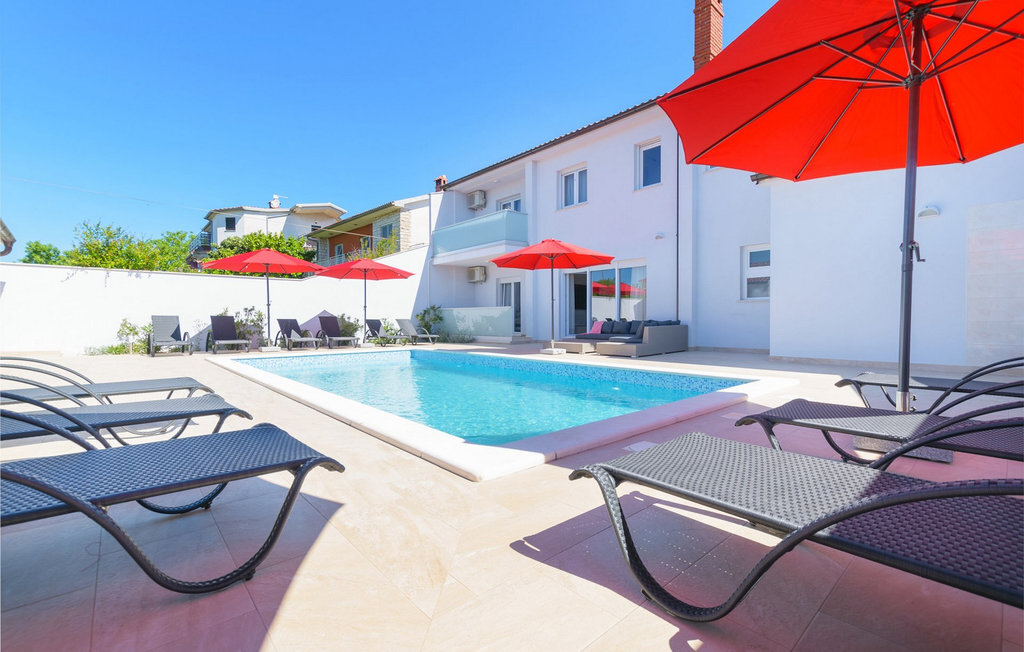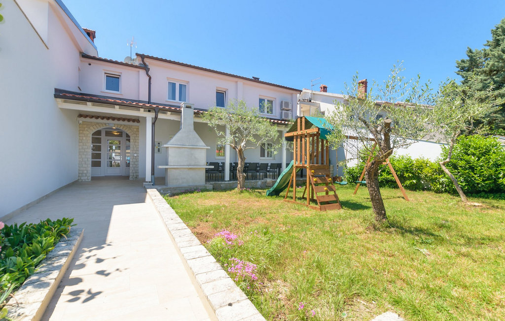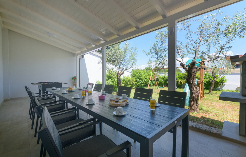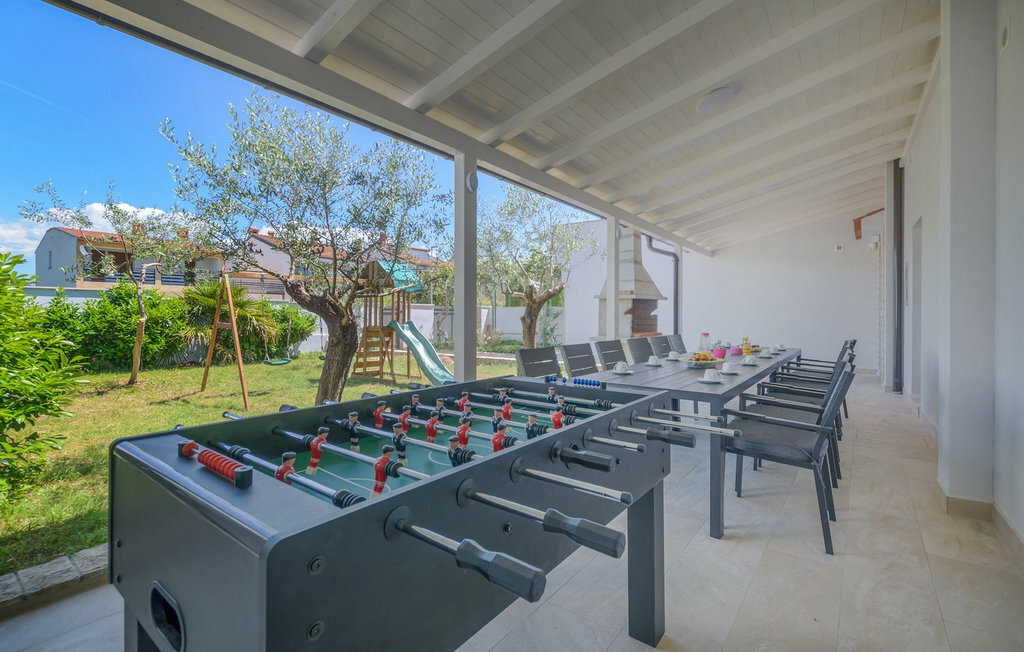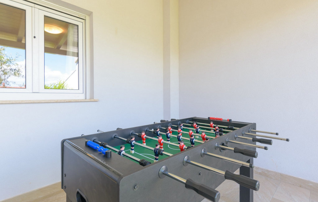La Villa Mala Vala, située sur la côte ouest de l'Istrie, vous invite à passer des vacances relaxantes à proximité de la mer. Le logement, qui peut accueillir jusqu'à 12 personnes, dispose au rez-de-chaussée d'un concept d'espace libre, grâce auquel le salon, la salle à manger et la cuisine sont reliés entre eux. La pièce spacieuse et lumineuse avec des accents de couleurs chaudes crée une atmosphère confortable. Outre le canapé, les fenêtres du sol au plafond vous offrent une belle vue et un accès direct au jardin et à la piscine privée. Dans la cuisine, vous pouvez vous préparer un espresso d'une excellente texture et le déguster sur la terrasse avec vue sur le jardin. Au rez-de-chaussée, vous trouverez également deux des six chambres à coucher, dont l'une a accès à la terrasse. À l'étage supérieur, les autres chambres à coucher vous attendent, dont une avec un balcon privé. Toutes les chambres de cette villa ont leur propre salle de bains avec douche à l'italienne. En outre, ce logement donnera à vos vacances un niveau de détente supplémentaire - un espace bien-être est à votre disposition à l'étage supérieur. Vous pourrez y profiter du sauna et du jacuzzi. Dehors, vous pouvez vous rafraîchir dans la piscine privée pendant les chaudes journées d'été, prendre un peu de soleil sur les chaises longues ou vous asseoir sur le confortable salon de jardin. Sur la terrasse, il y a un espace barbecue avec un gril et une table à manger, ce qui vous permet de préparer de délicieux repas en plein air. Si vous cherchez à vous amuser, le baby-foot est une bonne idée sur cette terrasse et les petits peuvent en plus profiter de l'aire de jeux. Rendez vos prochaines vacances agréables et mémorables - réservez la Villa Mala Vala dès maintenant.La Villa Mala Vala est située dans le village de Valbandon, à côté de la pittoresque ville de pêcheurs de Faana. Le littoral de Valbandon à Faana est particulièrement connu pour ses longues plages de galets, qui vous motiveront à y passer une belle journée de détente. Vous pouvez profiter du bord de mer aussi bien pour faire de longues promenades que pour pratiquer des activités sportives. Vous trouverez de nombreux restaurants dans les environs, notamment des tavernes traditionnelles - ne manquez pas de goûter aux spécialités istriennes. Vous aurez peut-être l'occasion de participer à la fête Valbandon ispod ripnje, où l'on propose des plats autochtones et locaux rôtis sous la cloche - faites-vous plaisir ! N'oubliez pas de visiter Faana, d'où vous pourrez rejoindre le parc national de Brijuni en bateau - une idée parfaite pour une excursion d'une journée. De plus, vous devriez vous promener dans la plus grande ville d'Istrie, Pula, pleine de monuments historiques comme le célèbre amphithéâtre, appelé Arena, et profiter de son atmosphère authentique.