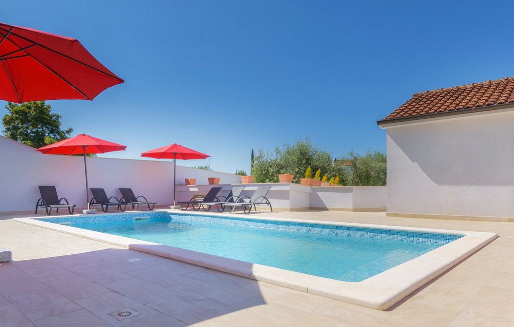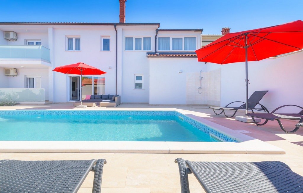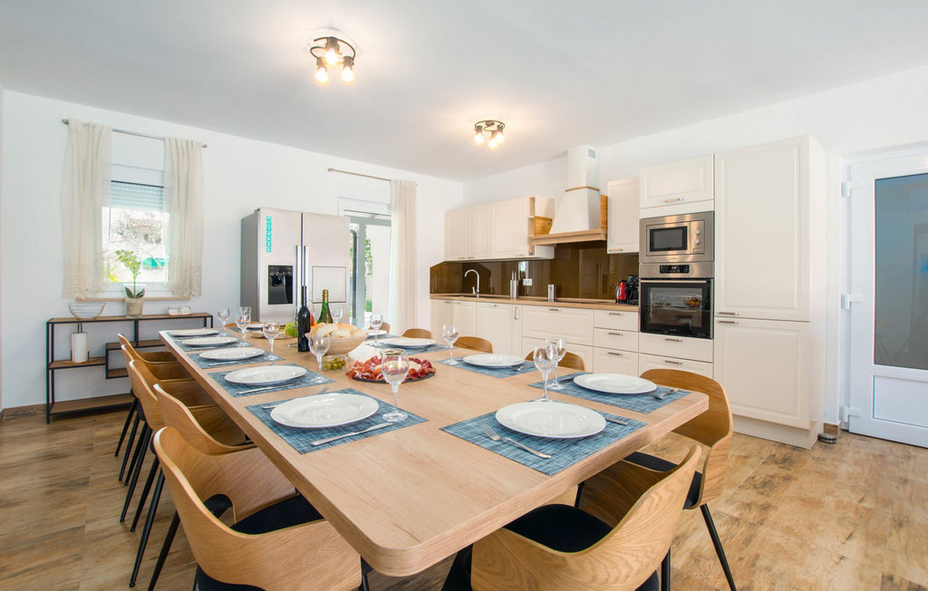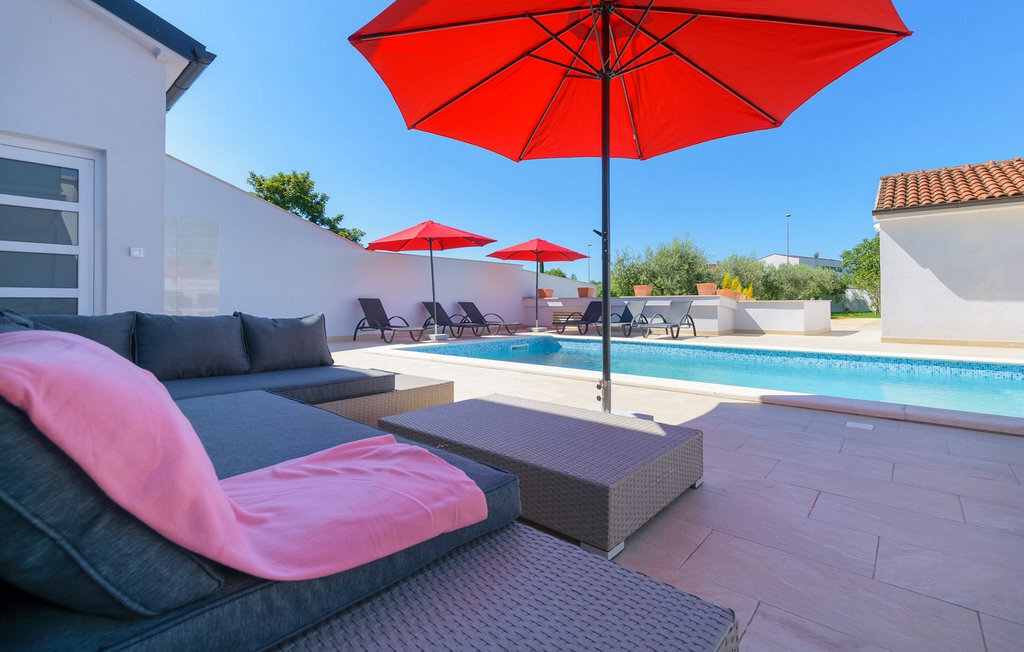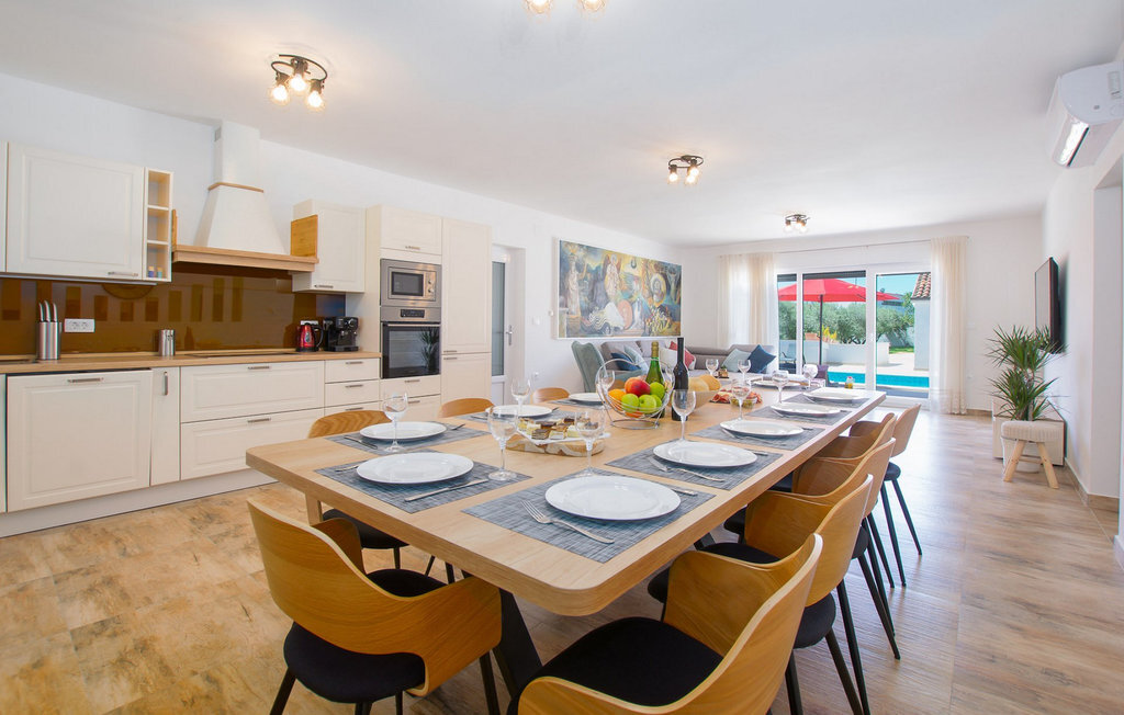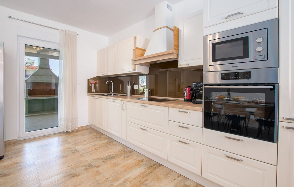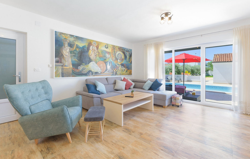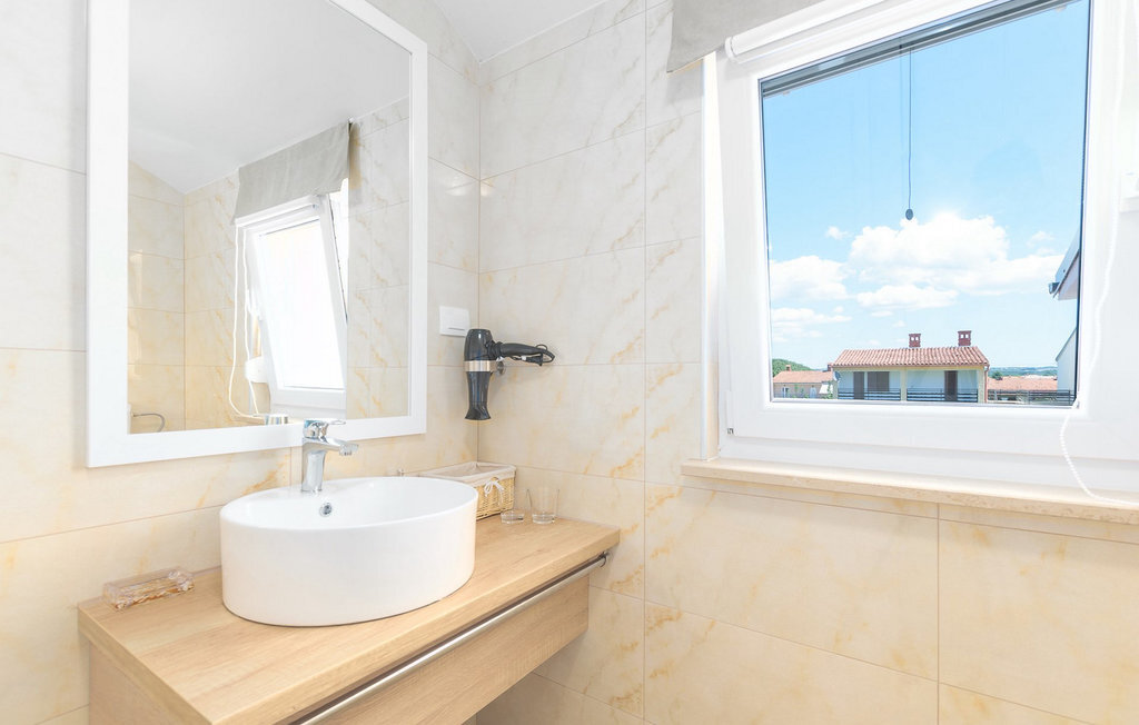 La Villa Mala Vala, située sur la côte ouest de l'Istrie, vous invite à passer des vacances relaxantes à proximité de la mer. Le logement, qui peut accueillir jusqu'à 12 personnes, dispose au rez-de-chaussée d'un concept d'espace libre, grâce auquel le salon, la salle à manger et la cuisine sont reliés entre eux. La pièce spacieuse et lumineuse avec des accents de couleurs chaudes crée une atmosphère confortable. Outre le canapé, les fenêtres du sol au plafond vous offrent une belle vue et un accès direct au jardin et à la piscine privée. Dans la cuisine, vous pouvez vous préparer un espresso d'une excellente texture et le déguster sur la terrasse avec vue sur le jardin. Au rez-de-chaussée, vous trouverez également deux des six chambres à coucher, dont l'une a accès à la terrasse. À l'étage supérieur, les autres chambres à coucher vous attendent, dont une avec un balcon privé. Toutes les chambres de cette villa ont leur propre salle de bains avec douche à l'italienne. En outre, ce logement donnera à vos vacances un niveau de détente supplémentaire - un espace bien-être est à votre disposition à l'étage supérieur. Vous pourrez y profiter du sauna et du jacuzzi. Dehors, vous pouvez vous rafraîchir dans la piscine privée pendant les chaudes journées d'été, prendre un peu de soleil sur les chaises longues ou vous asseoir sur le confortable salon de jardin. Sur la terrasse, il y a un espace barbecue avec un gril et une table à manger, ce qui vous permet de préparer de délicieux repas en plein air. Si vous cherchez à vous amuser, le baby-foot est une bonne idée sur cette terrasse et les petits peuvent en plus profiter de l'aire de jeux. Rendez vos prochaines vacances agréables et mémorables - réservez la Villa Mala Vala dès maintenant.La Villa Mala Vala est située dans le village de Valbandon, à côté de la pittoresque ville de pêcheurs de Faana. Le littoral de Valbandon à Faana est particulièrement connu pour ses longues plages de galets, qui vous motiveront à y passer une belle journée de détente. Vous pouvez profiter du bord de mer aussi bien pour faire de longues promenades que pour pratiquer des activités sportives. Vous trouverez de nombreux restaurants dans les environs, notamment des tavernes traditionnelles - ne manquez pas de goûter aux spécialités istriennes. Vous aurez peut-être l'occasion de participer à la fête Valbandon ispod ripnje, où l'on propose des plats autochtones et locaux rôtis sous la cloche - faites-vous plaisir ! N'oubliez pas de visiter Faana, d'où vous pourrez rejoindre le parc national de Brijuni en bateau - une idée parfaite pour une excursion d'une journée. De plus, vous devriez vous promener dans la plus grande ville d'Istrie, Pula, pleine de monuments historiques comme le célèbre amphithéâtre, appelé Arena, et profiter de son atmosphère authentique.