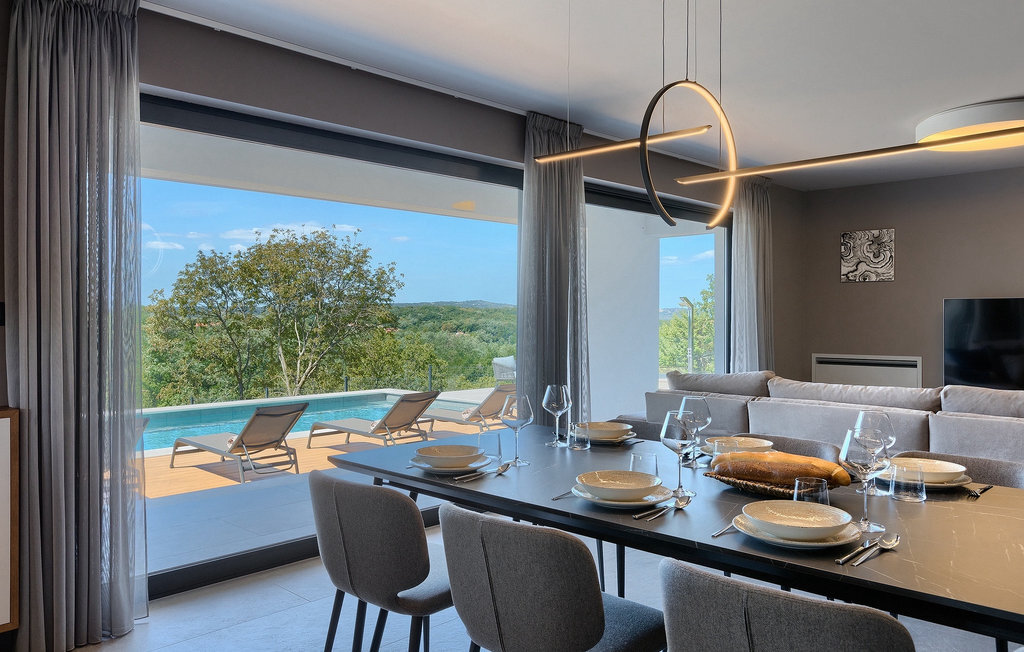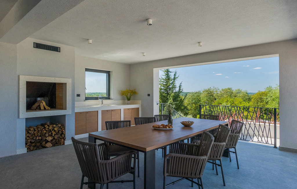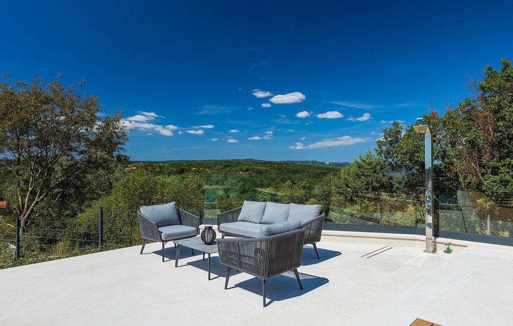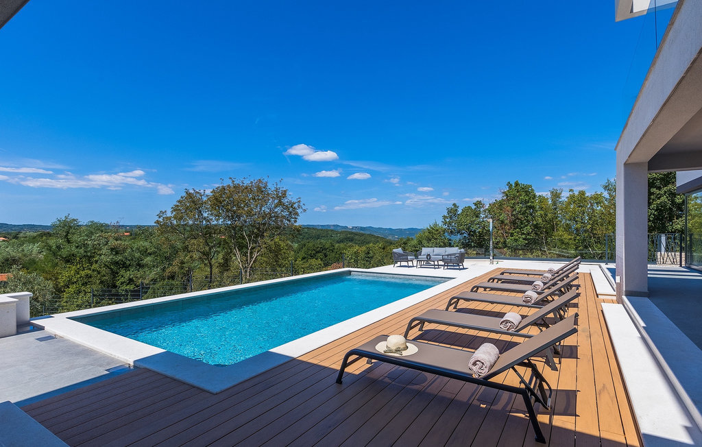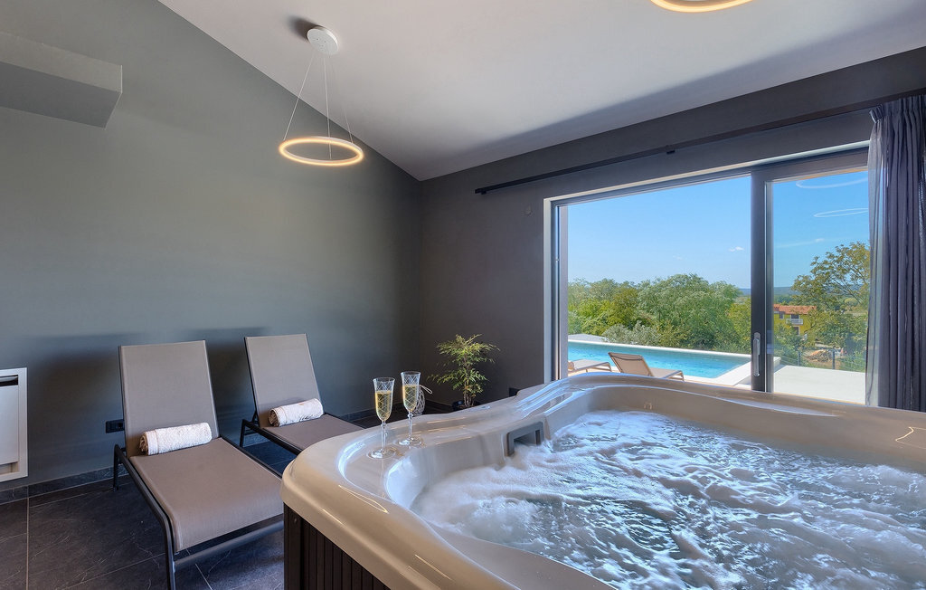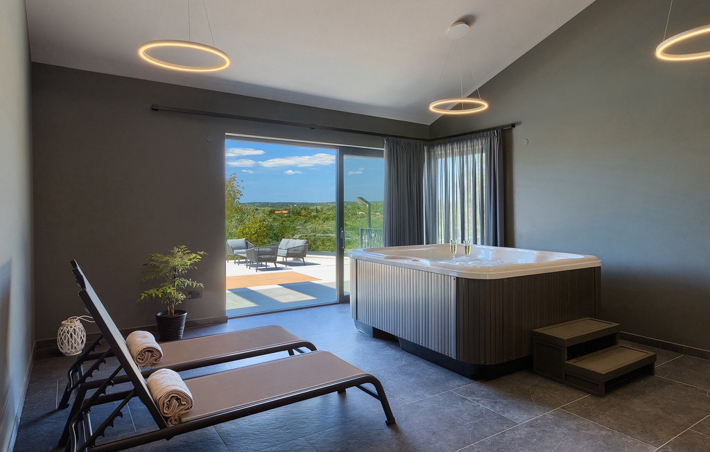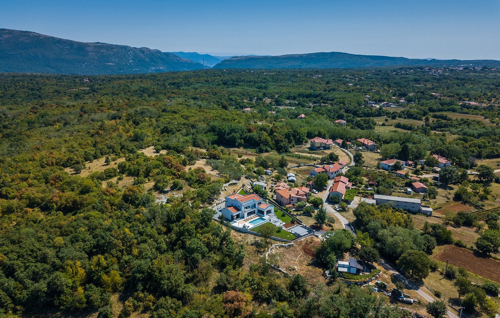 Offrez-vous un peu de luxe et passez vos vacances de rêve dans l'élégante villa La Guardia. Située dans un environnement calme et verdoyant près de Labin-Rabac, cette villa vous offre la détente à laquelle vous aspirez. La vue panoramique à couper le souffle sur le paysage verdoyant conquerra votre cœur. Votre deuxième regard se portera sur la magnifique piscine privée avec hydromassage qui se trouve au pied de la maison. Détendez-vous sur l'une des chaises longues au bord de la piscine ou dans l'espace bien-être de la Villa La Guardia - avec sauna et jacuzzi. Une grande terrasse couverte avec une petite cuisine d'été et un barbecue au charbon de bois est l'endroit idéal pour savourer de délicieux repas en famille ou entre amis et pour prolonger les longues soirées d'été. L'intérieur de la villa est élégant et aménagé avec goût. La grande baie vitrée de l'espace de vie ouvert rend la pièce à vivre lumineuse et aérée. Le rez-de-chaussée se compose de ce beau salon avec cheminée, d'une cuisine moderne entièrement équipée, d'une salle à manger pouvant accueillir jusqu'à 8 invités, d'une chambre confortable avec sa propre salle de bain chic et d'une oasis de bien-être avec sauna, jacuzzi et salle de bain correspondante. Au premier étage se trouvent trois chambres à coucher confortables, chacune avec sa propre salle de bain, ainsi qu'un agréable coin lecture. Les chambres climatisées sont toutes équipées de grands lits doubles confortables qui promettent un sommeil réparateur. Profitez de la vue fantastique depuis le balcon pour prendre votre première tasse de café le matin ou pour contempler les étoiles le soir. La Villa La Guardia est l'endroit que vous cherchez pour passer des vacances grandioses avec vos proches. N'hésitez plus, offrez-vous une touche de luxe et réservez la Villa La Guardia.La Villa La Guardia est située à umber, un quartier calme près de Labin-Rabac, à seulement 15 km de la plage la plus proche à Rabac. Entourée de collines et de champs verdoyants, vous trouverez ici la tranquillité que vous recherchez. Tout ce dont vous avez besoin pour la vie quotidienne se trouve à une distance d'environ 4-7 km. Le restaurant le plus proche se trouve à seulement 2 km. Découvrez cette belle région en vélo, explorez les plages et les baies de la côte est de l'Istrie ou visitez les nombreux petits villages environnants qui ont leur propre charme et où vous serez accueillis par des habitants accueillants. Faites une excursion à Pazin avec son célèbre château situé au bord d'une gorge profonde ou au parc naturel d'Ucka et profitez d'une vue à couper le souffle depuis son sommet. Ne manquez pas l'offre gastronomique variée et goûtez aux saveurs de l'Istrie.