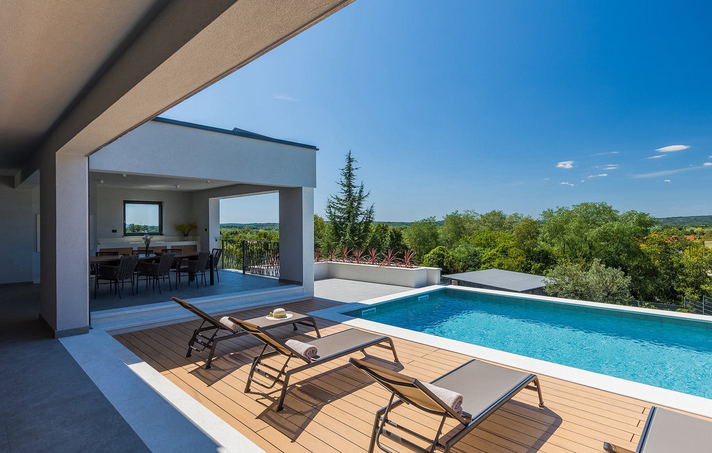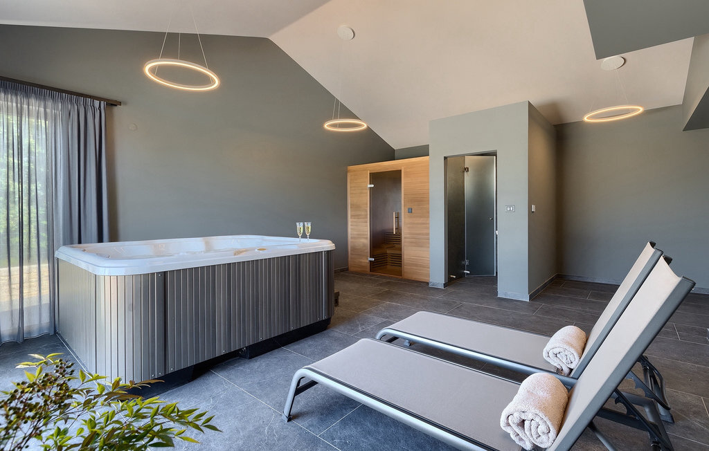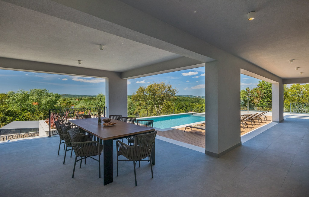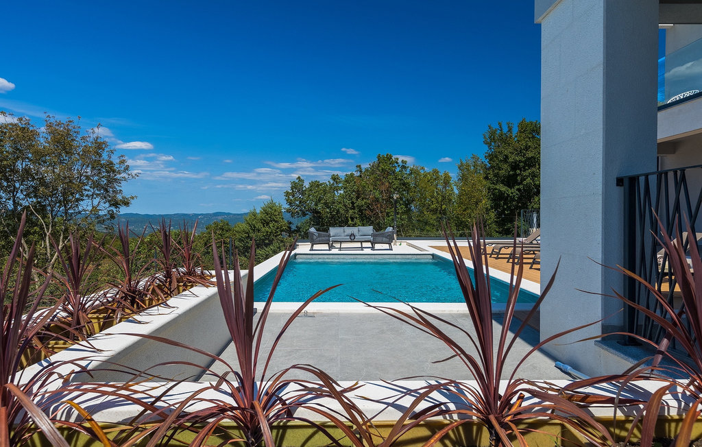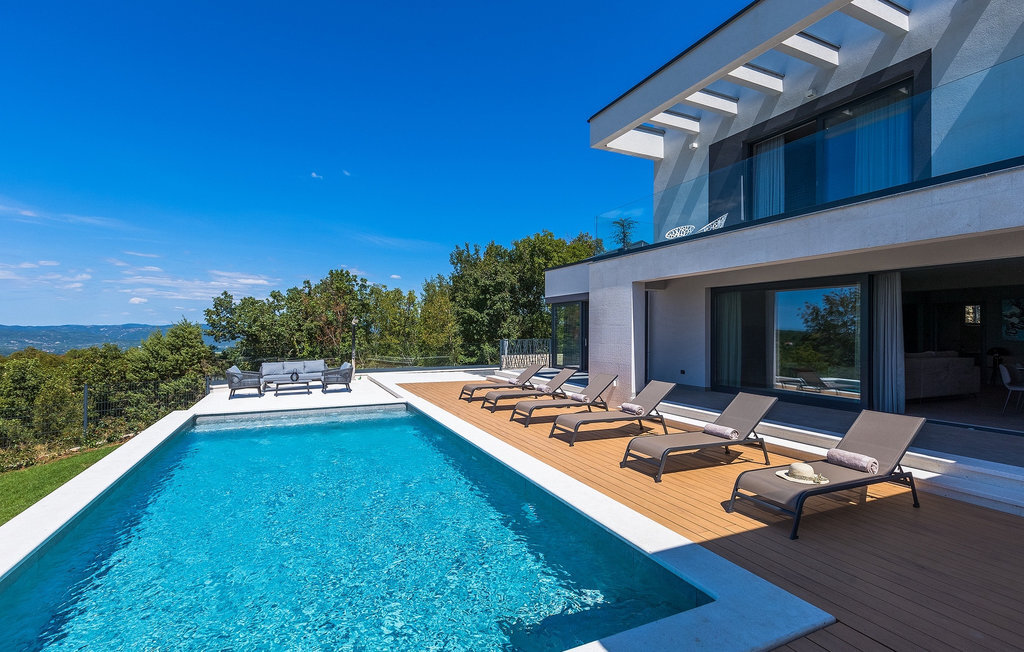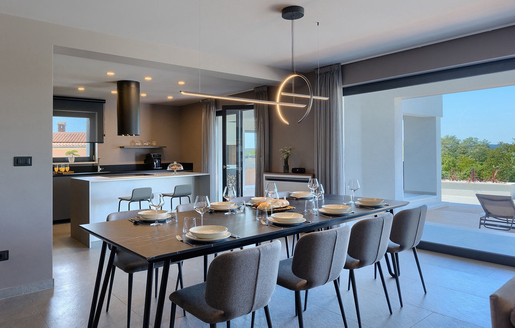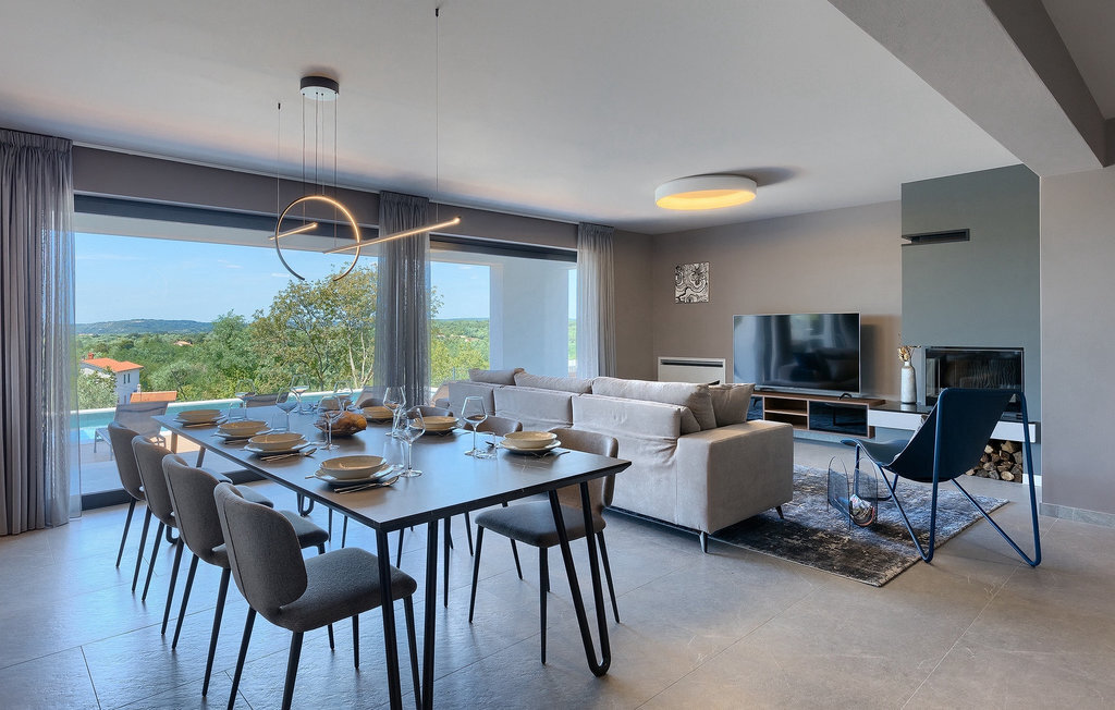 Offrez-vous un peu de luxe et passez vos vacances de rêve dans l'élégante villa La Guardia. Située dans un environnement calme et verdoyant près de Labin-Rabac, cette villa vous offre la détente à laquelle vous aspirez. La vue panoramique à couper le souffle sur le paysage verdoyant conquerra votre cœur. Votre deuxième regard se portera sur la magnifique piscine privée avec hydromassage qui se trouve au pied de la maison. Détendez-vous sur l'une des chaises longues au bord de la piscine ou dans l'espace bien-être de la Villa La Guardia - avec sauna et jacuzzi. Une grande terrasse couverte avec une petite cuisine d'été et un barbecue au charbon de bois est l'endroit idéal pour savourer de délicieux repas en famille ou entre amis et pour prolonger les longues soirées d'été. L'intérieur de la villa est élégant et aménagé avec goût. La grande baie vitrée de l'espace de vie ouvert rend la pièce à vivre lumineuse et aérée. Le rez-de-chaussée se compose de ce beau salon avec cheminée, d'une cuisine moderne entièrement équipée, d'une salle à manger pouvant accueillir jusqu'à 8 invités, d'une chambre confortable avec sa propre salle de bain chic et d'une oasis de bien-être avec sauna, jacuzzi et salle de bain correspondante. Au premier étage se trouvent trois chambres à coucher confortables, chacune avec sa propre salle de bain, ainsi qu'un agréable coin lecture. Les chambres climatisées sont toutes équipées de grands lits doubles confortables qui promettent un sommeil réparateur. Profitez de la vue fantastique depuis le balcon pour prendre votre première tasse de café le matin ou pour contempler les étoiles le soir. La Villa La Guardia est l'endroit que vous cherchez pour passer des vacances grandioses avec vos proches. N'hésitez plus, offrez-vous une touche de luxe et réservez la Villa La Guardia.La Villa La Guardia est située à umber, un quartier calme près de Labin-Rabac, à seulement 15 km de la plage la plus proche à Rabac. Entourée de collines et de champs verdoyants, vous trouverez ici la tranquillité que vous recherchez. Tout ce dont vous avez besoin pour la vie quotidienne se trouve à une distance d'environ 4-7 km. Le restaurant le plus proche se trouve à seulement 2 km. Découvrez cette belle région en vélo, explorez les plages et les baies de la côte est de l'Istrie ou visitez les nombreux petits villages environnants qui ont leur propre charme et où vous serez accueillis par des habitants accueillants. Faites une excursion à Pazin avec son célèbre château situé au bord d'une gorge profonde ou au parc naturel d'Ucka et profitez d'une vue à couper le souffle depuis son sommet. Ne manquez pas l'offre gastronomique variée et goûtez aux saveurs de l'Istrie.
