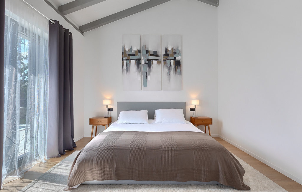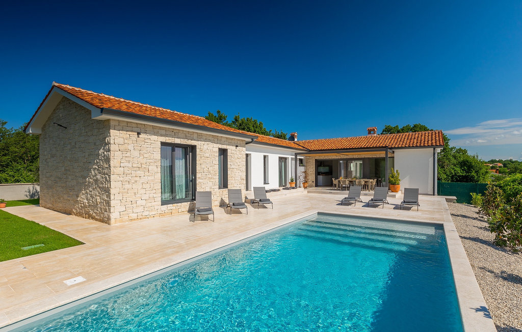Villa Gala est une magnifique maison d'un étage qui peut accueillir un groupe de voyageurs allant jusqu'à 6+1 personnes. L'extérieur et l'intérieur de cette villa sont reliés par un design moderne et neutre, tandis que la couleur bleue de la piscine et le jardin vert contrastent et créent ensemble une atmosphère apaisante et agréable. Détendez-vous donc à l'ombre des arbres du jardin, tout en lisant votre livre préféré ou en vous rafraîchissant dans la piscine. Bien entendu, des chaises longues sont à votre disposition autour de la piscine, ainsi qu'une table à manger en plein air où vous pourrez partager vos repas quotidiens. Une grande paroi en verre est la seule chose qui sépare cet espace de l'intérieur de la cuisine, de la salle à manger et du salon. En entrant dans ce plan spacieux et ouvert, la première chose qui vous frappe est la luminosité de la pièce et les poutres saillantes au plafond. Alors que vous passez vos soirées ensemble dans le salon à regarder des films ou à jouer à des jeux de société, la cuisine moderne offre tout ce dont vous avez besoin pour préparer des repas pour vos proches. Ensuite, il y a trois chambres à coucher spacieuses avec leur propre salle de bain. Mais la plus belle caractéristique des chambres à coucher est sans aucun doute les portes en double vitrage qui permettent un accès direct à la terrasse. Imaginez qu'en vous réveillant le matin, vous n'êtes qu'à quelques pas de la piscine ! Cette villa offre donc tout ce dont vous avez besoin pour passer des vacances confortables en famille ou entre amis.