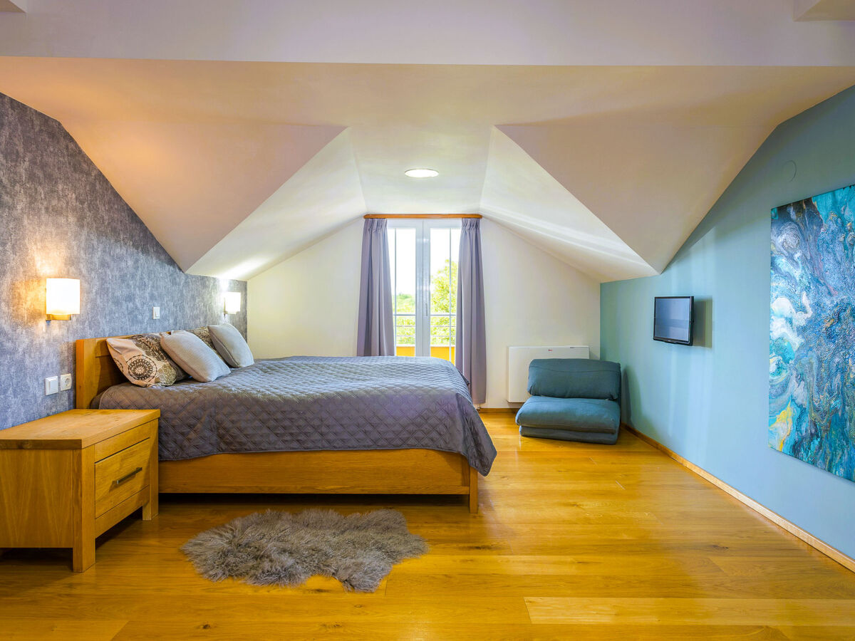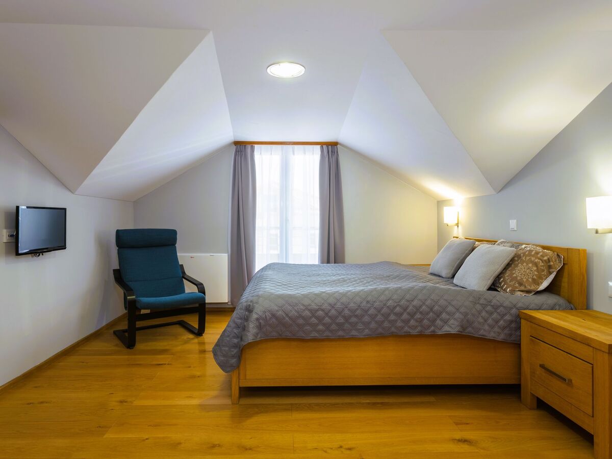1 chambre, mansardée avec 1 lit double (2 x 80 cm, longueur 200 cm), douche/WC et TV (satellite).