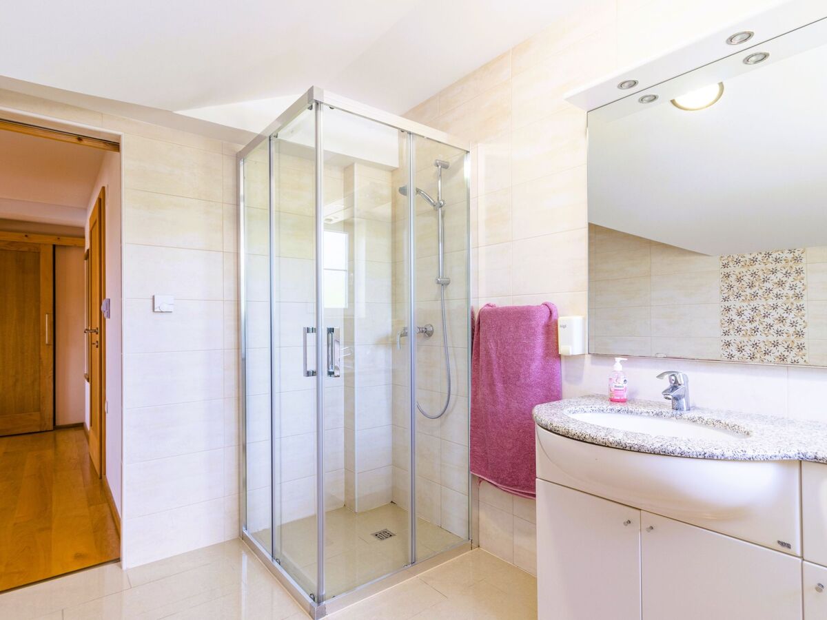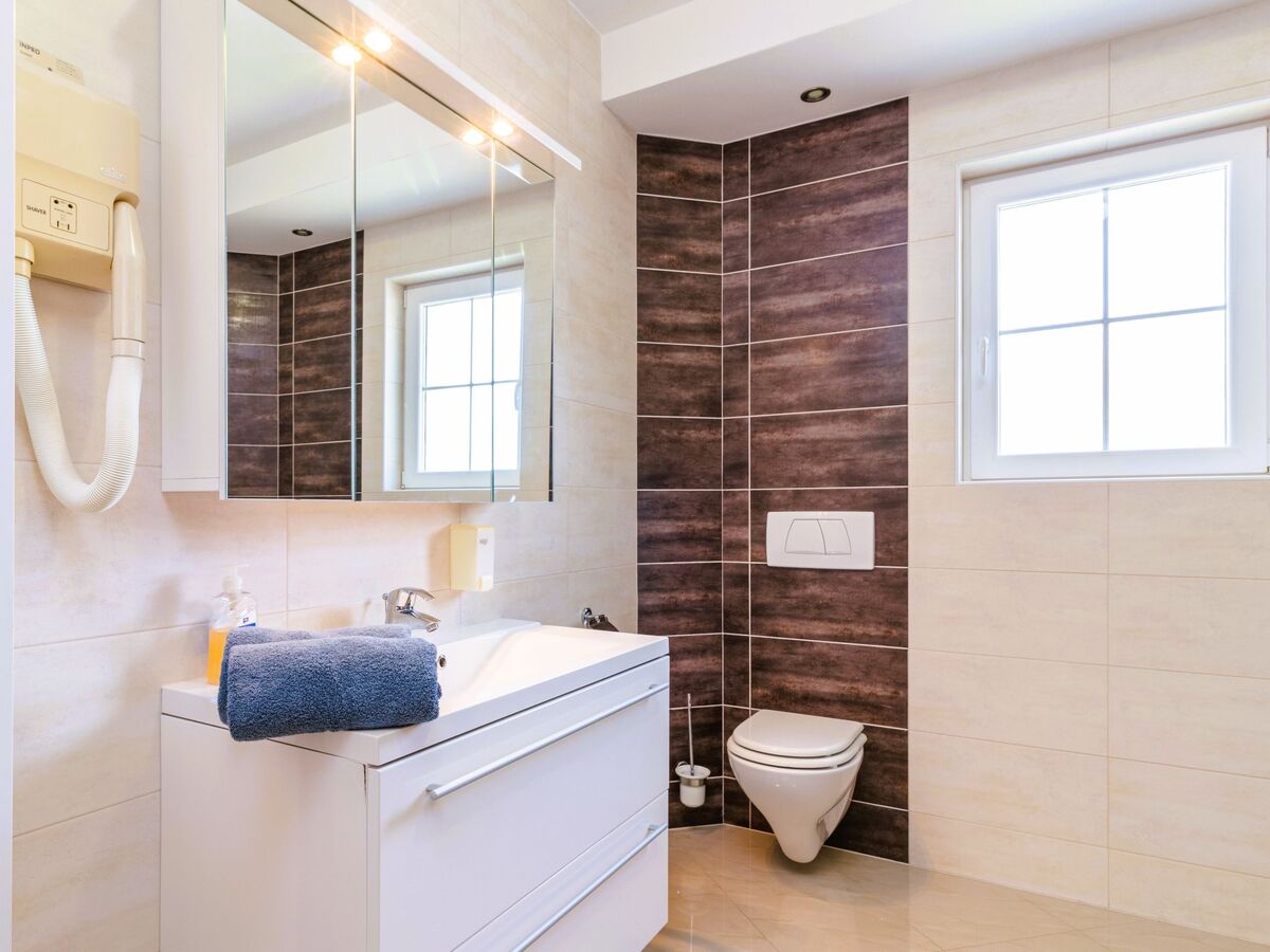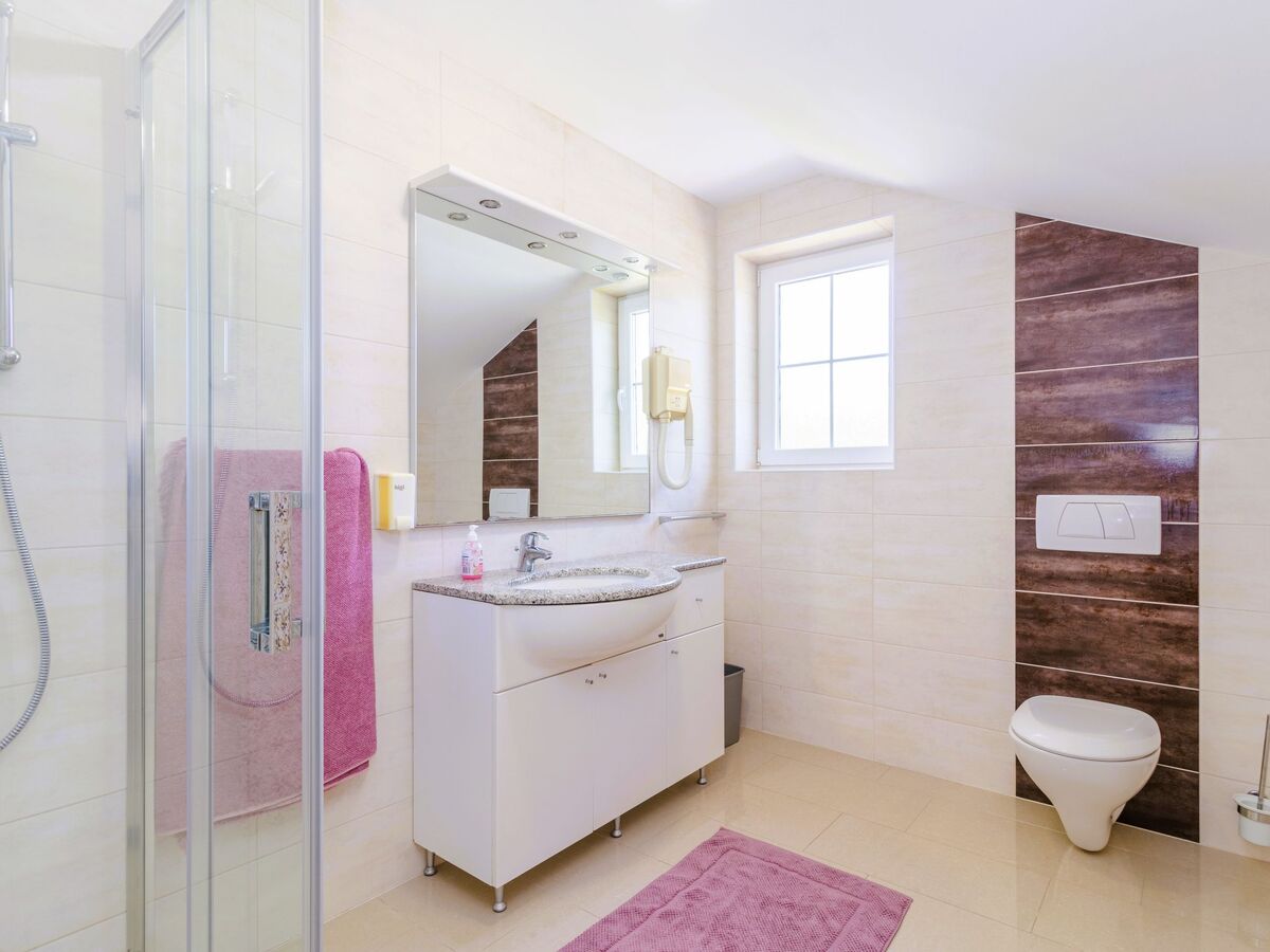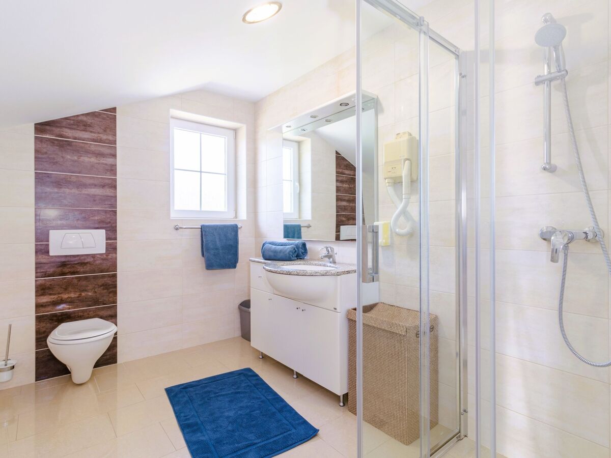 À l'étage supérieur: 1 chambre, mansardée avec 1 lit double (2 x 90 cm, longueur 200 cm), douche/WC et TV (satellite).