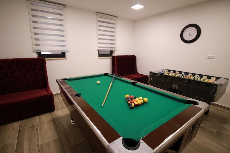 Rez-de-chaussée: (Salle de séjour(TV(écran plat, satellite), cheminée, coin salon), cuisine(table, grille-pain, plaque de cuisson, cafetière/percolateur, four, micro ondes, lave-vaisselle , combinaison réfrigérateur/congélateur), chambre(lit double, TV(écran plat, satellite)), salle de bains(douche, lavabo, WC), terrasse(privé)) Au 1er étage: (chambre avec salle de bains(lit double, TV(écran plat, satellite), douche, lavabo, WC), chambre avec salle de bains(lit double, TV(écran plat, satellite), douche, lavabo, WC), chambre avec salle de bains(lit double, TV(écran plat, satellite), douche, lavabo, WC), balcon) Sous-sol: (chambre avec salle de bains(lit double, douche, lavabo, WC), salle de jeux(TV(écran plat), coin salon, baby-foot, billard)) douche, lave-linge , climatisation, terrasse(privé), jardin(privé), mobilier de jardin, transats, barbecue, parking, parasol, piscine(privé), table à repasser, fer à repasser, salon de jardin