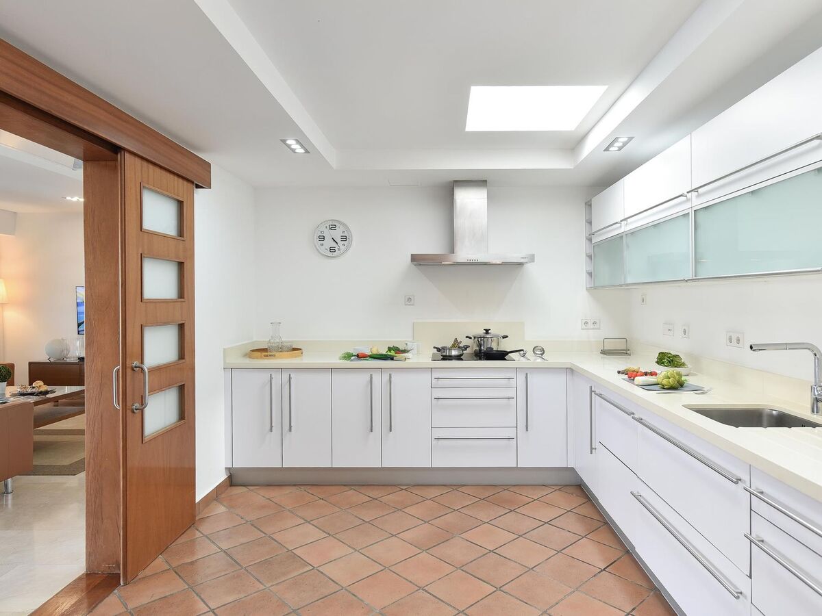 Cuisine (four, lave-vaisselle, 3 plaques vitrocéramiques, micro-ondes, congélateur) avec table pour les repas.