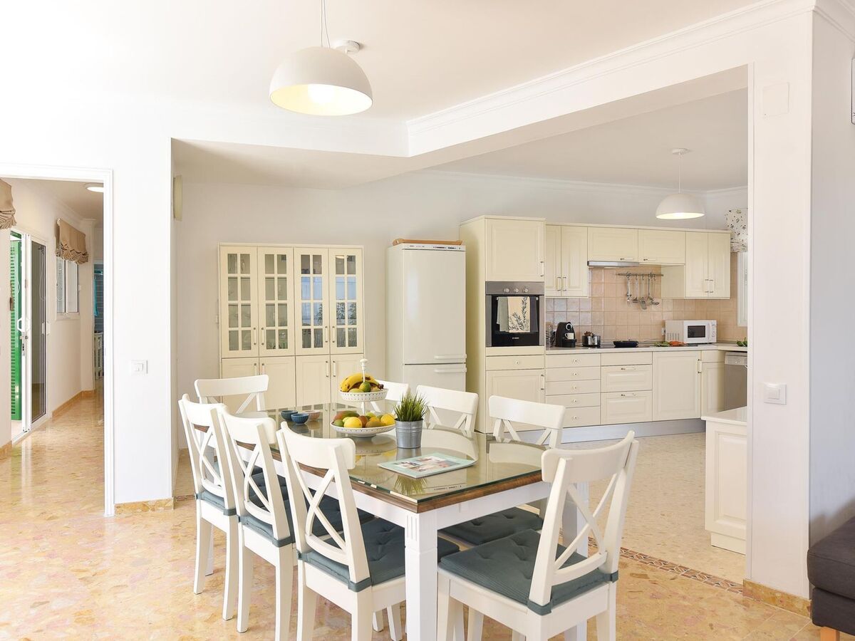 Cuisine/séjour (four, lave-vaisselle, grille-pain, bouilloire électrique, micro-ondes, congélateur, cafetière électrique) avec table pour les repas et air-conditionné.