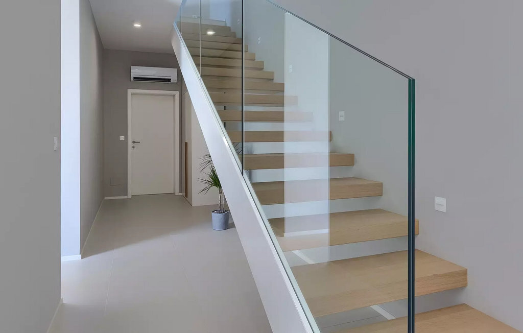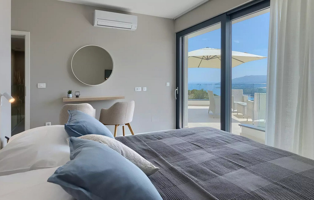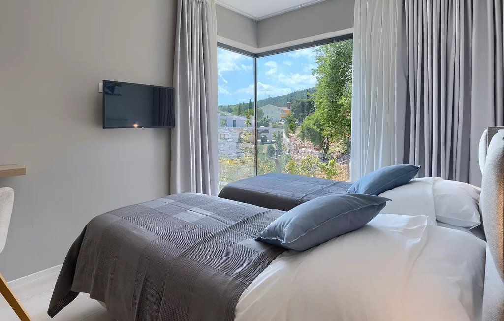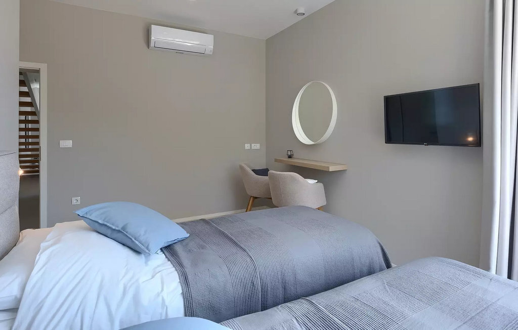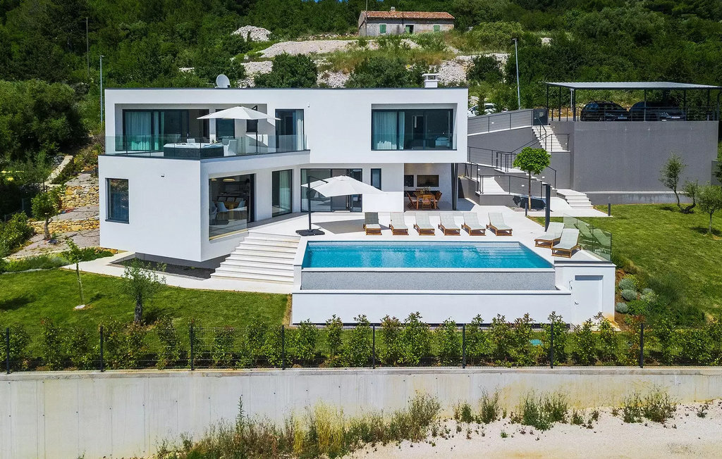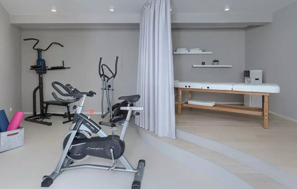 Cette villa moderne est divisée en trois étages spacieux. Au sous-sol de la villa, vous trouverez une salle de fitness avec des appareils d'entraînement que vous pourrez utiliser si vous êtes un fan d'activités et de fitness. À côté de la salle de fitness, il y a une table de massage pour ceux qui aiment le bien-être et la détente. Le rez-de-chaussée de la villa est spacieux avec des murs en verre qui offrent une vue panoramique sur la mer et les environs. On y trouve une cuisine équipée avec coin repas, un salon avec accès direct à la terrasse avec piscine, des toilettes pour les invités, une buanderie entièrement équipée et une chambre double avec deux lits simples, télévision et climatisation et salle de bain en suite. Au premier étage se trouvent trois chambres à coucher doubles avec lits doubles, TV et climatisation et salle de bain en suite. Les chambres disposent d'une terrasse avec vue sur la ville, la mer et les îles, où vous pourrez déguster votre café du matin.