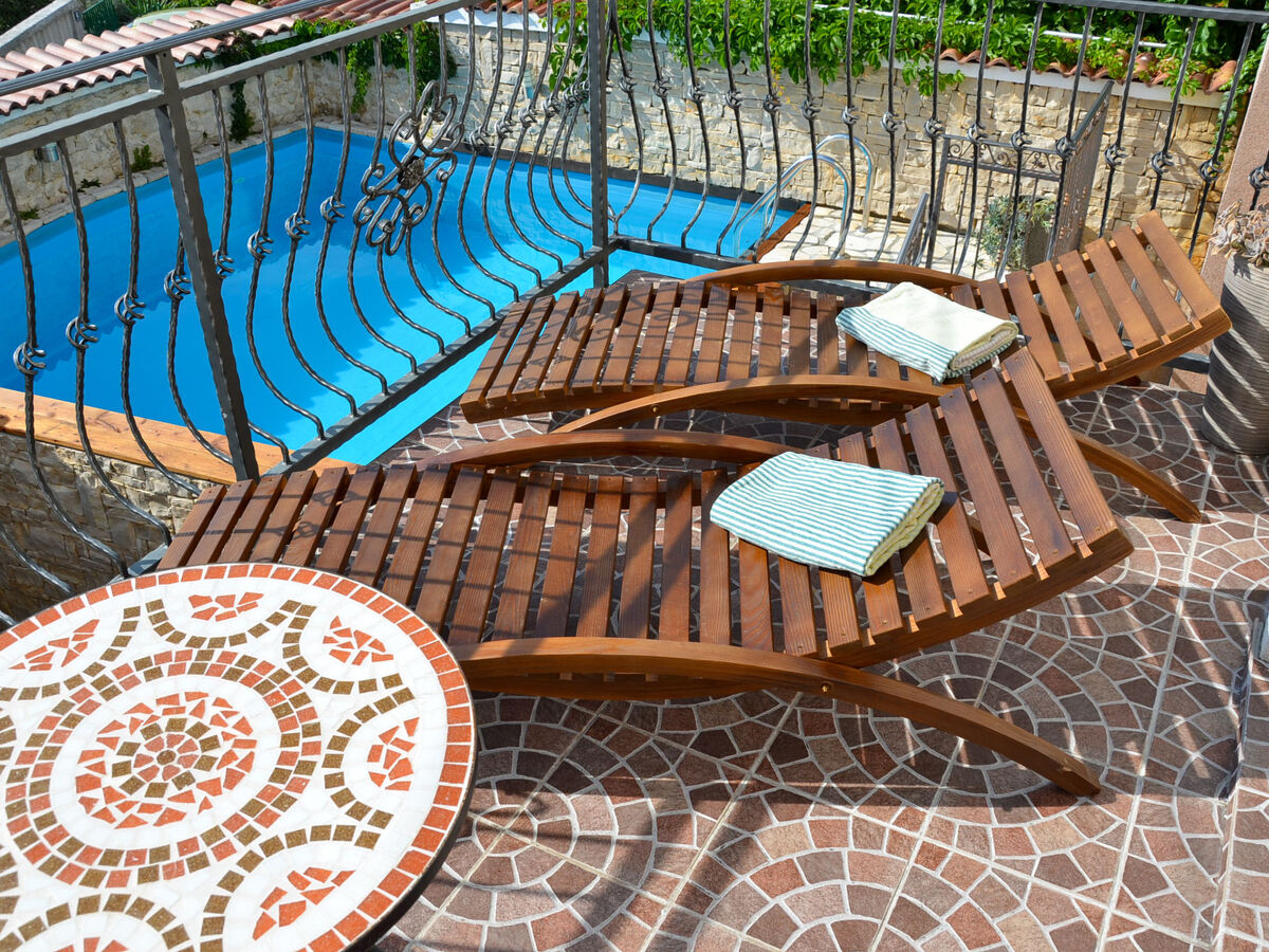 Meubles de terrasse, mobilier de balcon, barbecue, chaises longues.