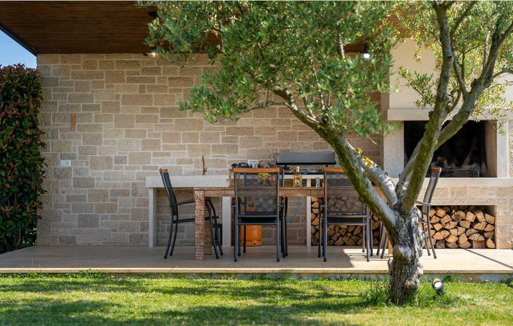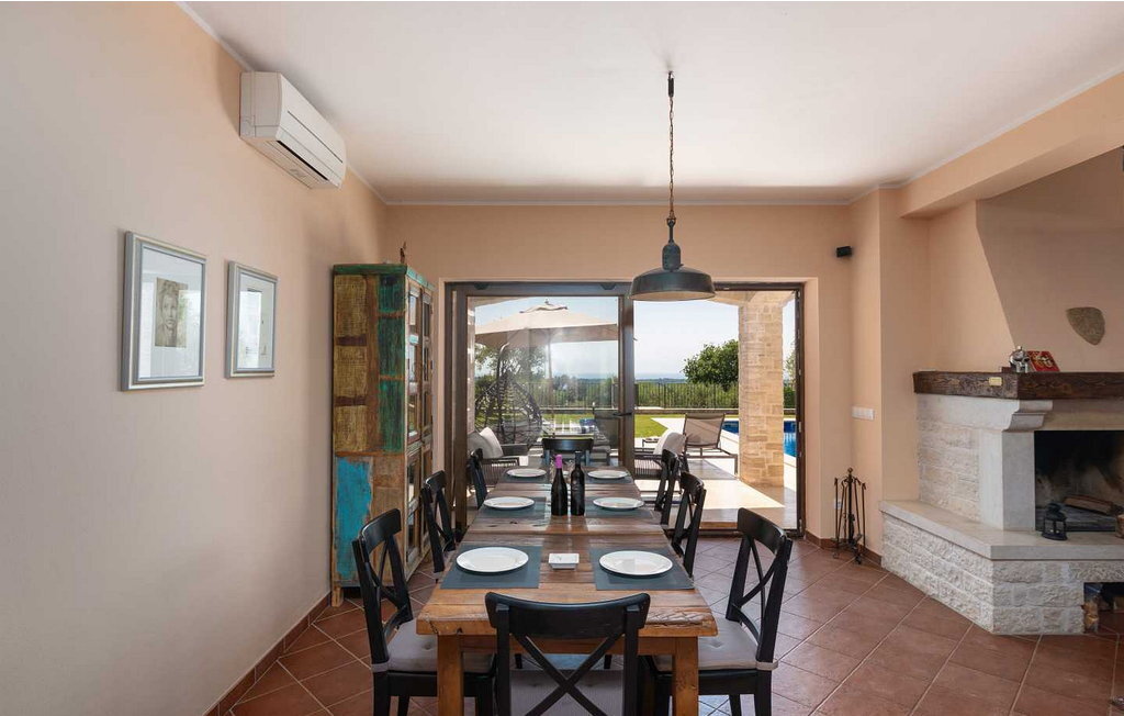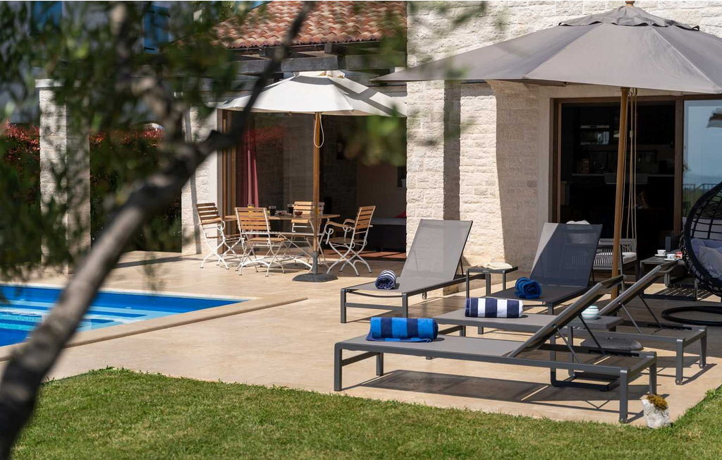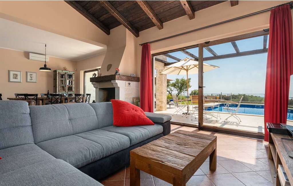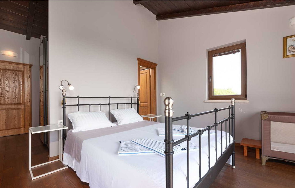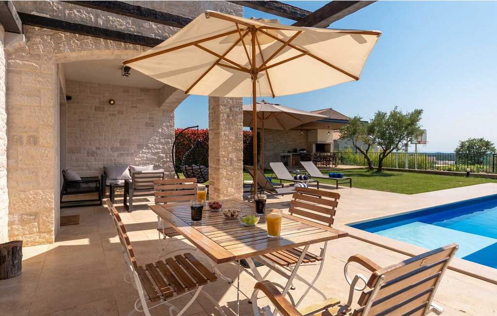 La villa a été construite en 2014 et dispose d'un terrain clôturé avec une pelouse bien entretenue et une oliveraie d'une superficie de 1500 m², située sur une place calme d'où l'on peut profiter d'une magnifique vue panoramique sur la mer, encore plus accentuée par les parois en verre dans toutes les pièces qui font face à la mer. L'originalité de cette villa réside dans le fait que le salon et la chambre à coucher du rez-de-chaussée sont reliés par plusieurs baies vitrées à une grande terrasse, les deux unités ne faisant plus qu'une. Pour que les hôtes se sentent bien, la villa est équipée d'un excellent système de son avec 6 haut-parleurs, d'une grande cheminée dans le salon et d'une combinaison attrayante de meubles rustiques massifs (en partie anciens) et de détails en pierre. La villa offre à ses hôtes les équipements extérieurs suivants : parking privé pour deux voitures, piscine de 32 m² avec chaises longues, terrasse couverte avec salon.