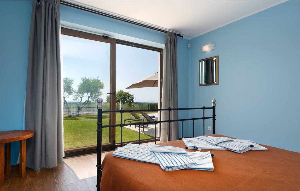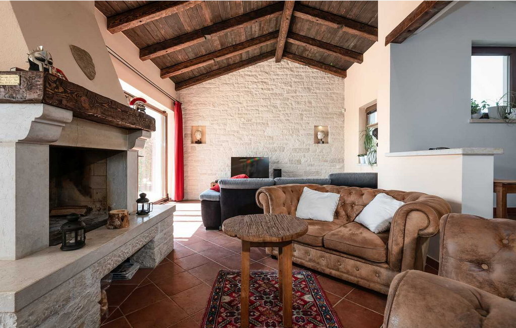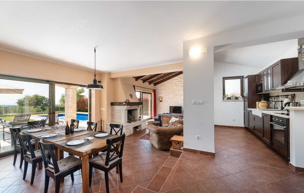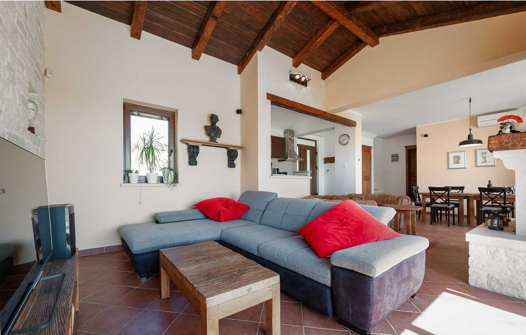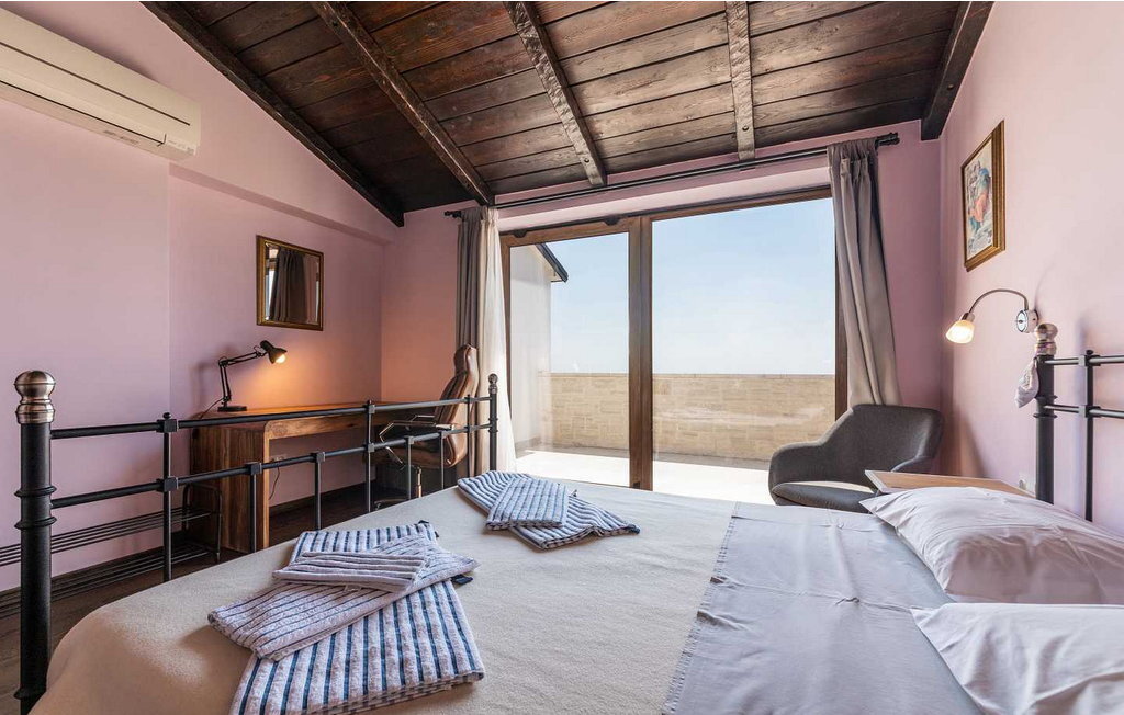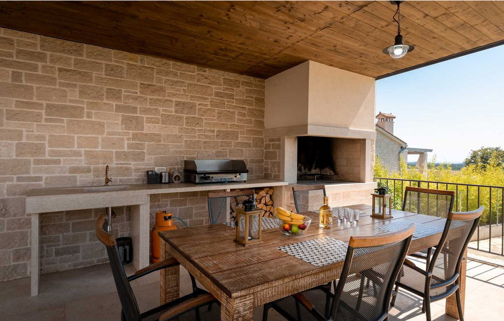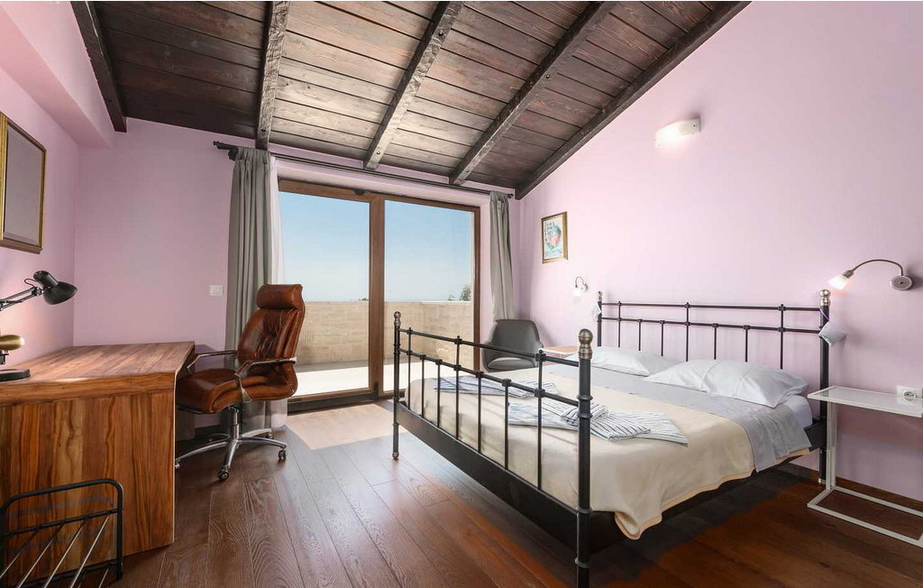 La villa a été construite en 2014 et dispose d'un terrain clôturé avec une pelouse bien entretenue et une oliveraie d'une superficie de 1500 m², située sur une place calme d'où l'on peut profiter d'une magnifique vue panoramique sur la mer, encore plus accentuée par les parois en verre dans toutes les pièces qui font face à la mer. L'originalité de cette villa réside dans le fait que le salon et la chambre à coucher du rez-de-chaussée sont reliés par plusieurs baies vitrées à une grande terrasse, les deux unités ne faisant plus qu'une. Pour que les hôtes se sentent bien, la villa est équipée d'un excellent système de son avec 6 haut-parleurs, d'une grande cheminée dans le salon et d'une combinaison attrayante de meubles rustiques massifs (en partie anciens) et de détails en pierre. La villa offre à ses hôtes les équipements extérieurs suivants : parking privé pour deux voitures, piscine de 32 m² avec chaises longues, terrasse couverte avec salon.
