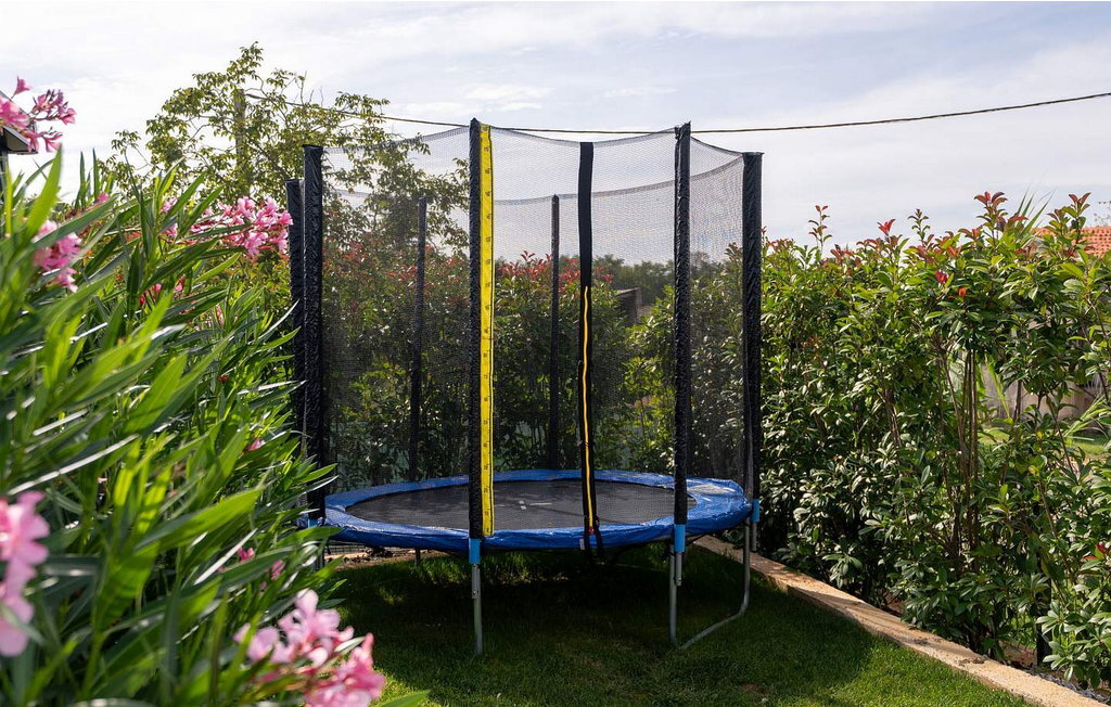 Sur un terrain clôturé de 300 m², les hôtes ont à leur disposition des chaises longues, des sièges, un barbecue à gaz Weber et une piscine de 32 m². Un trampoline et un badminton sont également proposés.