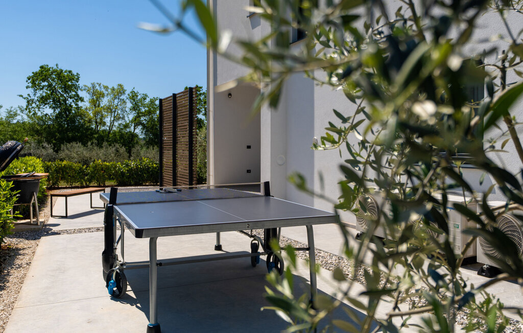 Sur le terrain entièrement clôturé, les hôtes ont à leur disposition une piscine d'eau salée, des chaises longues pour prendre le soleil, un parasol, plusieurs places de parking, une cuisine d'été couverte avec des sièges, un barbecue et une table pour le tennis de table.