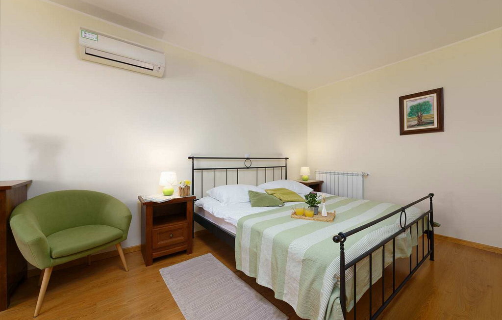 Villa pour 14 personnes avec une surface habitable de 220 m² se compose de : La première unité d'habitation (Olive) sur deux niveaux. Au rez-de-chaussée se trouve la salle de séjour avec une cuisine équipée avec une table à manger et un canapé-lit pour deux personnes, une chambre double avec un lit double et une douche/WC. À l'étage supérieur se trouvent deux chambres à coucher avec des lits pour deux personnes, l'une avec douche/WC, l'autre avec salle de bain/WC avec jacuzzi.