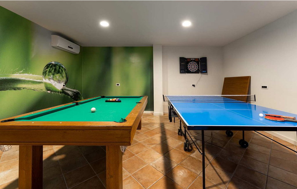 L'espace extérieur est parfait pour les repas et les divertissements et dispose d'une salle à manger couverte avec télévision, d'une cheminée pour barbecue et d'une grande aire de jeux pour les enfants. À l'intérieur, une table de billard et une table de ping-pong permettent aux hôtes de rester actifs.