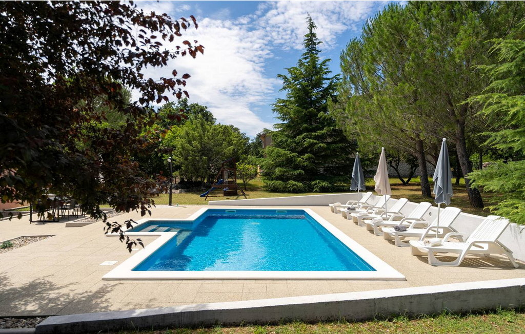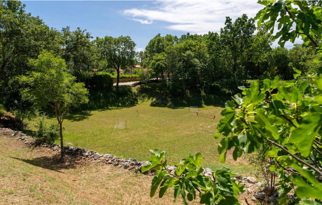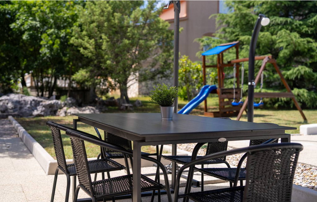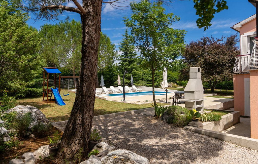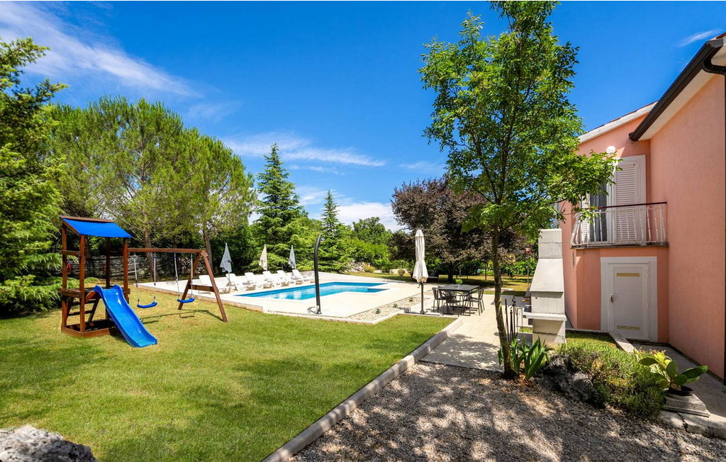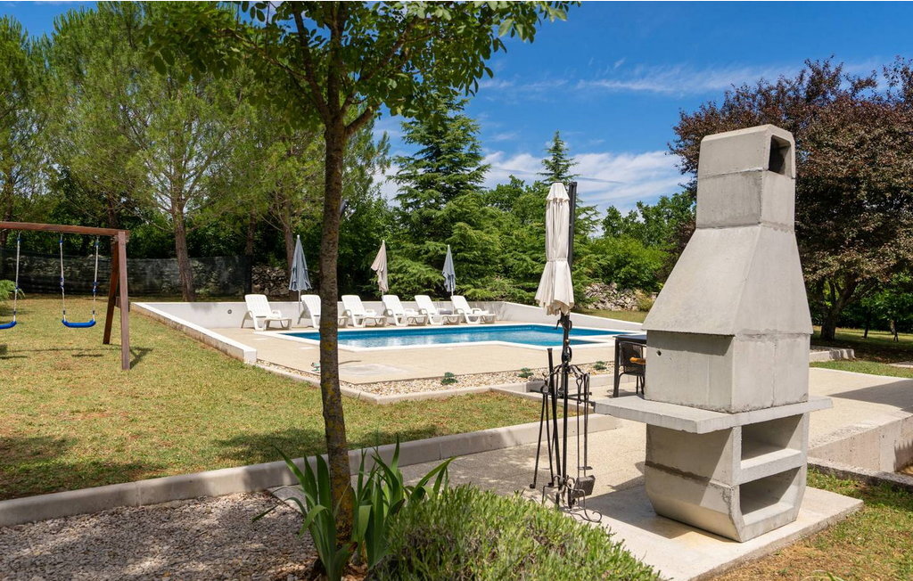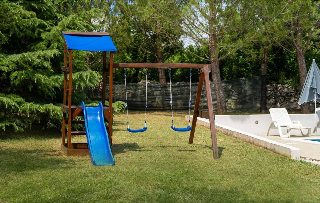 La maison est située sur un grand terrain où les hôtes ont à leur disposition une piscine, des chaises longues pour prendre des bains de soleil, des balançoires pour les enfants, des sièges, un foyer, plusieurs places de parking et une pelouse avec un filet de badminton et des petits buts de football pour se détendre et jouer avec les enfants.