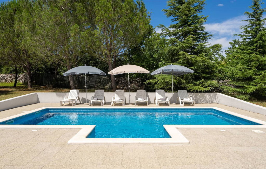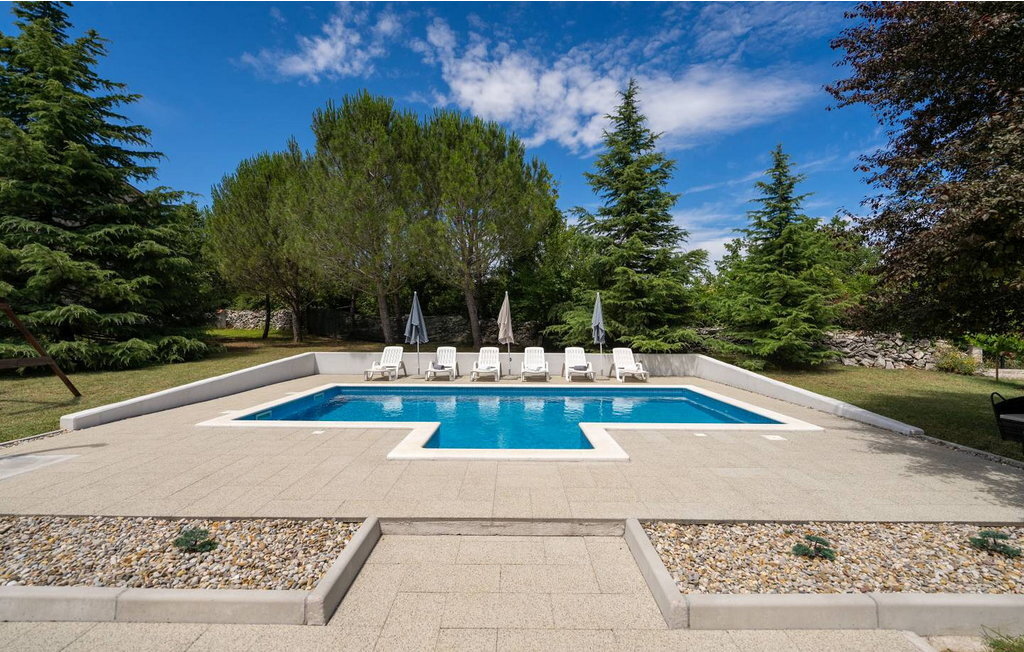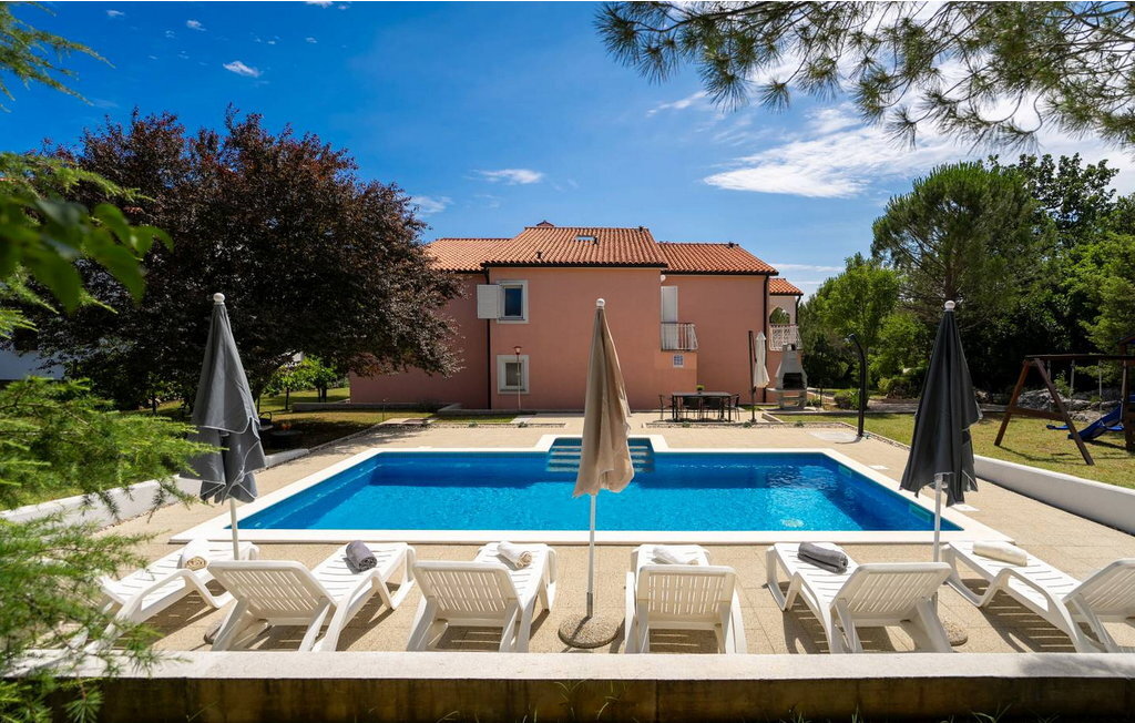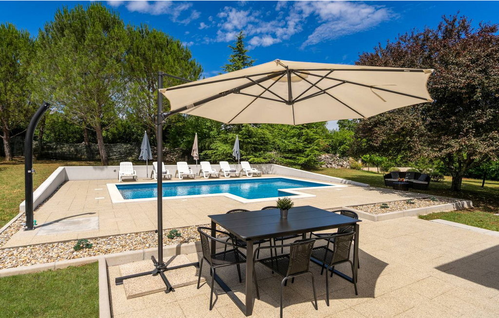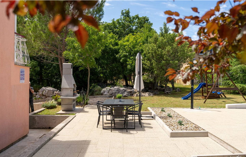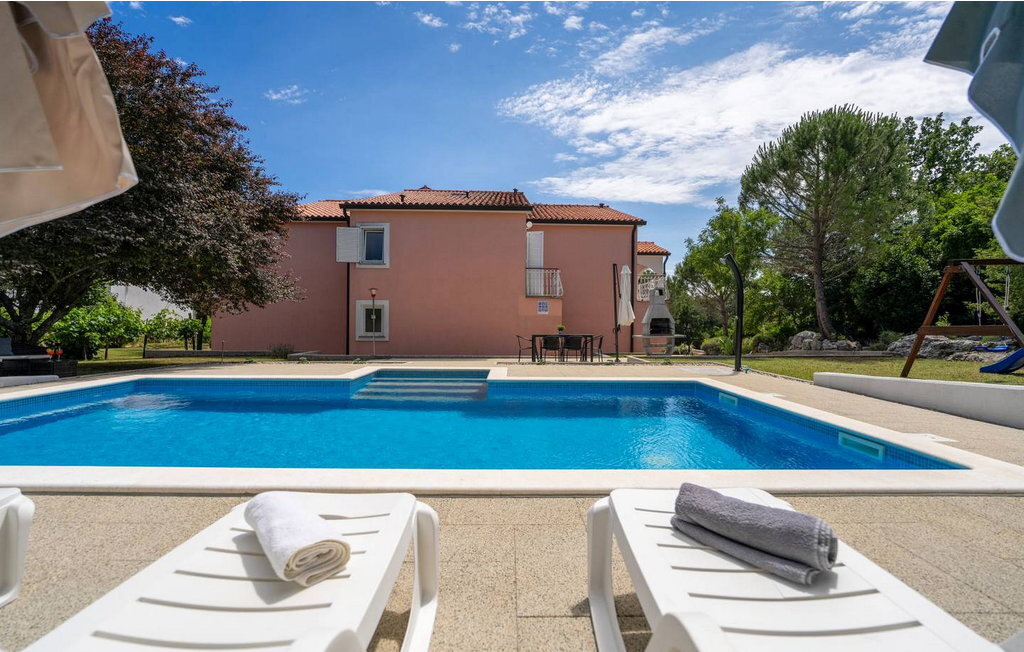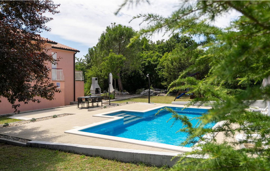 La maison est située sur un grand terrain où les hôtes ont à leur disposition une piscine, des chaises longues pour prendre des bains de soleil, des balançoires pour les enfants, des sièges, un foyer, plusieurs places de parking et une pelouse avec un filet de badminton et des petits buts de football pour se détendre et jouer avec les enfants.