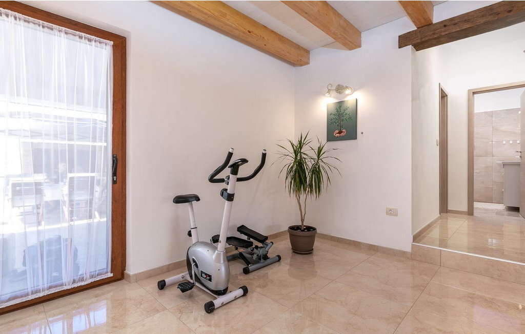 L'unité d'habitation au rez-de-chaussée de la maison pour 6 personnes de 105 m² se compose d'un salon climatisé avec un canapé-lit pour deux personnes, d'une salle à manger d'où partent des escaliers menant au grenier où se trouve une chambre avec deux lits simples, une cuisine entièrement équipée, un coin avec un stepper et un vélo d'appartement, une chambre avec un lit double, une chambre avec deux lits simples, une douche/WC et des toilettes séparées.