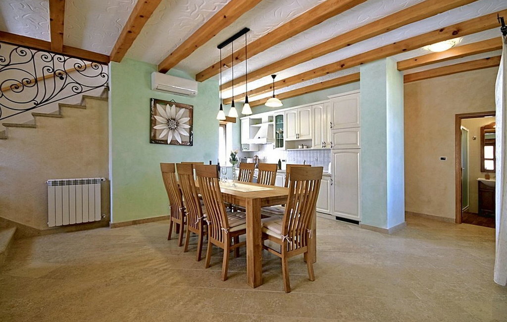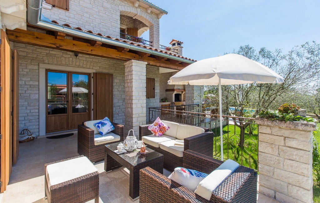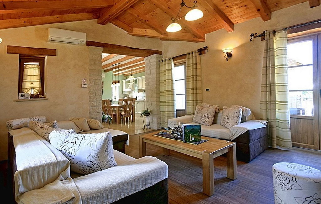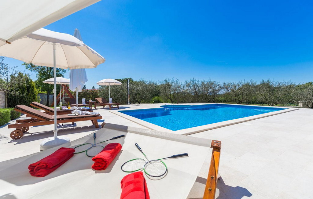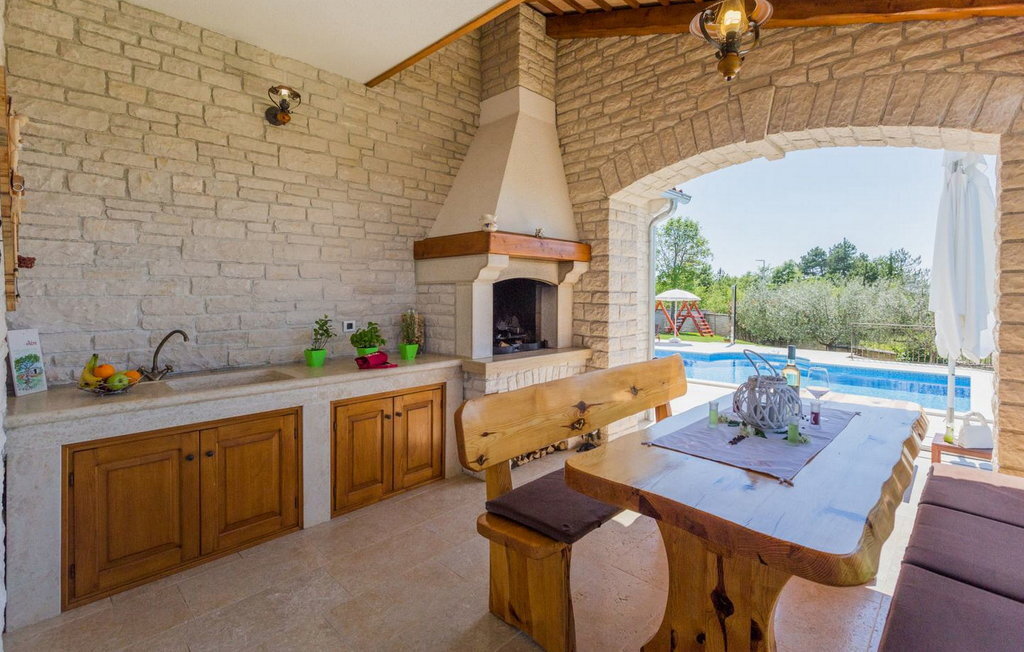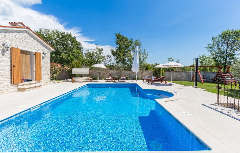 La maison a été construite en 2012 et est équipée de meubles neufs et rustiques. Elle se trouve sur son propre terrain clos de 1.000 m² et offre à ses hôtes une piscine extérieure chauffée de 45 m² avec hydromassage et chaises longues, un jardin bien entretenu avec barbecue, deux terrasses couvertes avec salon et un parking privé pour trois voitures.