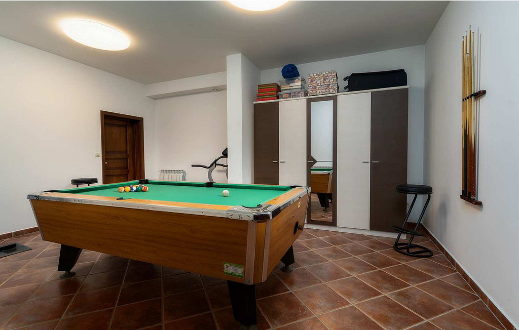 Maison de vacances Kadore pour 6 personnes avec une surface totale de 280 m² répartie sur trois étages entièrement climatisés. Au rez-de-chaussée, il y a un salon avec accès à la piscine, une cuisine entièrement équipée avec table à manger, deux chambres à coucher avec lit double et une salle de bain. Au premier étage, il y a une terrasse avec des meubles de salon, une chambre à coucher avec un lit double et une salle de bain privée. Au sous-sol, les hôtes ont à leur disposition une taverne avec cuisine et une pièce supplémentaire avec table de billard et équipement de loisirs, ainsi qu'une douche/WC.