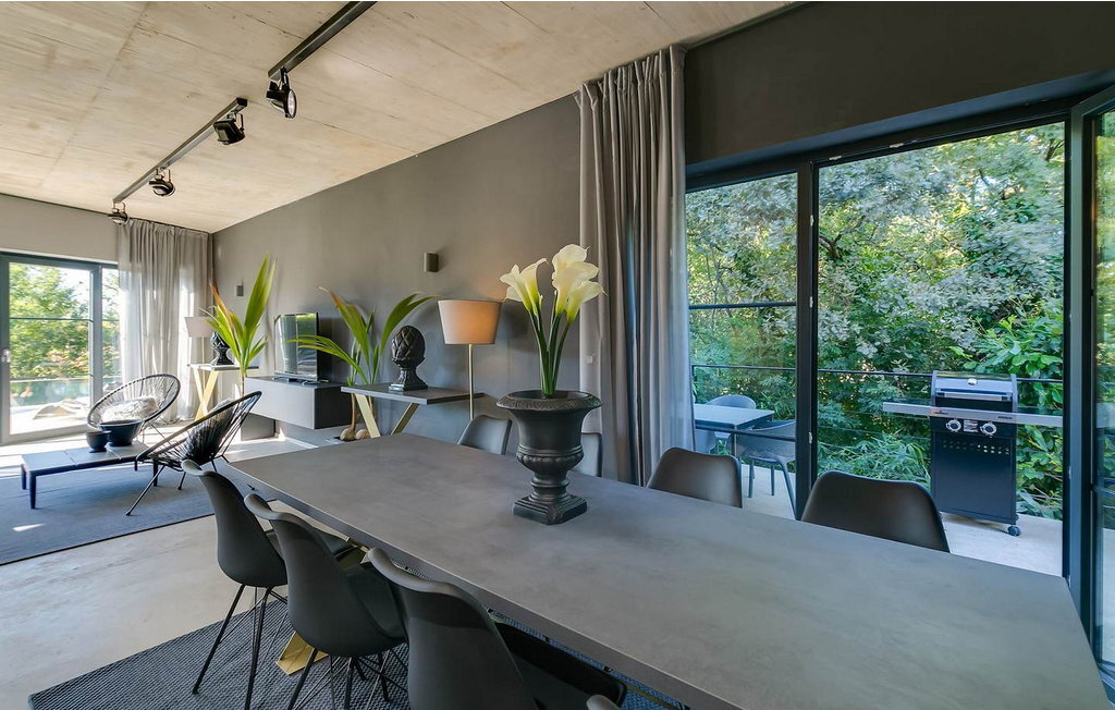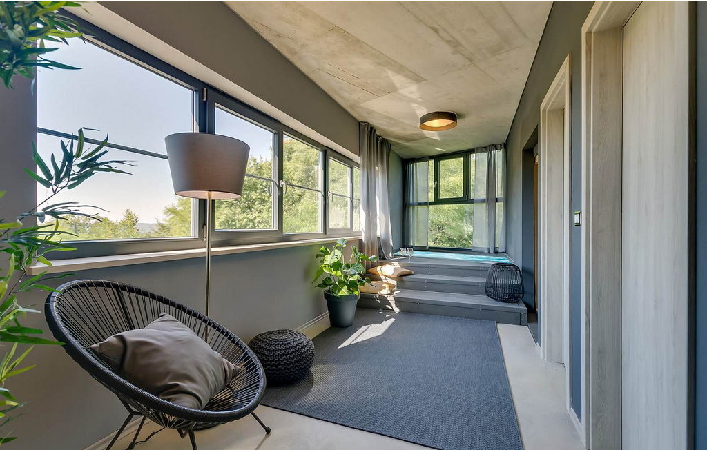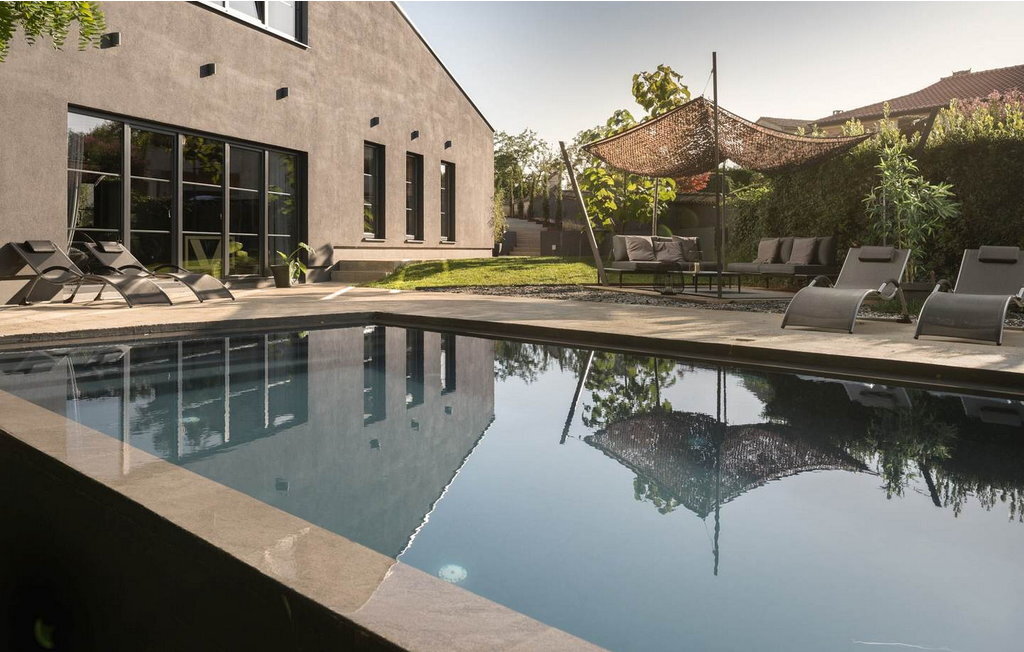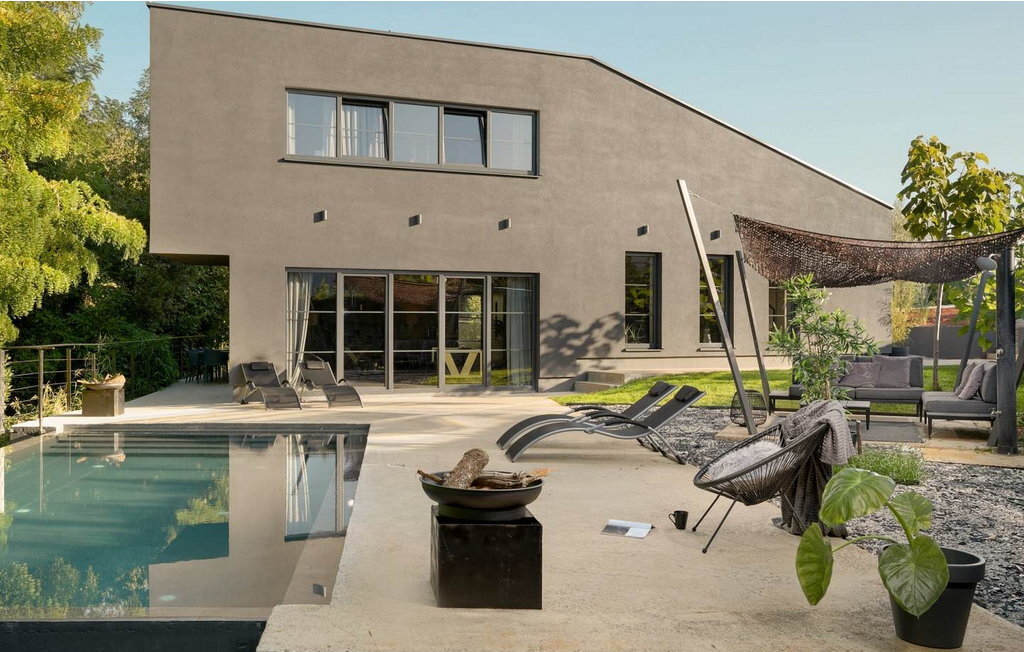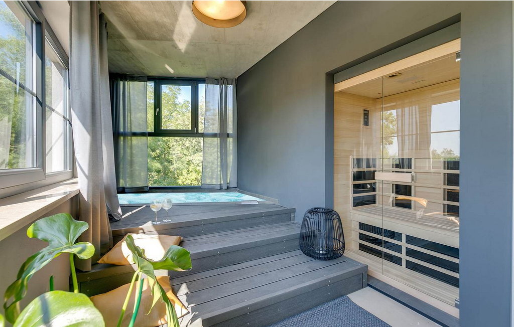 Avec son design particulier, sa piscine à débordement vert foncé, son emplacement calme à la périphérie du village et son sauna et jacuzzi avec vue sur la piscine, elle se distingue parmi les autres maisons de vacances de la région.