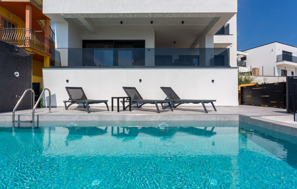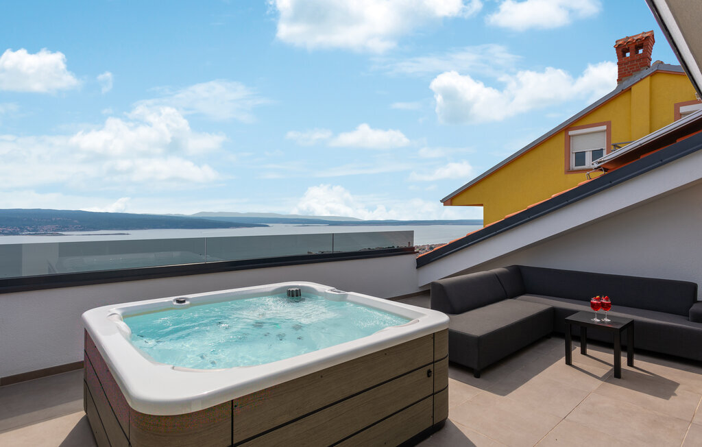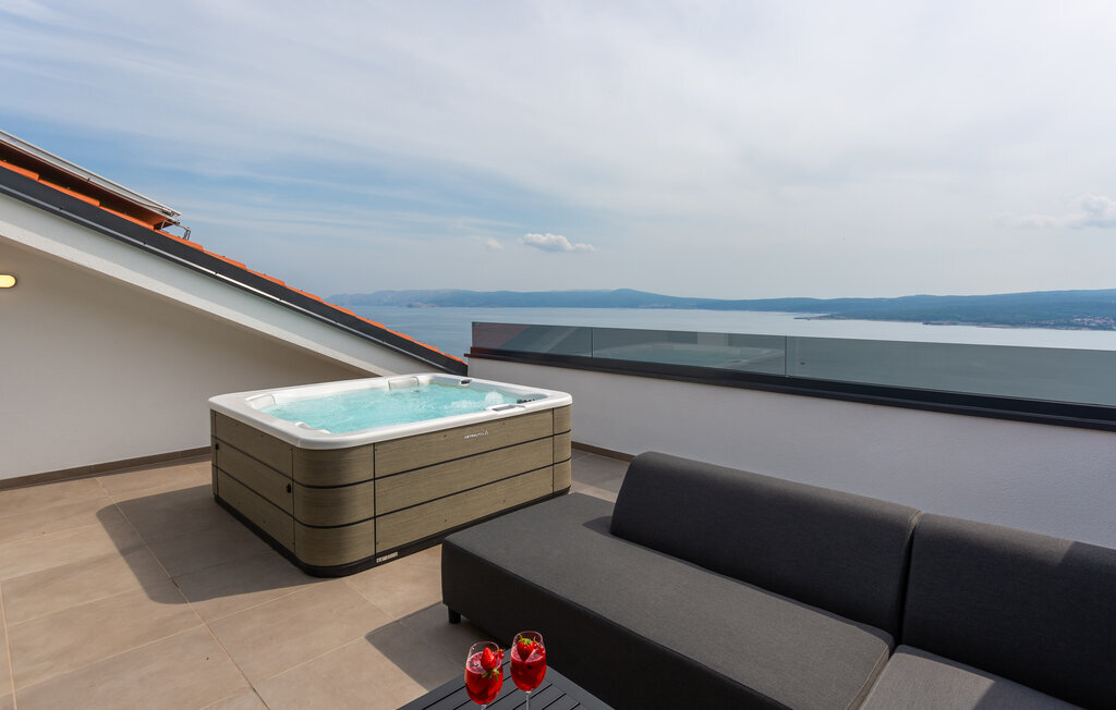 Bien-être à l'extérieur : Location de vacances disposant de chaises-longues et d'un ou plusieurs équipements tels que piscine extérieure, jacuzzi extérieur, lit à baldaquin de jardin etc...