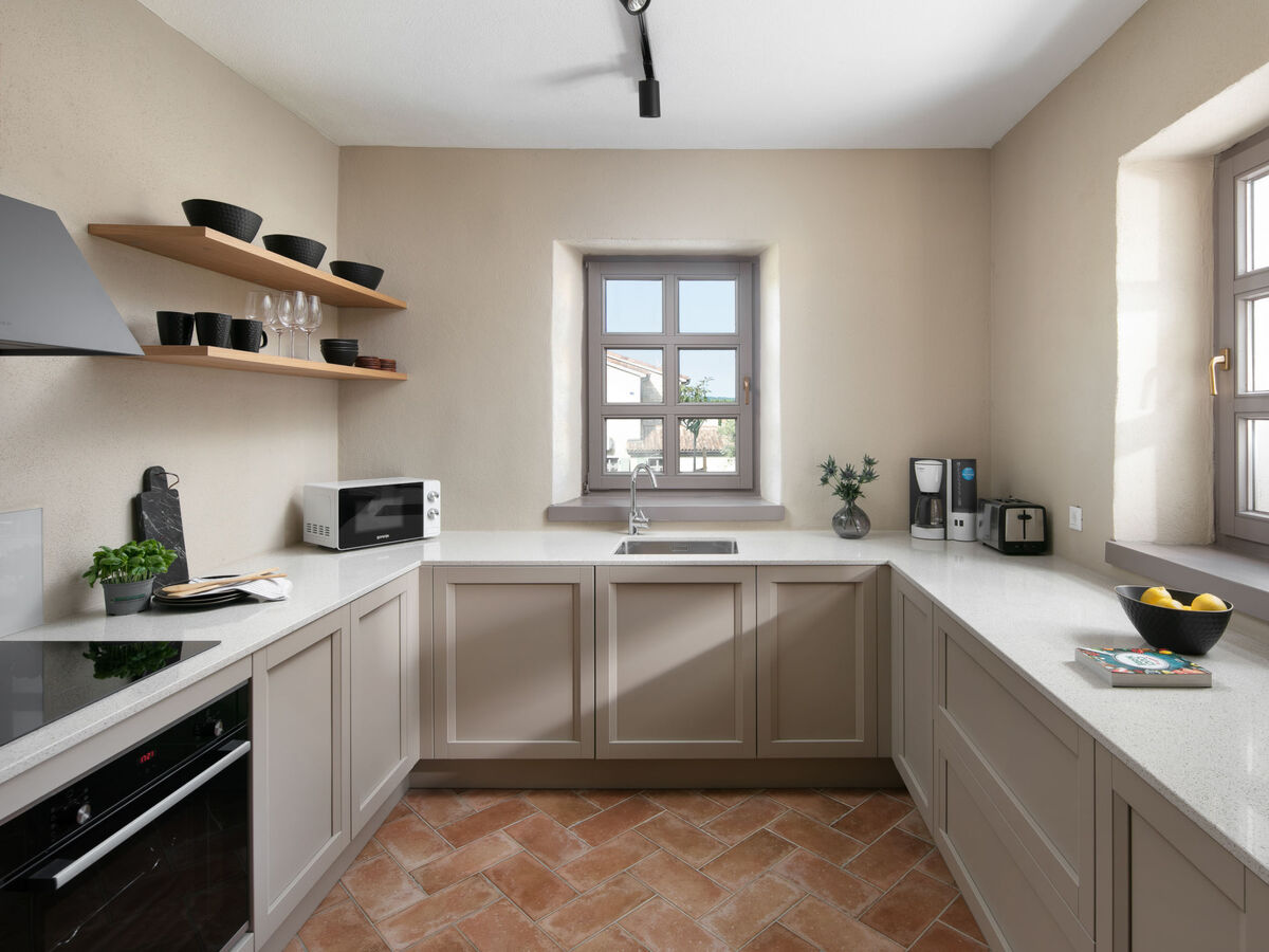 Cuisine ouverte (four, lave-vaisselle, 4 plaques à induction, bouilloire électrique, micro-ondes, congélateur, cafetière électrique).