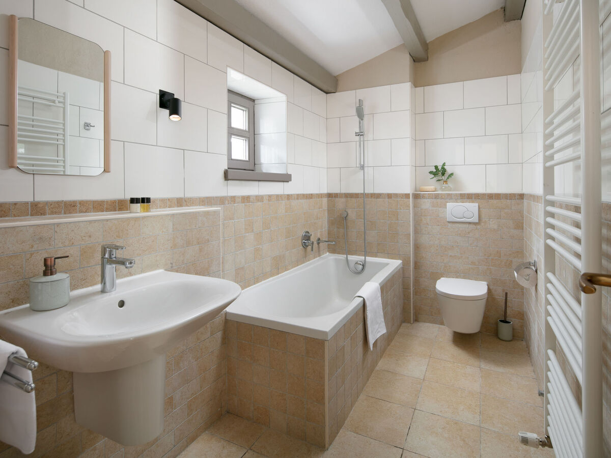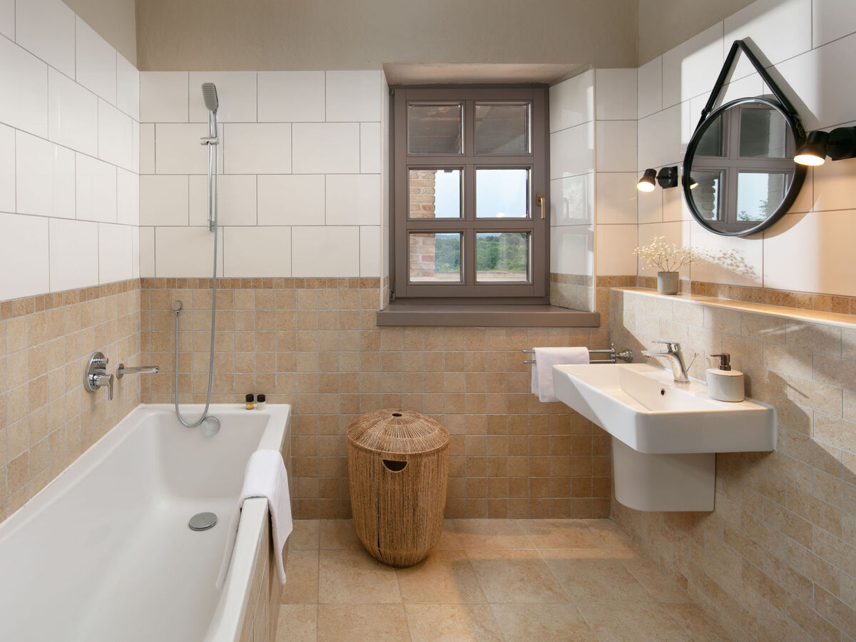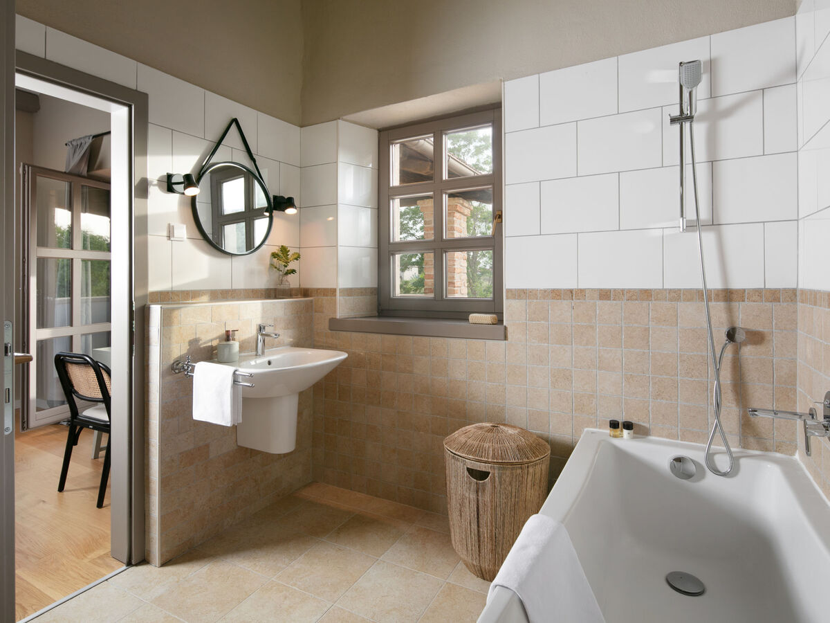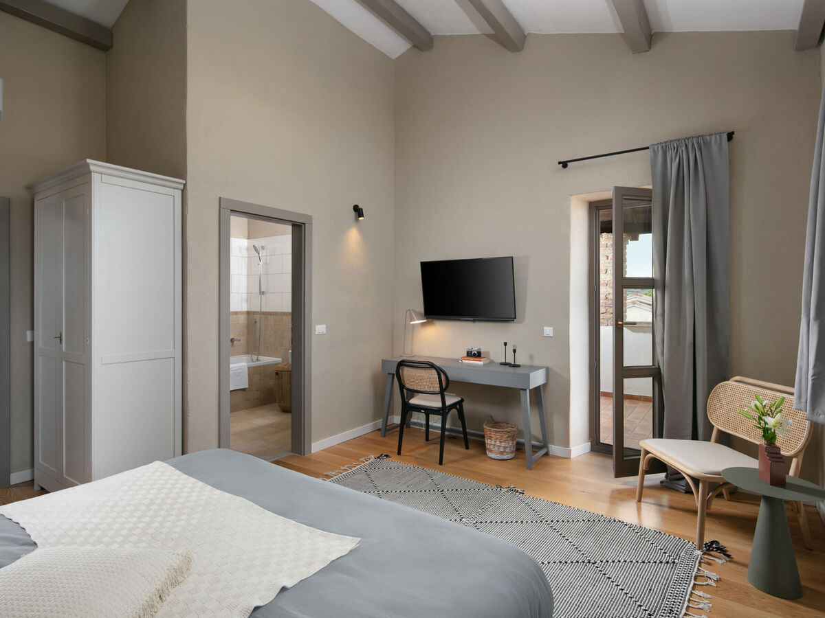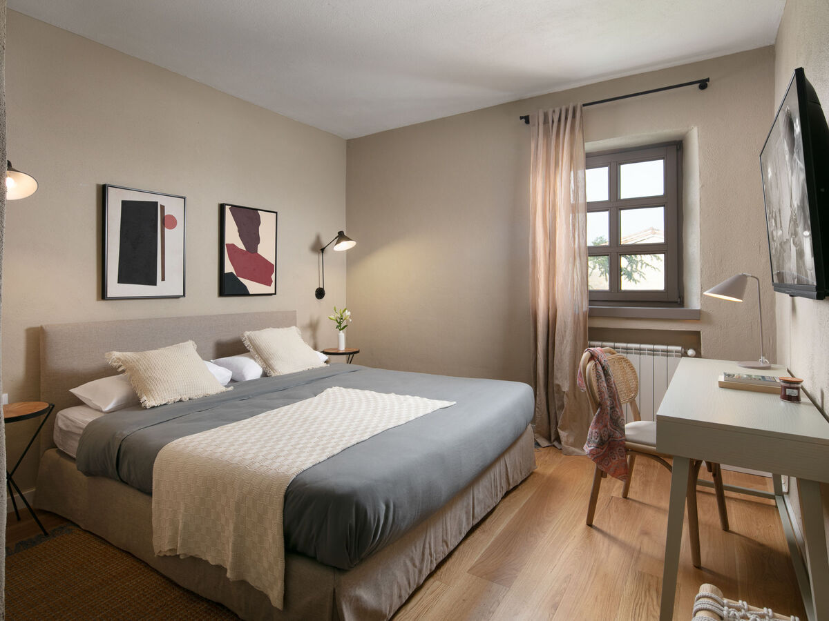 1 chambre avec 1 lit double (2 x 90 cm, longueur 200 cm), bain/WC et TV (satellite) (écran plat), air-conditionné.
