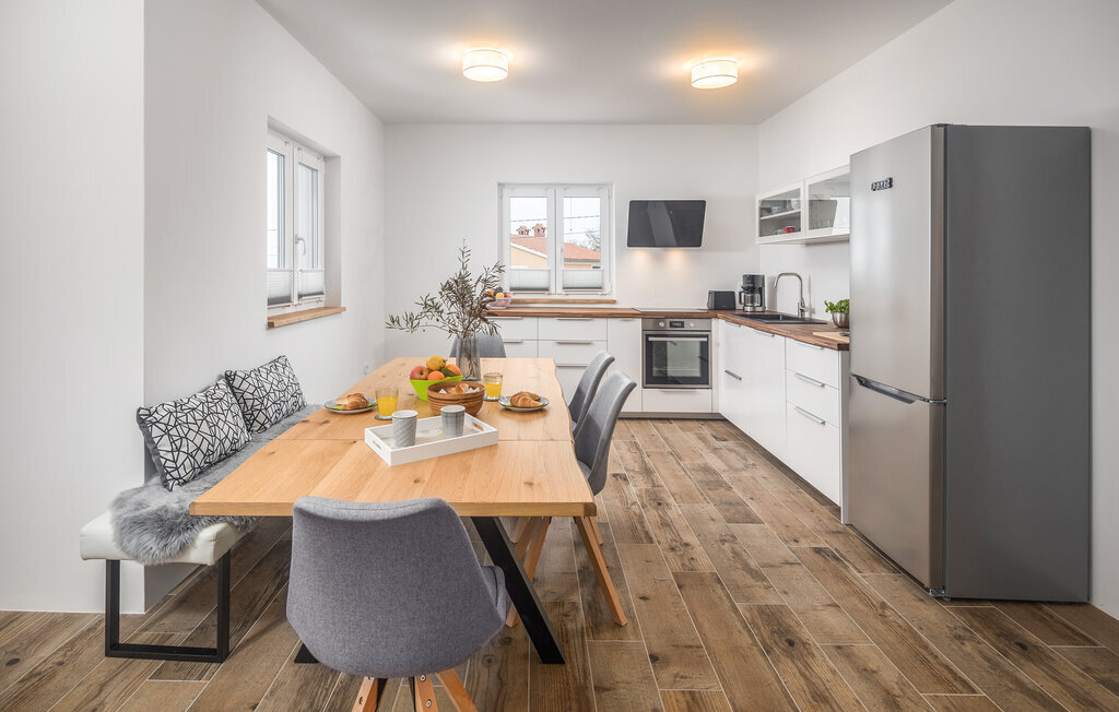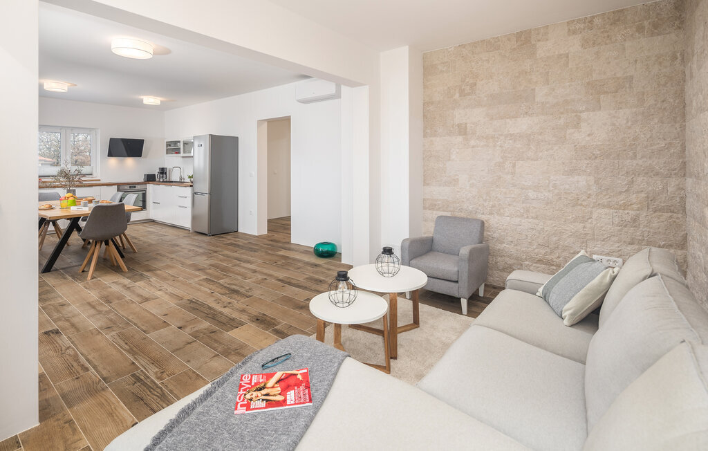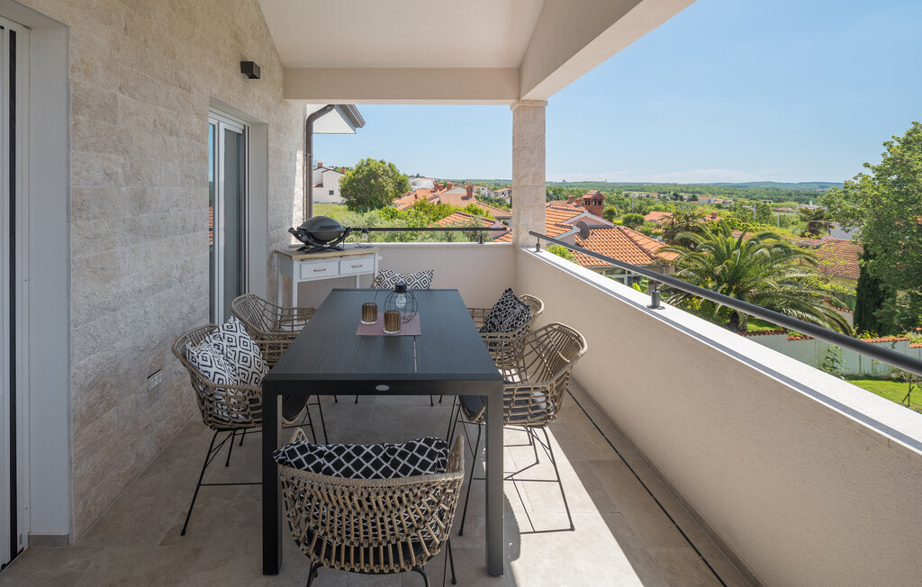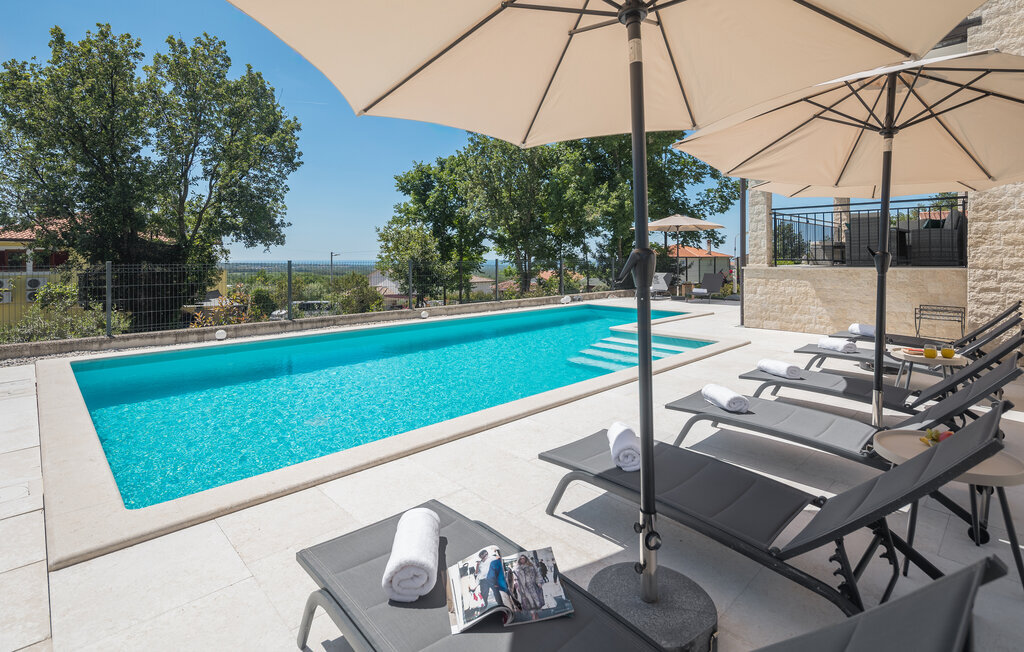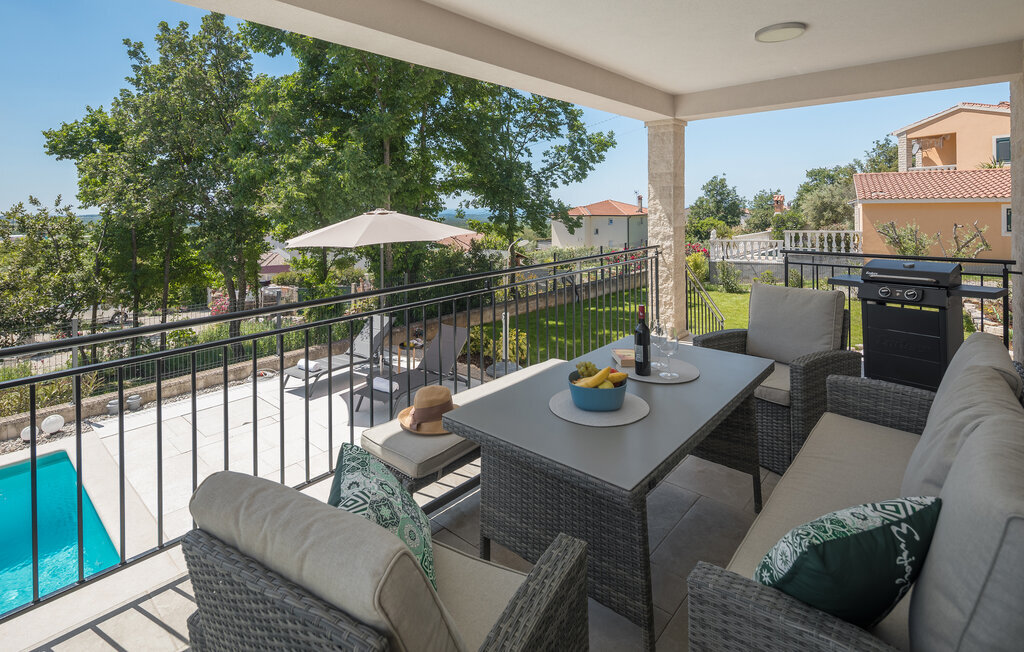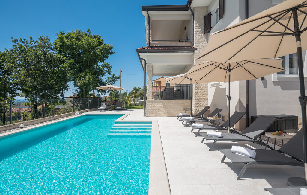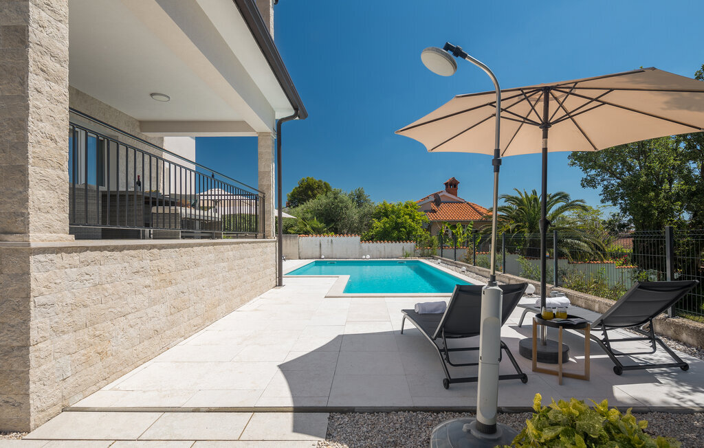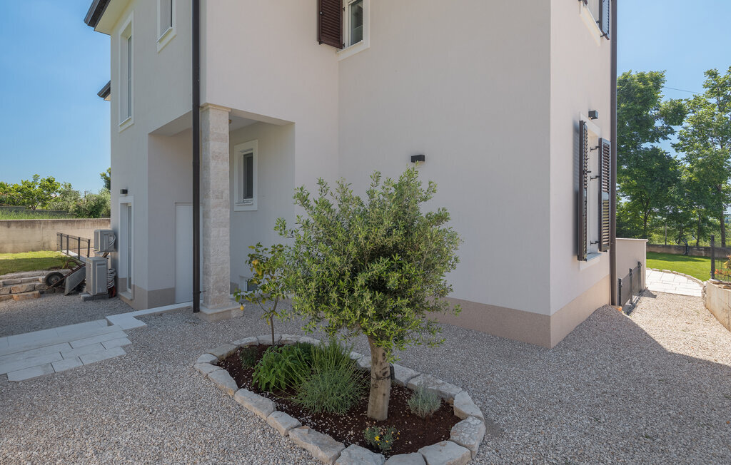 Près du centre touristique de Porec, cette villa lumineuse vous accueille et vous fera passer des vacances heureuses. La répartition sur deux étages est idéale pour deux familles qui souhaitent voyager ensemble tout en préservant leur intimité. Les murs en pierre apparente, les carreaux en bois et l'aménagement élégant vous invitent à vous sentir à l'aise et à vous imprégner de l'expérience de vie. Vous pourrez vous reposer dans les pièces à vivre, cuisiner ensemble et vous détendre avec un verre de vin sur les balcons. De là, vous pourrez également admirer la mer et le paysage et planifier mentalement vos prochaines activités. Réjouissez-vous également de passer du temps dans le jardin et de vous baigner dans la piscine d'eau salée tout en écoutant votre podcast préféré sur le pont soleil.