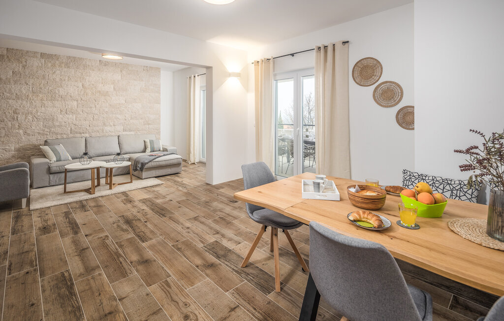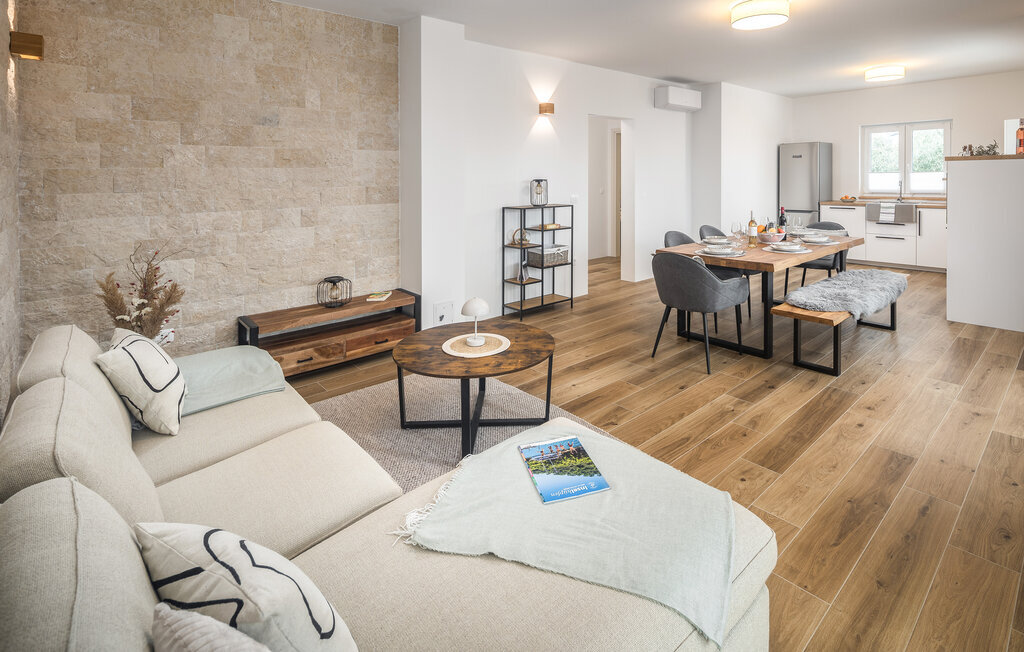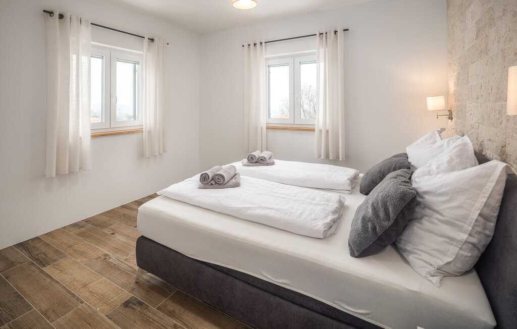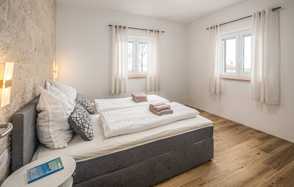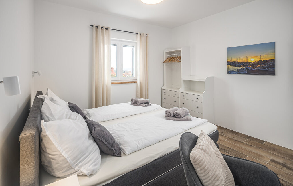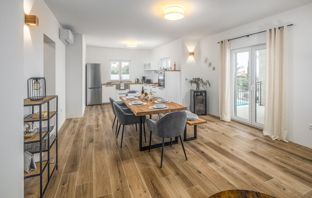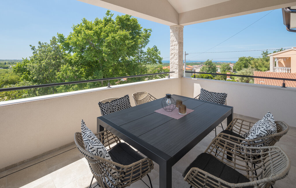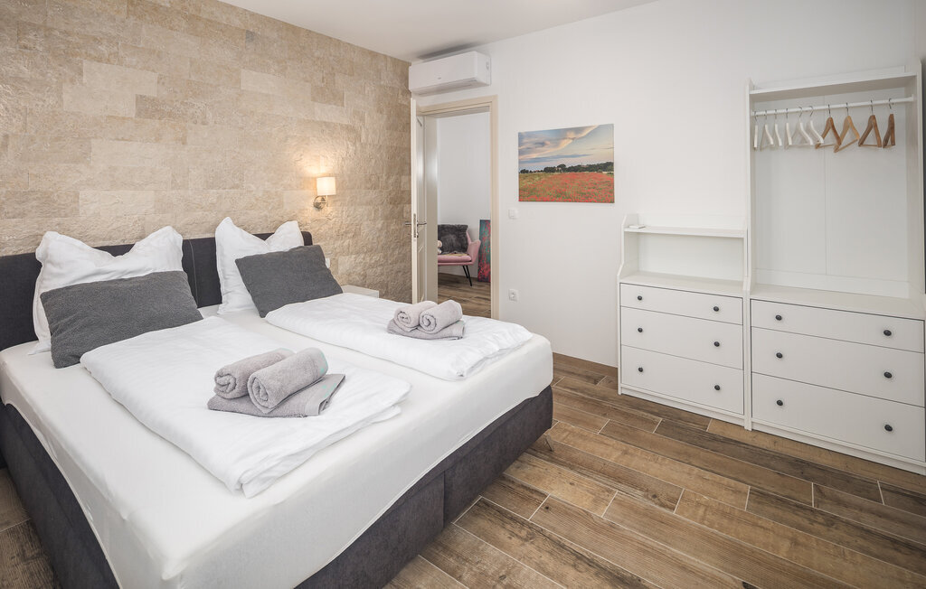 Près du centre touristique de Porec, cette villa lumineuse vous accueille et vous fera passer des vacances heureuses. La répartition sur deux étages est idéale pour deux familles qui souhaitent voyager ensemble tout en préservant leur intimité. Les murs en pierre apparente, les carreaux en bois et l'aménagement élégant vous invitent à vous sentir à l'aise et à vous imprégner de l'expérience de vie. Vous pourrez vous reposer dans les pièces à vivre, cuisiner ensemble et vous détendre avec un verre de vin sur les balcons. De là, vous pourrez également admirer la mer et le paysage et planifier mentalement vos prochaines activités. Réjouissez-vous également de passer du temps dans le jardin et de vous baigner dans la piscine d'eau salée tout en écoutant votre podcast préféré sur le pont soleil.