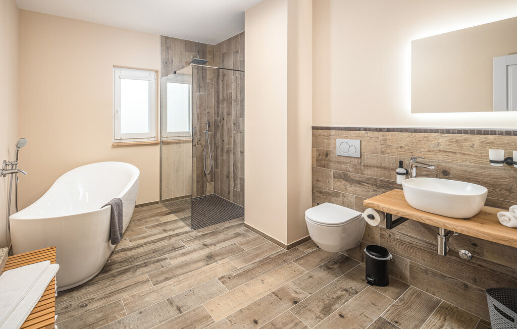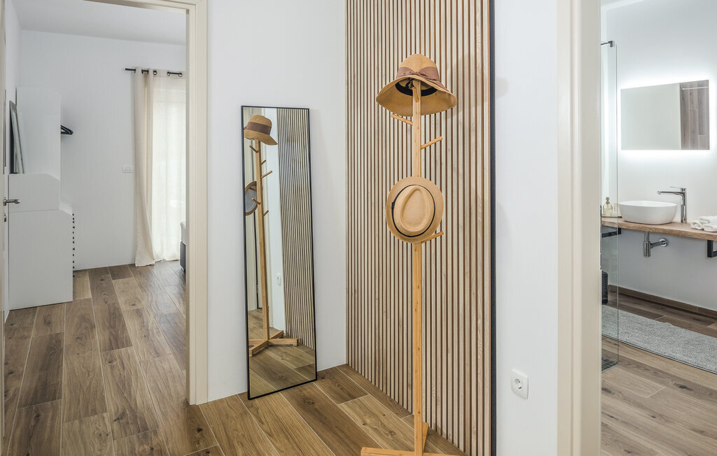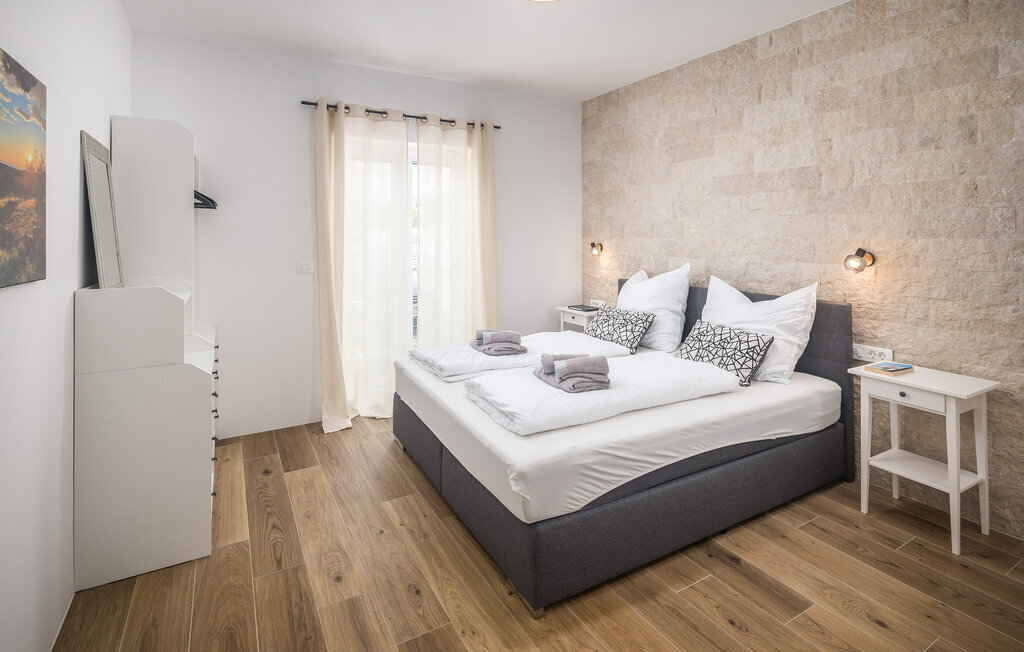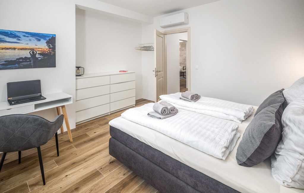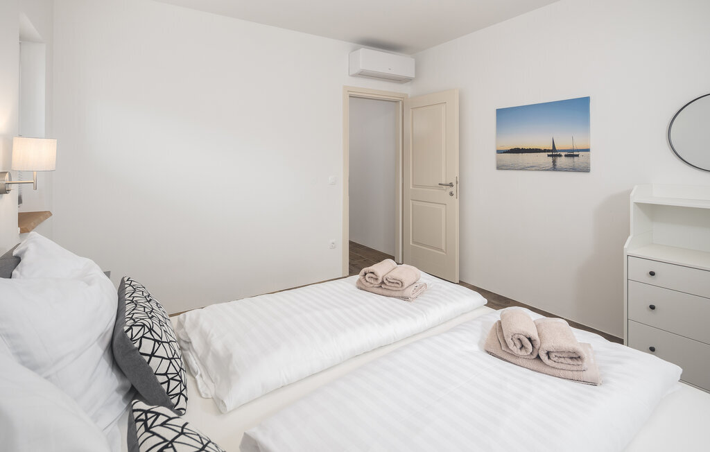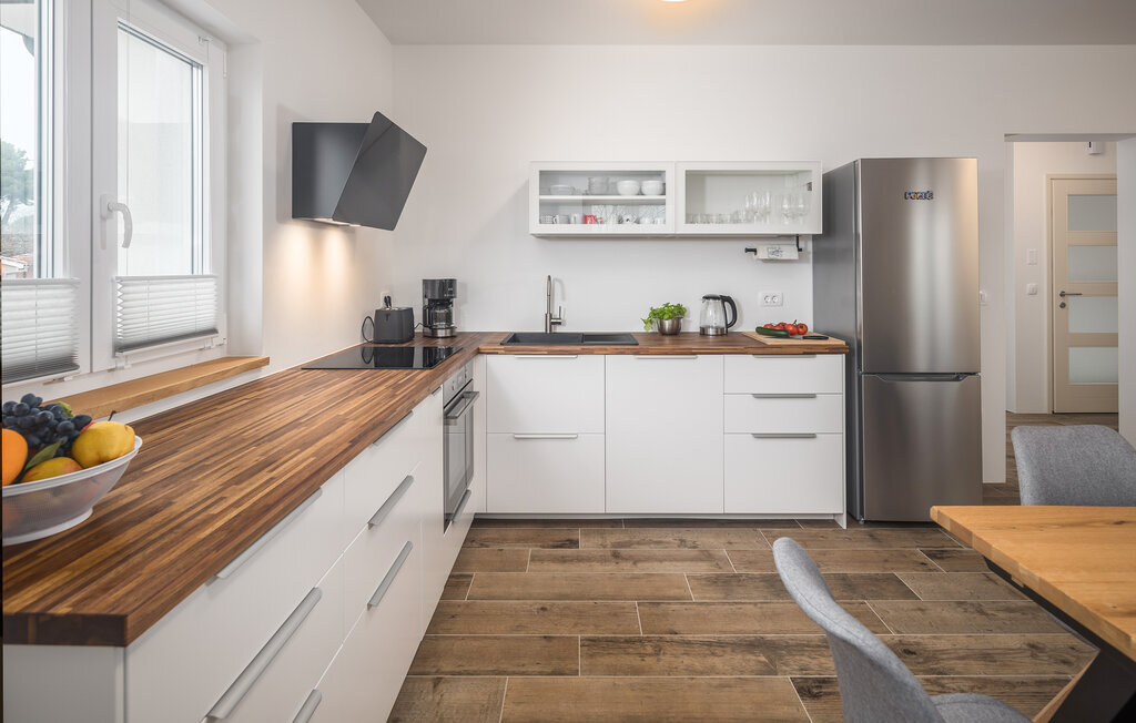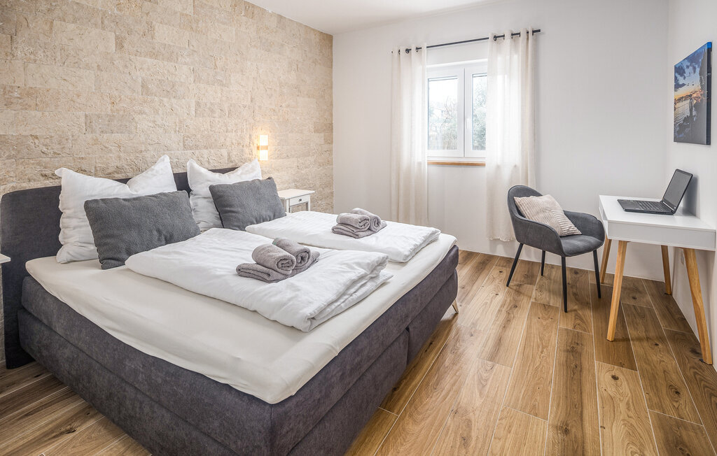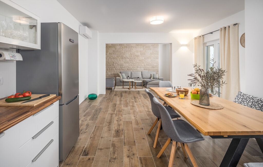 Près du centre touristique de Porec, cette villa lumineuse vous accueille et vous fera passer des vacances heureuses. La répartition sur deux étages est idéale pour deux familles qui souhaitent voyager ensemble tout en préservant leur intimité. Les murs en pierre apparente, les carreaux en bois et l'aménagement élégant vous invitent à vous sentir à l'aise et à vous imprégner de l'expérience de vie. Vous pourrez vous reposer dans les pièces à vivre, cuisiner ensemble et vous détendre avec un verre de vin sur les balcons. De là, vous pourrez également admirer la mer et le paysage et planifier mentalement vos prochaines activités. Réjouissez-vous également de passer du temps dans le jardin et de vous baigner dans la piscine d'eau salée tout en écoutant votre podcast préféré sur le pont soleil.