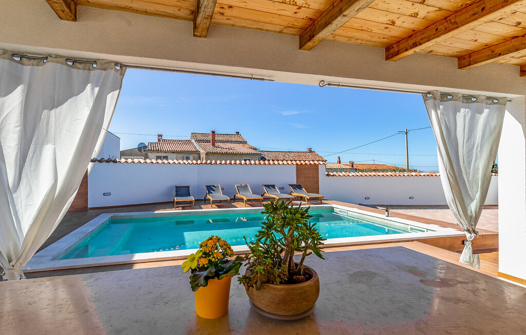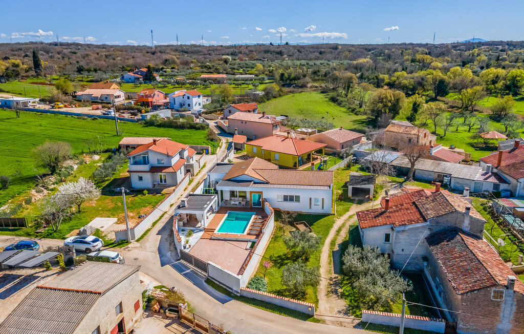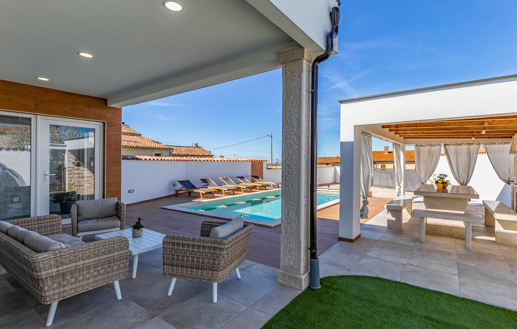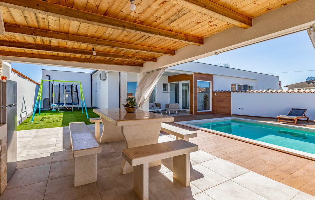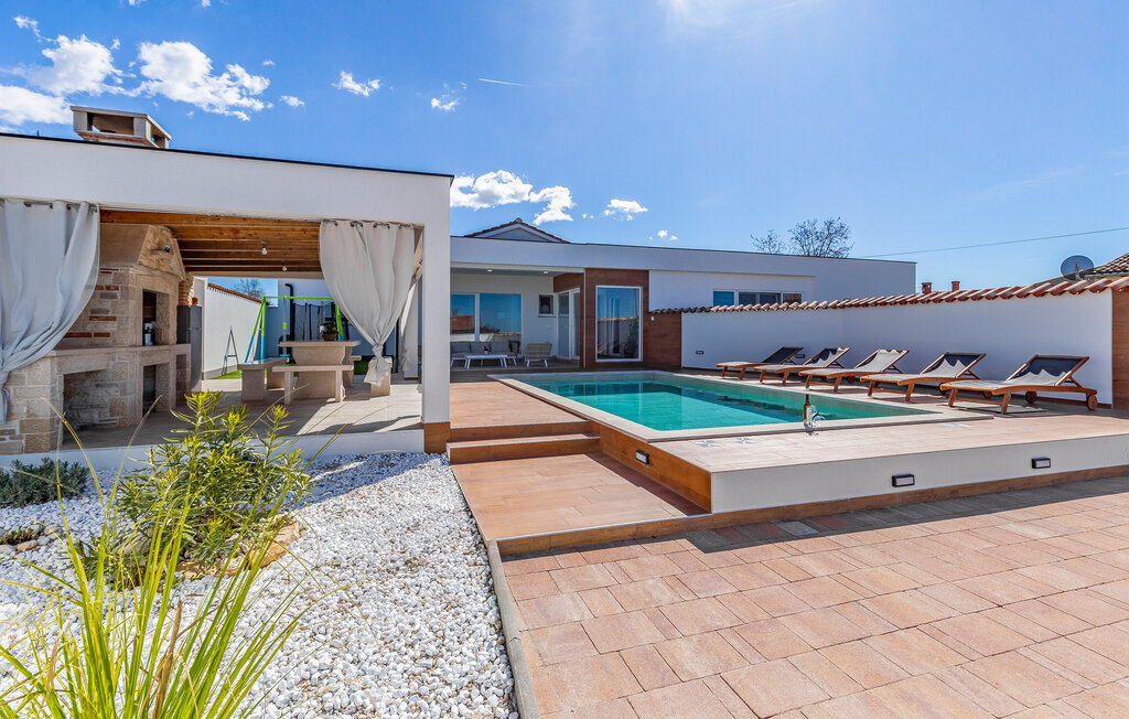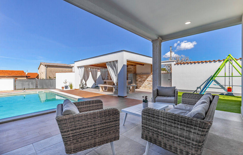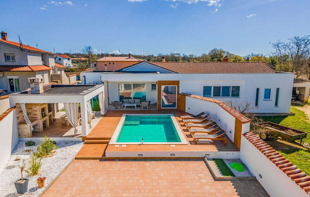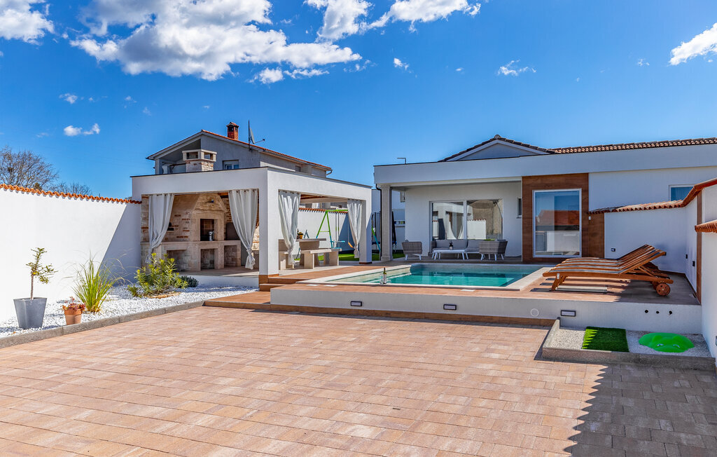 Située à quelques kilomètres seulement au nord de Pula, cette élégante maison de vacances vous accueille pour de merveilleuses vacances en Istrie. Profitez de l'ambiance lumineuse pendant que vous préparez le petit déjeuner familial dans la cuisine ouverte et que vous discutez ensuite avec animation des projets de la journée autour de la table à manger. Plus tard dans la journée, vous pouvez cuisiner ensemble dans la cuisine, en utilisant peut-être des ingrédients régionaux. L'espace extérieur offre de nombreuses possibilités avec différents espaces pour se détendre et jouer. Vous pouvez faire un barbecue sous la terrasse couverte, tandis que les enfants peuvent s'amuser sur l'aire de jeux à côté. Plongez dans la piscine, qui promet un rafraîchissement et des plaisirs aquatiques.